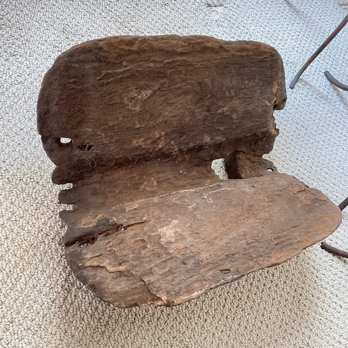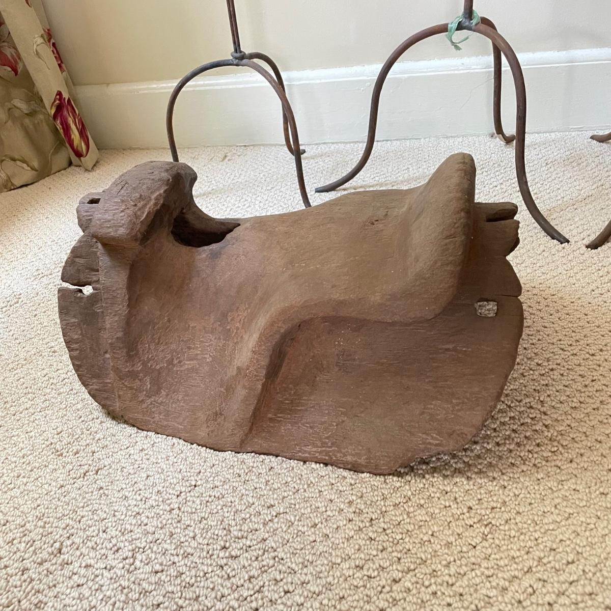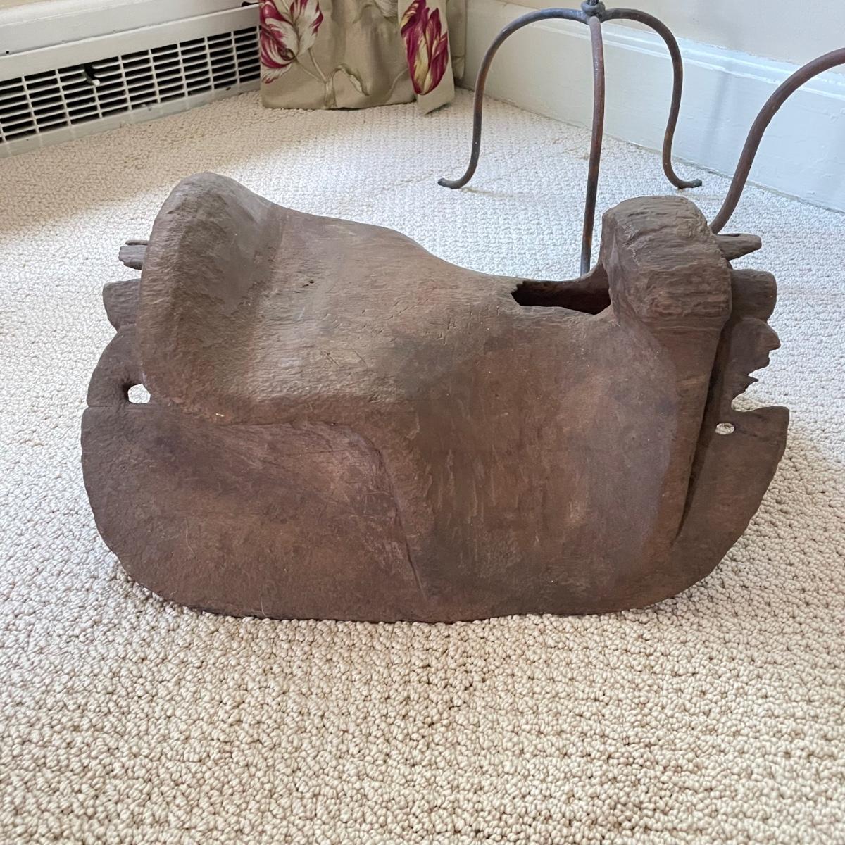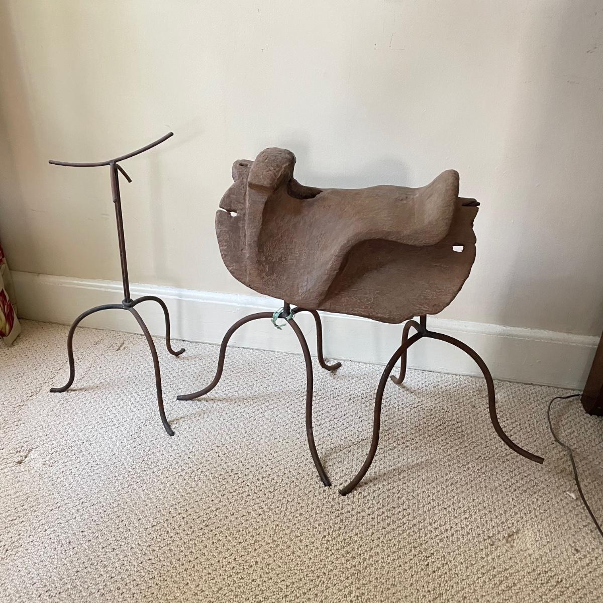 Lot features what appears to be a hand carved wooden saddle and three iron saddle stands. Two stands seem like a set; the third is taller and more curved than the set. The wooden saddle is smooth to the touch on the top, the underside isn’t as smooth, but it doesn’t have much splintering at all. Saddle measures approximately 13” x 17” x 8”H. The tallest stand measures approximately 10” x 12” x 22.5”. See images. Shipping available. Shipping can be costly. We suggest contacting our preferred local shipping provider, Postage Express, with dimensions and getting an estimate before bidding: (828) 670-5501 or postageexpress@yahoo.com.