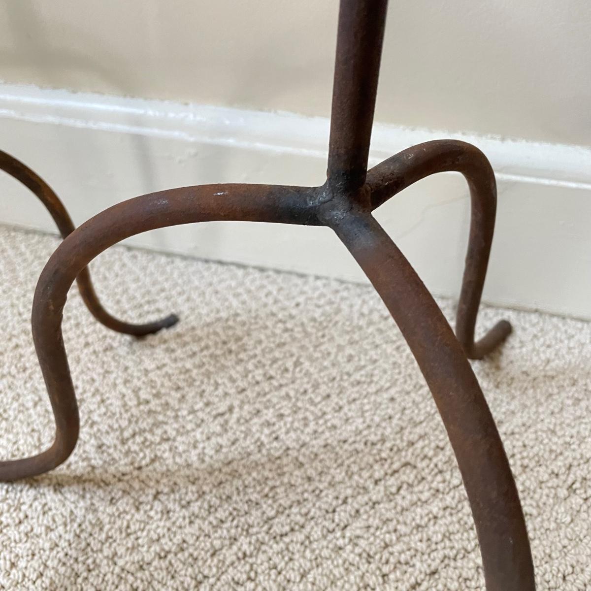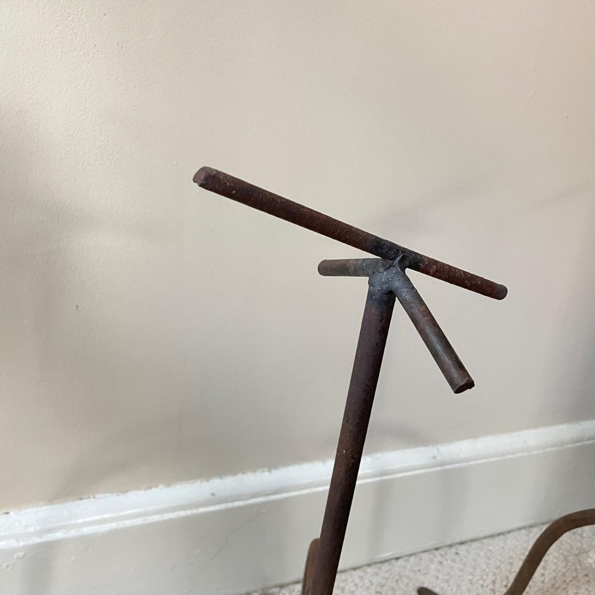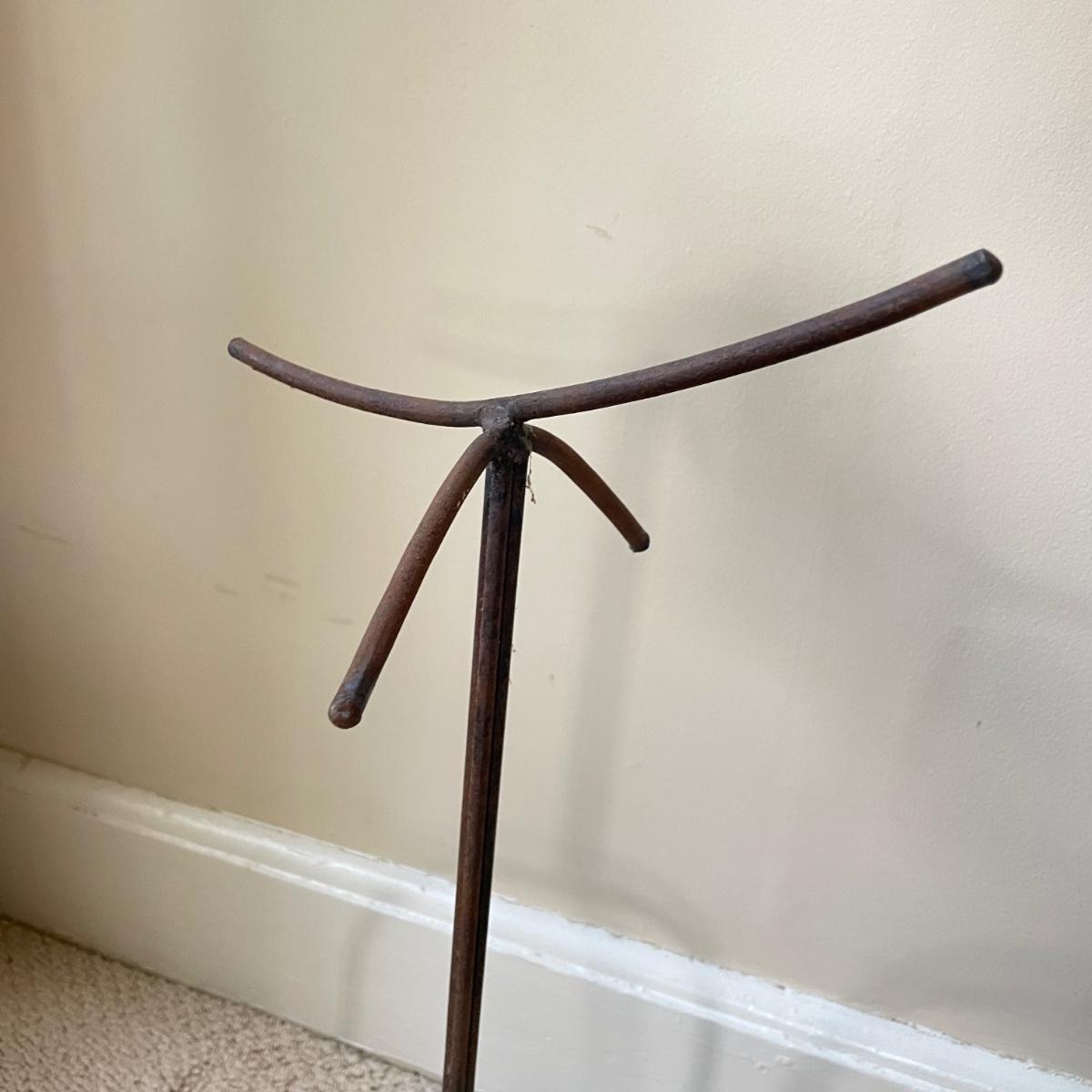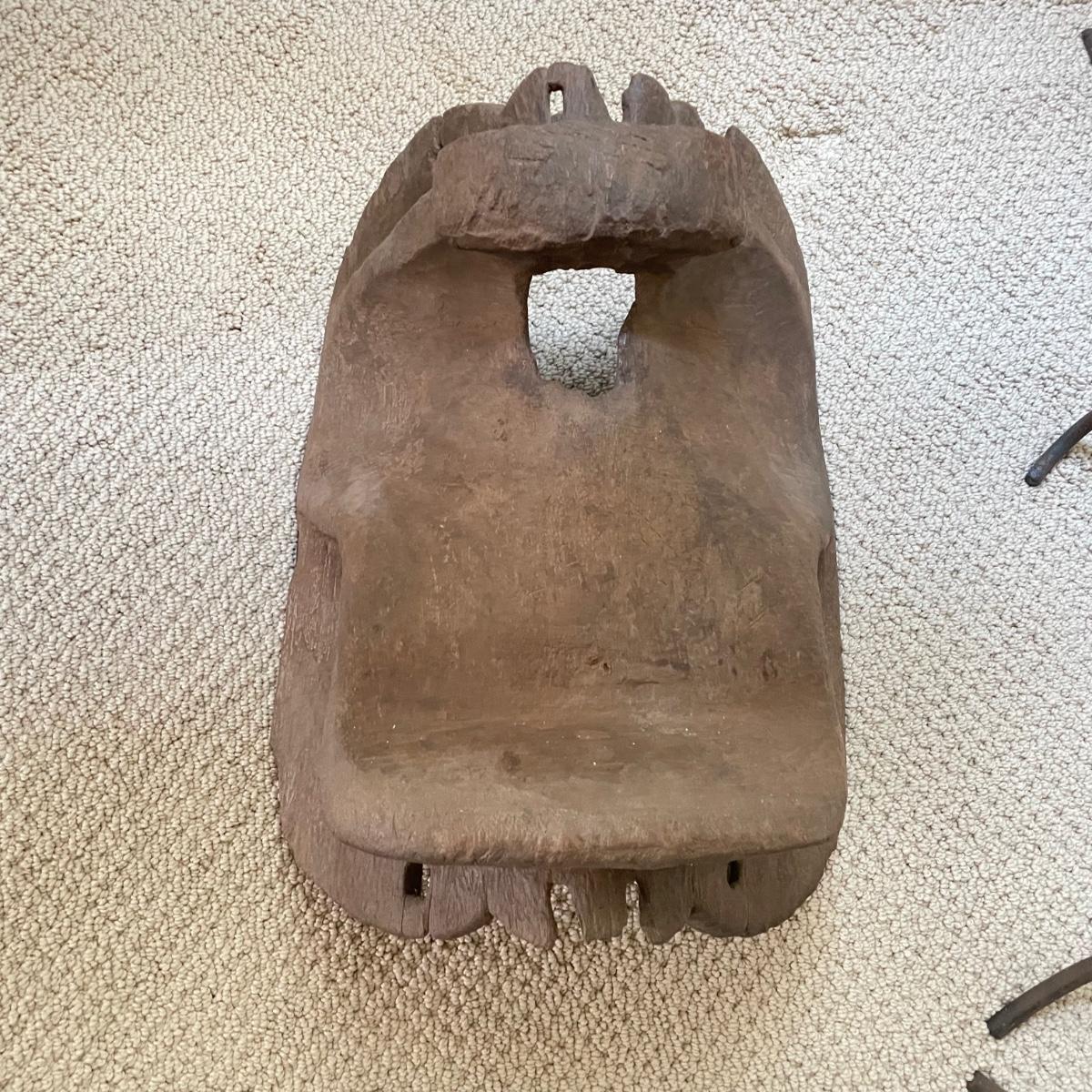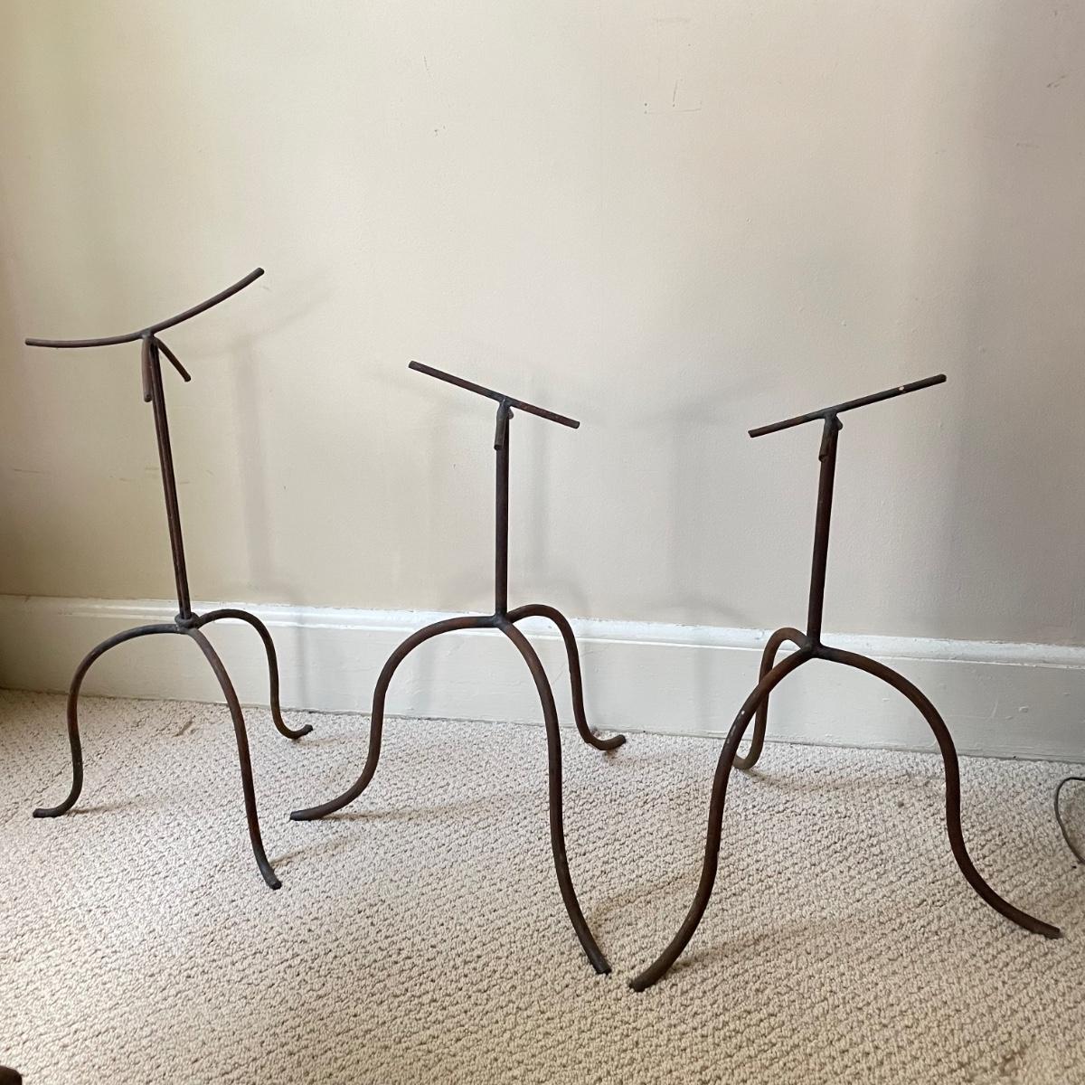 Lot features what appears to be a hand carved wooden saddle and three iron saddle stands. Two stands seem like a set; the third is taller and more curved than the set. The wooden saddle is smooth to the touch on the top, the underside isn’t as smooth, but it doesn’t have much splintering at all. Saddle measures approximately 13” x 17” x 8”H. The tallest stand measures approximately 10” x 12” x 22.5”. See images. Shipping available. Shipping can be costly. We suggest contacting our preferred local shipping provider, Postage Express, with dimensions and getting an estimate before bidding: (828) 670-5501 or postageexpress@yahoo.com.