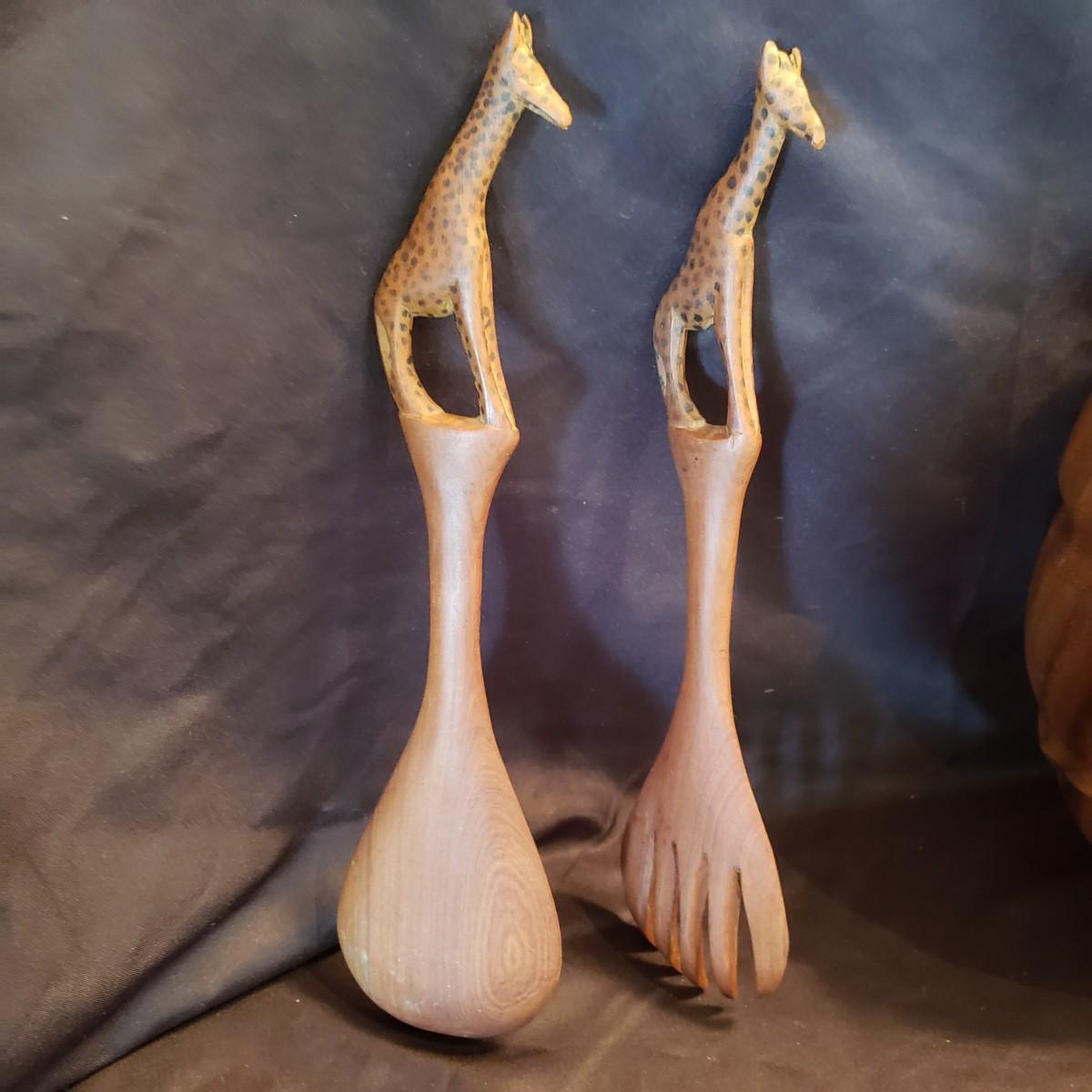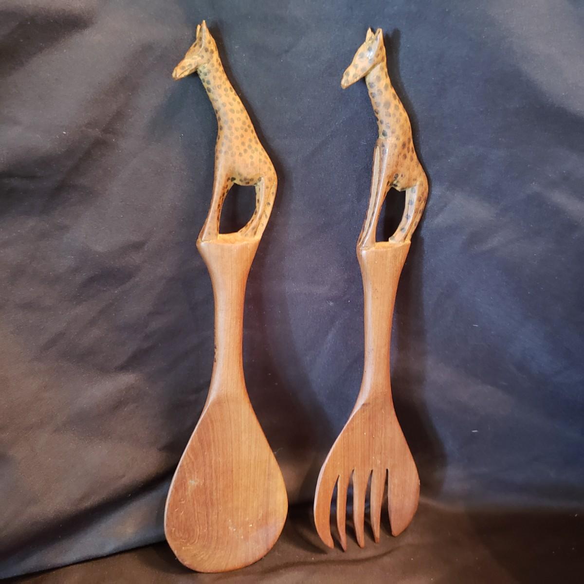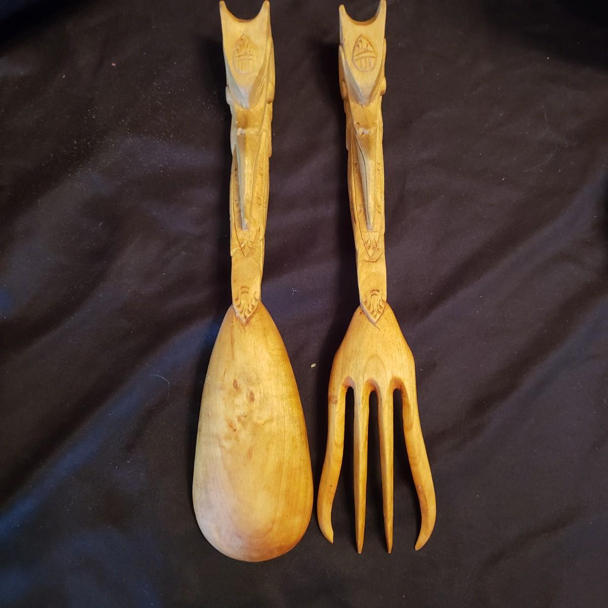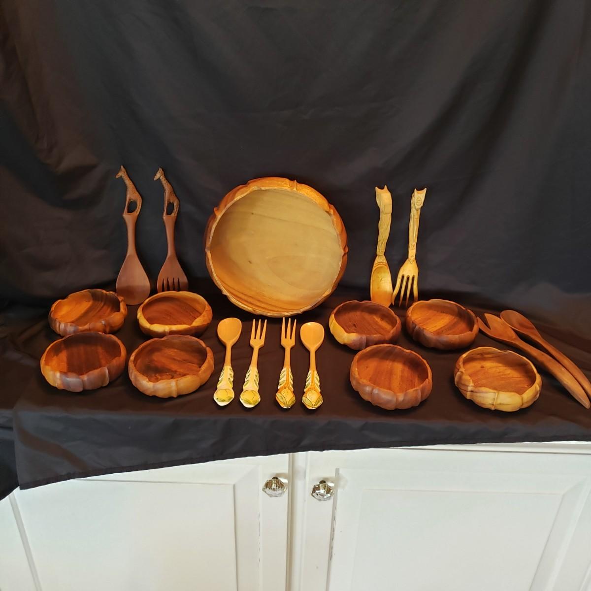 This lot of a large wooden salad bowl (12" x 3" H) has eight small bowls (6" x 2" H). The four ceramic handled tongs have a pear and lemons on the handles and measure approximately 10". The pair of giraffe handcrafted handles measure 12". The pair of ornate handcrafted tongs have a viking style to them and measure 11". The simple styled tongs measure 12". The small salad bowls have some wear on the bottom insides, see pictures.