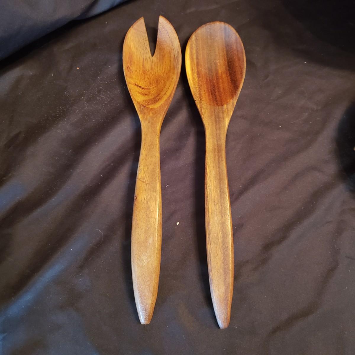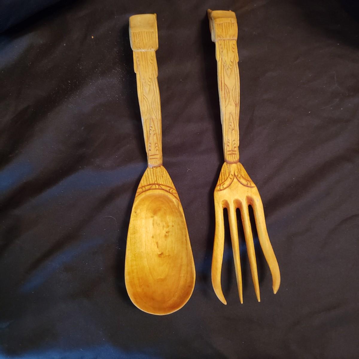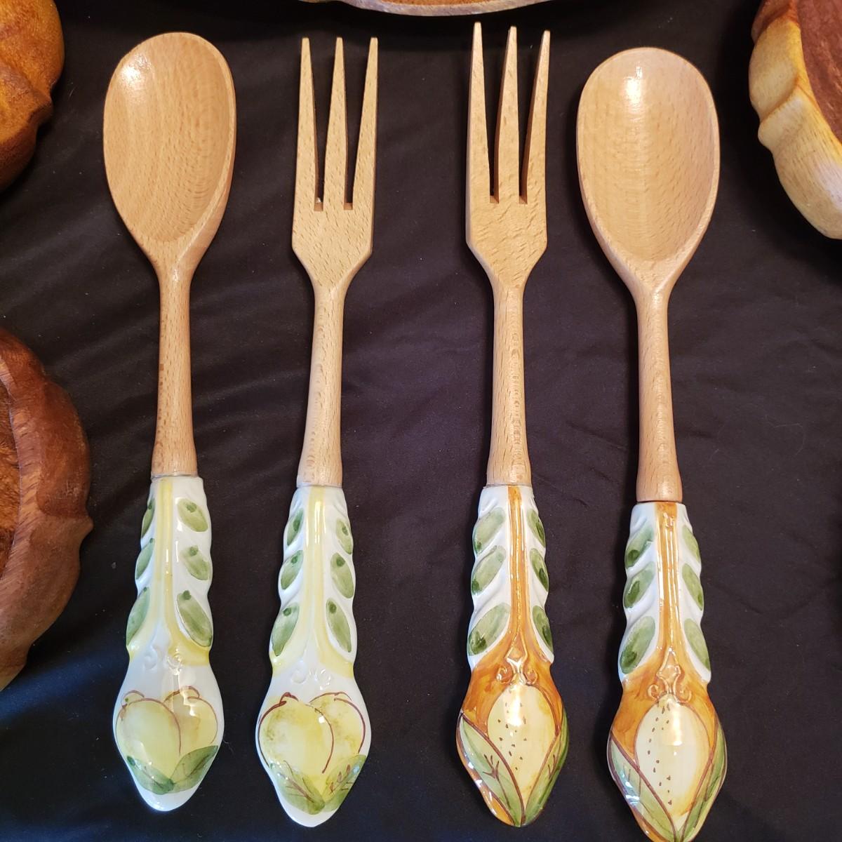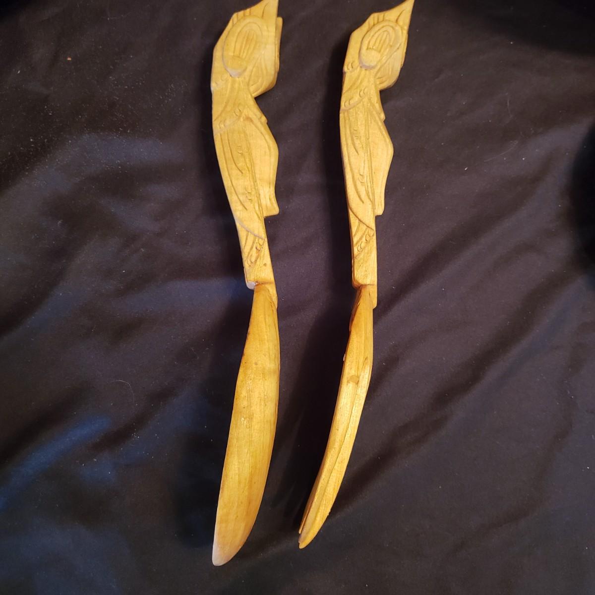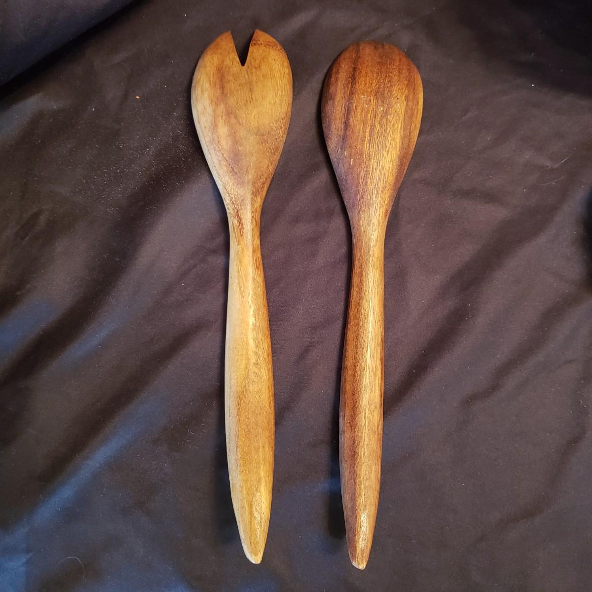 This lot of a large wooden salad bowl (12" x 3" H) has eight small bowls (6" x 2" H). The four ceramic handled tongs have a pear and lemons on the handles and measure approximately 10". The pair of giraffe handcrafted handles measure 12". The pair of ornate handcrafted tongs have a viking style to them and measure 11". The simple styled tongs measure 12". The small salad bowls have some wear on the bottom insides, see pictures.