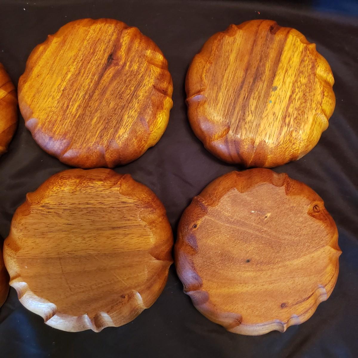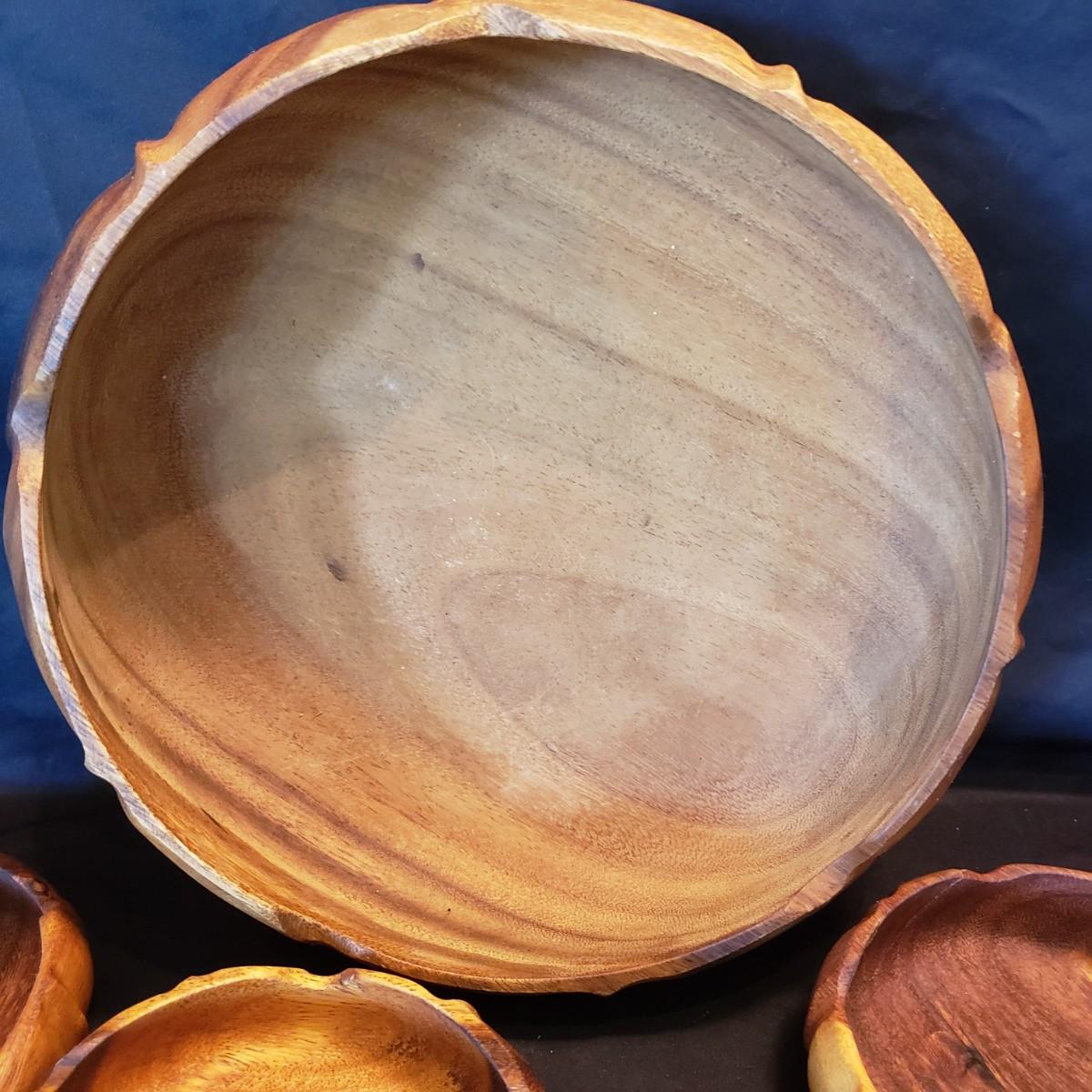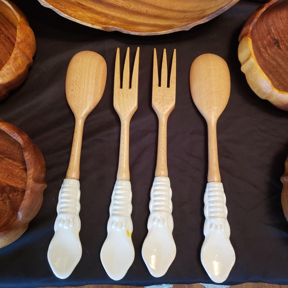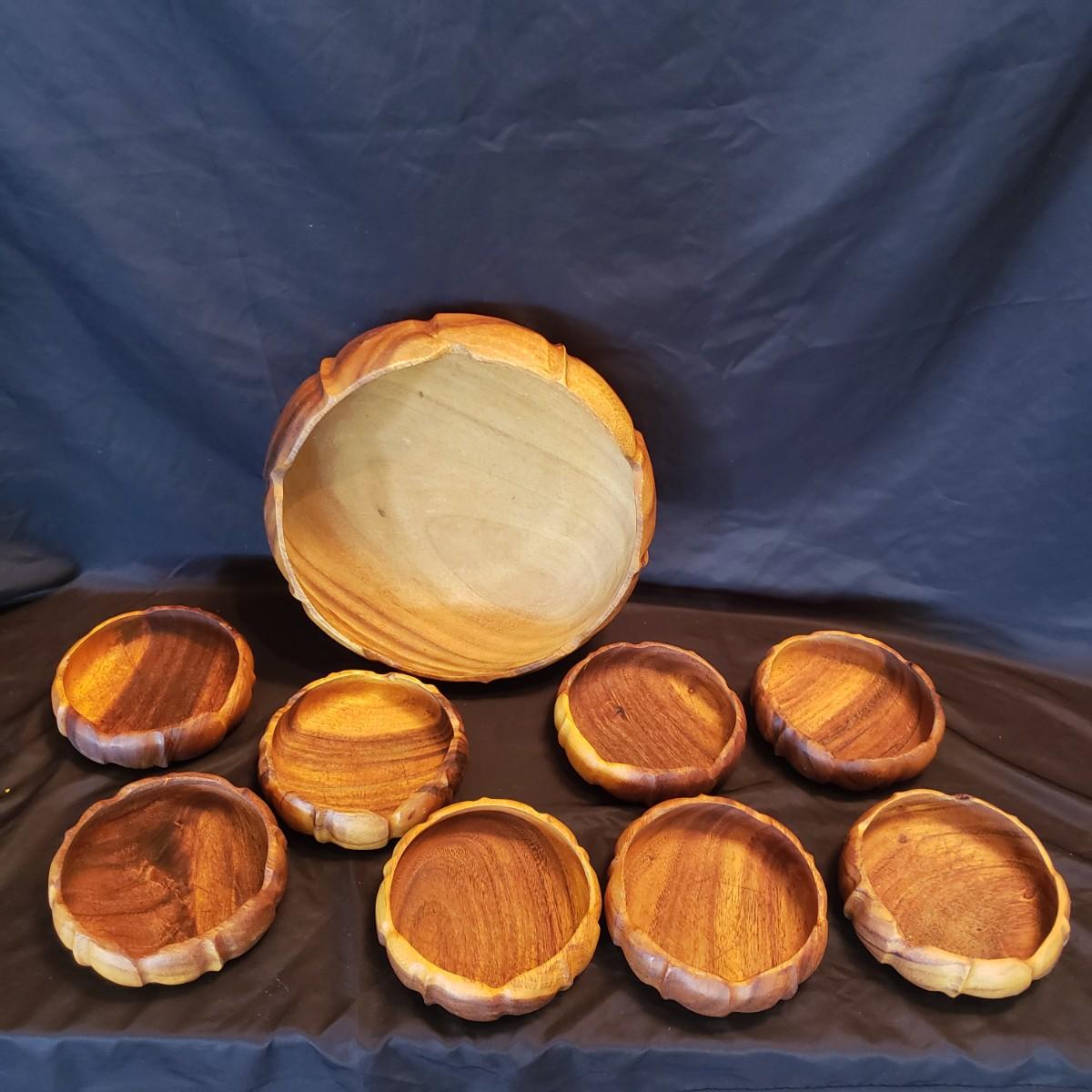 This lot of a large wooden salad bowl (12" x 3" H) has eight small bowls (6" x 2" H). The four ceramic handled tongs have a pear and lemons on the handles and measure approximately 10". The pair of giraffe handcrafted handles measure 12". The pair of ornate handcrafted tongs have a viking style to them and measure 11". The simple styled tongs measure 12". The small salad bowls have some wear on the bottom insides, see pictures.