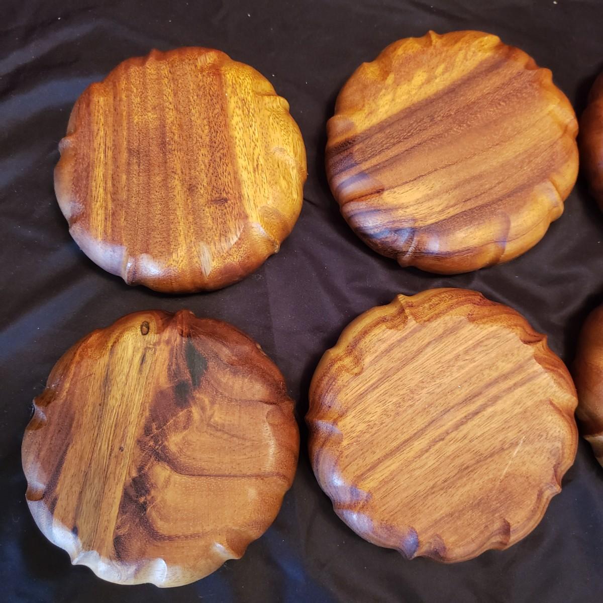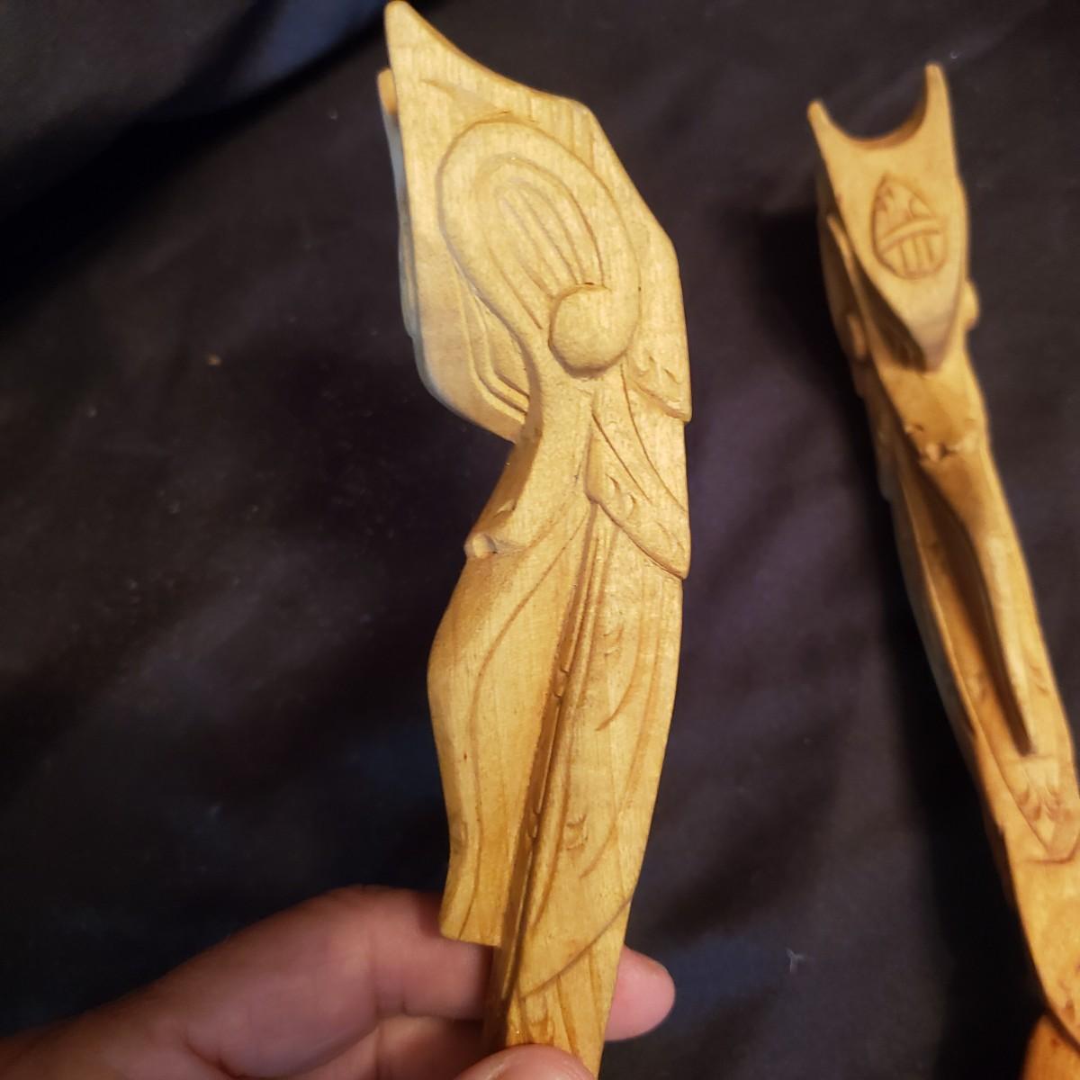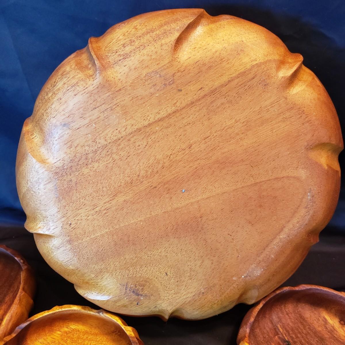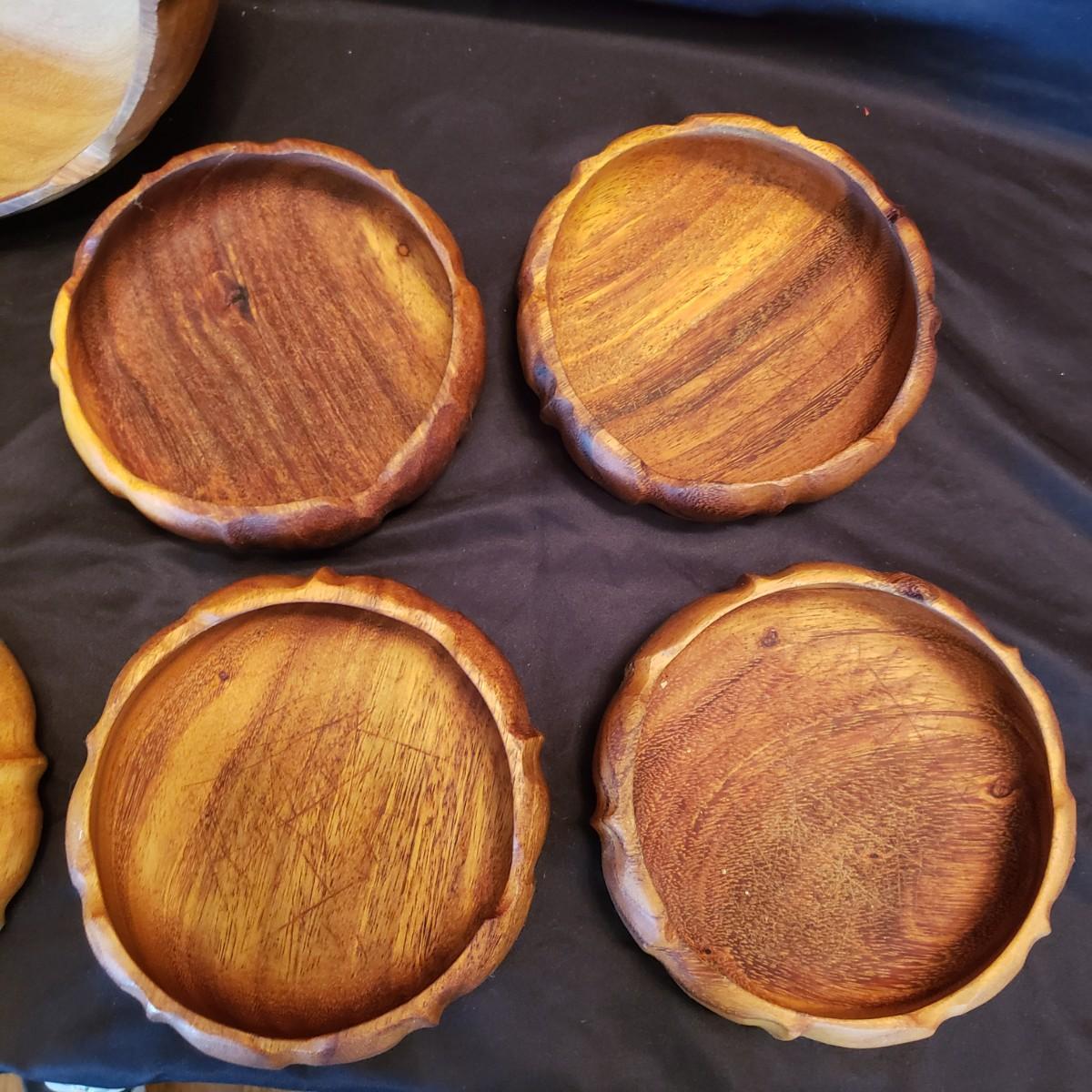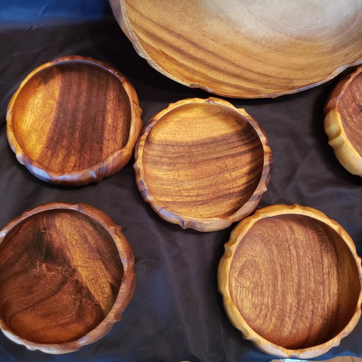 This lot of a large wooden salad bowl (12" x 3" H) has eight small bowls (6" x 2" H). The four ceramic handled tongs have a pear and lemons on the handles and measure approximately 10". The pair of giraffe handcrafted handles measure 12". The pair of ornate handcrafted tongs have a viking style to them and measure 11". The simple styled tongs measure 12". The small salad bowls have some wear on the bottom insides, see pictures.