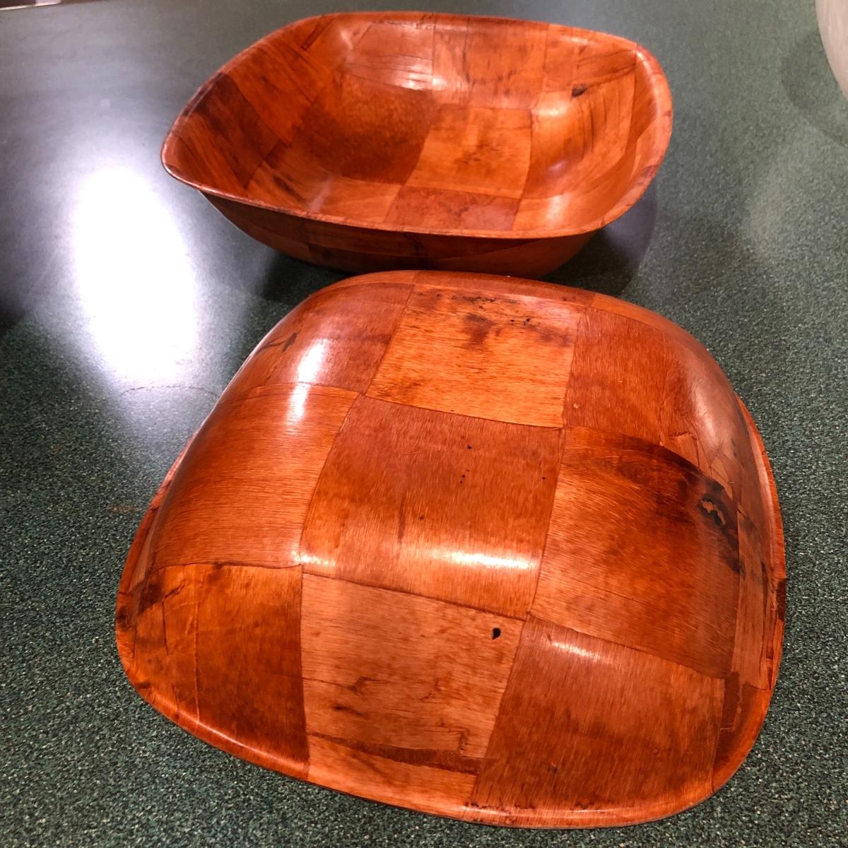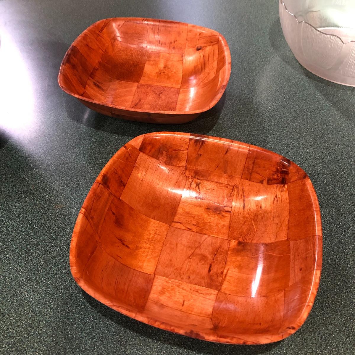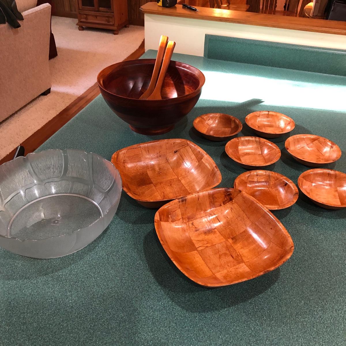 This lot includes a deep thick salad bowl (13” in diameter) with two serving utensils, two square wooden bowls (10” x 10”), six small salad bowls and one plastic bowl (12” in diameter). Shipping Available.
