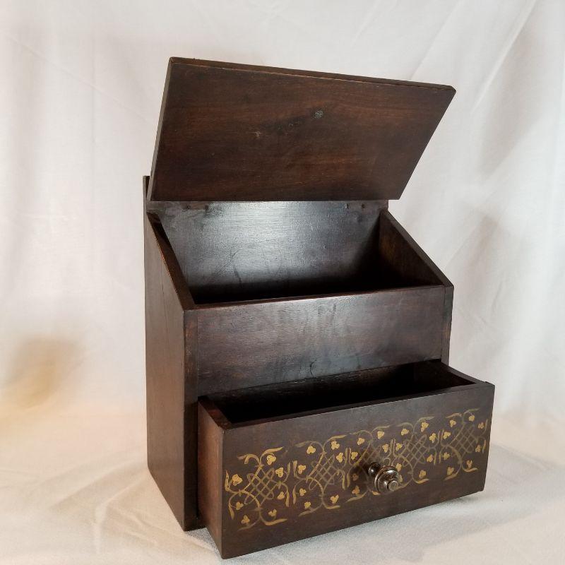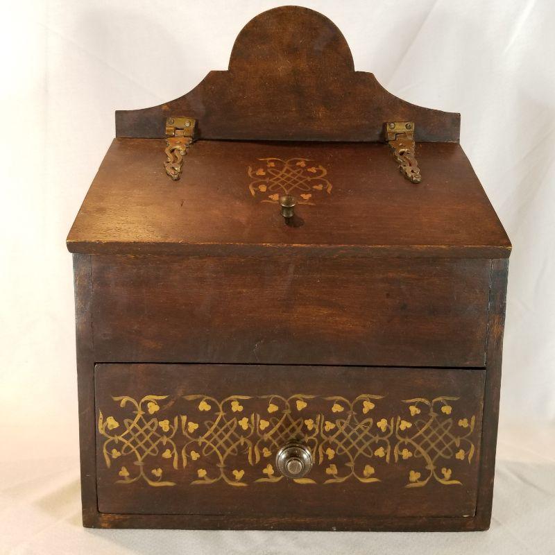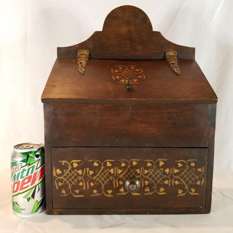 Wooden Salt Box with Drawer and Nice Stenciling. Wall mountable wooden salt box with drawer. Solid brass decorative hinges and nicely hand decorated with painted stenciling. 16-inches tall.