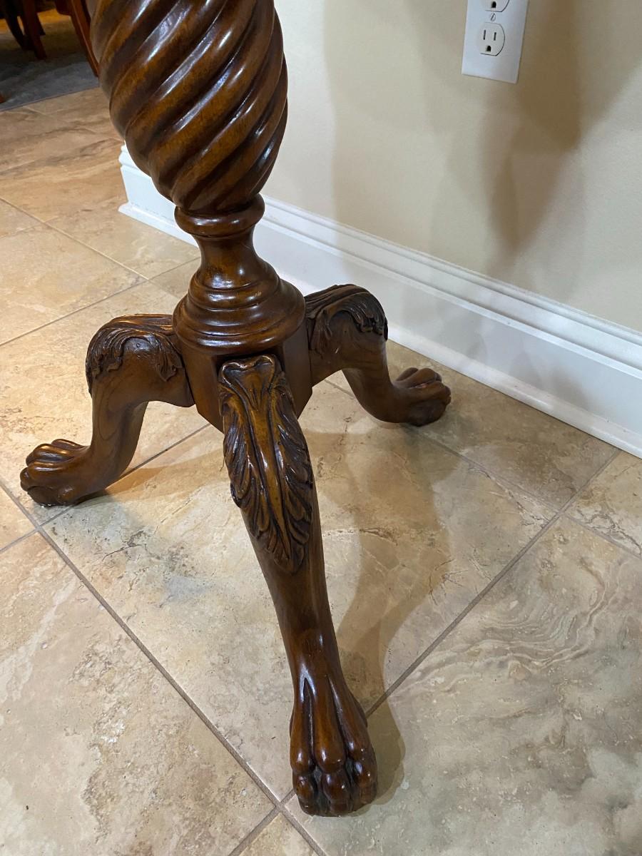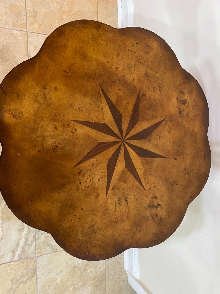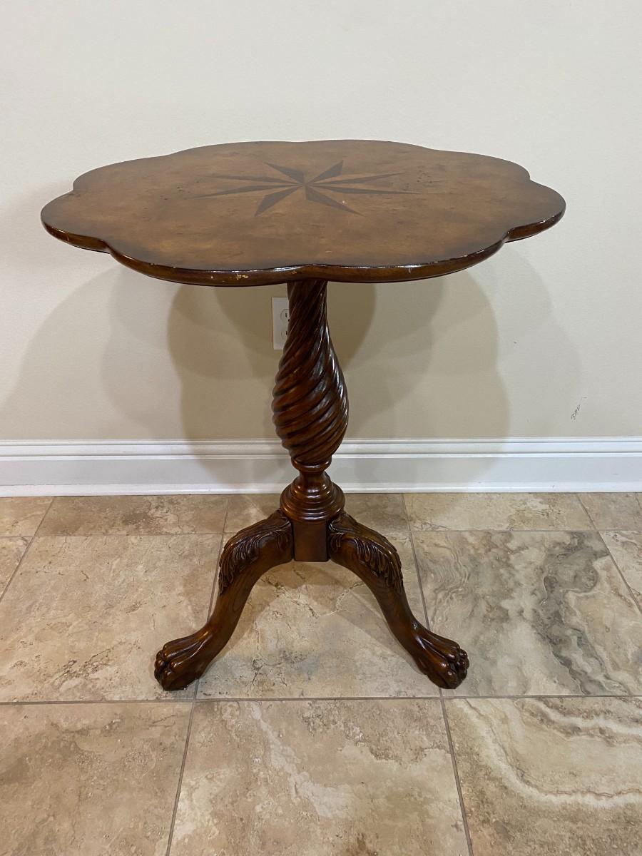 Wooden scalloped pedestal table with wood inlay top. Carved legs with claw feet. In good condition with a few scratches. Approx. 30" H x 24" D