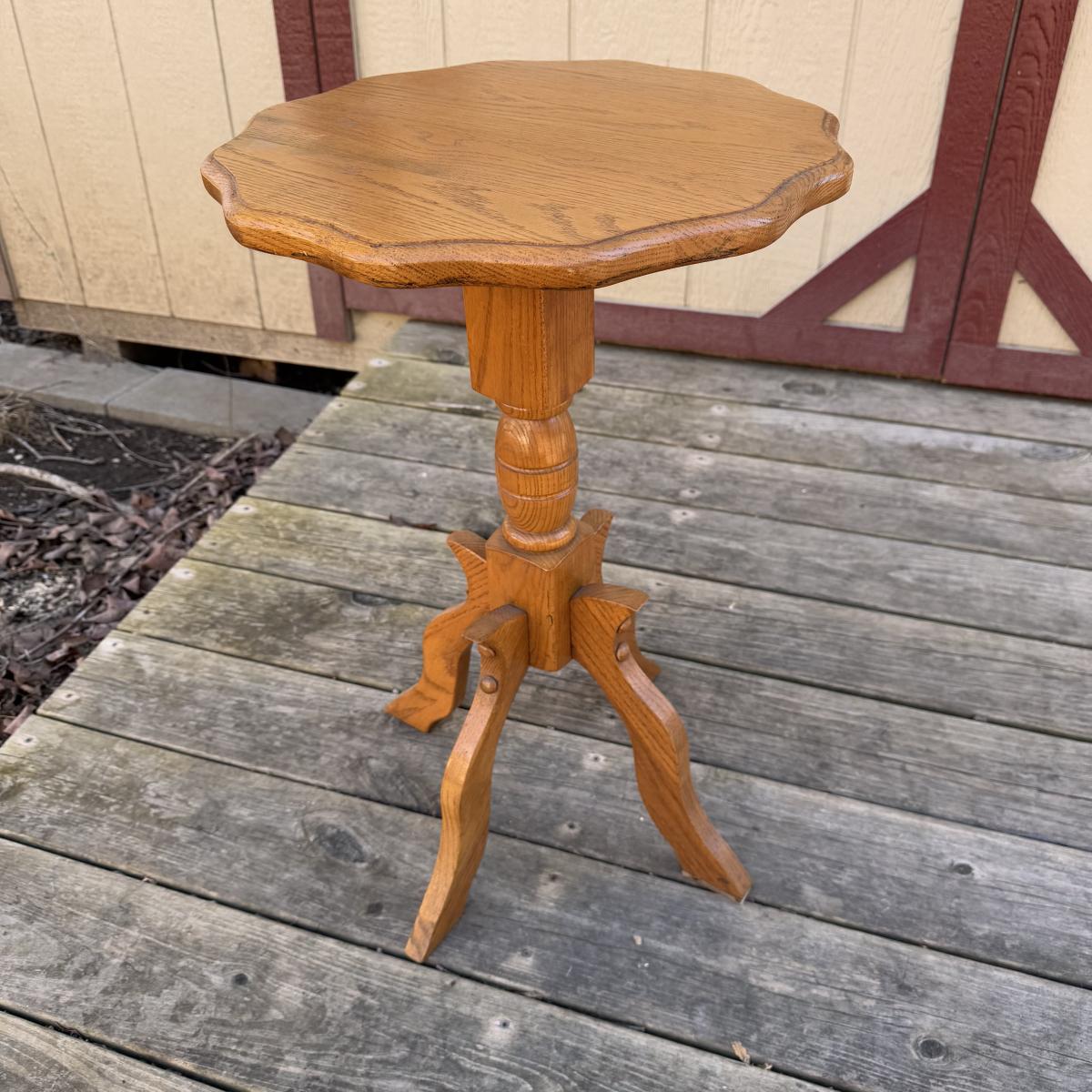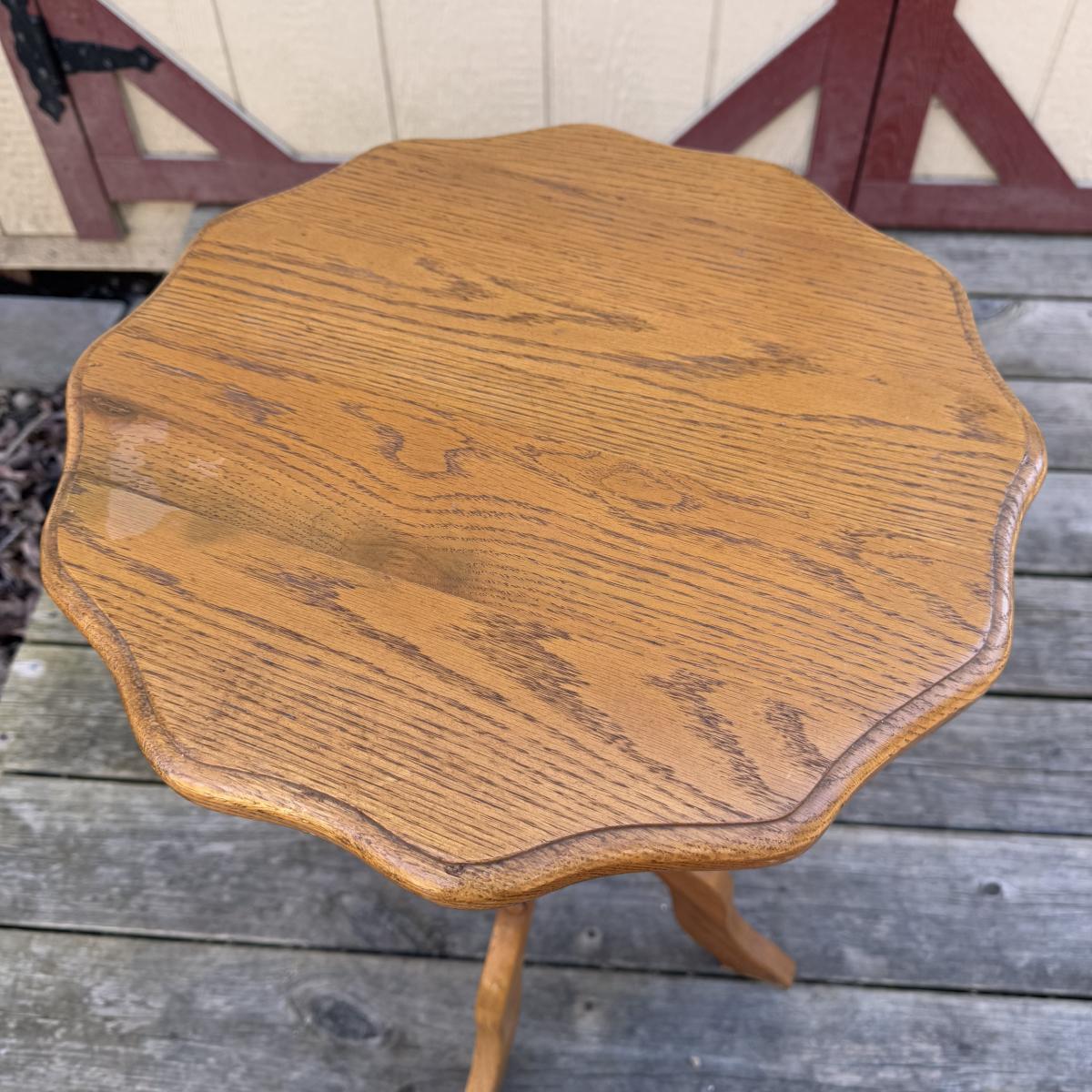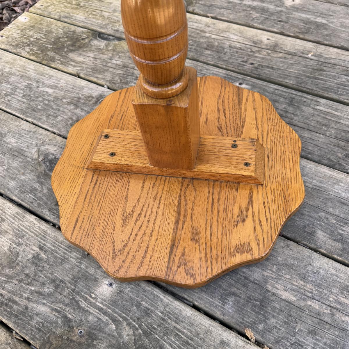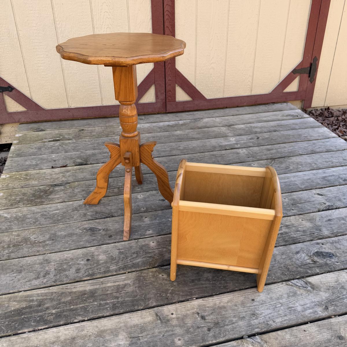 This lot includes a wooden pedestal side table with a scalloped top plus a wooden magazine rack. The table has creative touches throughout, including the wavy legs. Neither item appears to be stamped. The table measures 16”D x 25”H. Local pickup only.