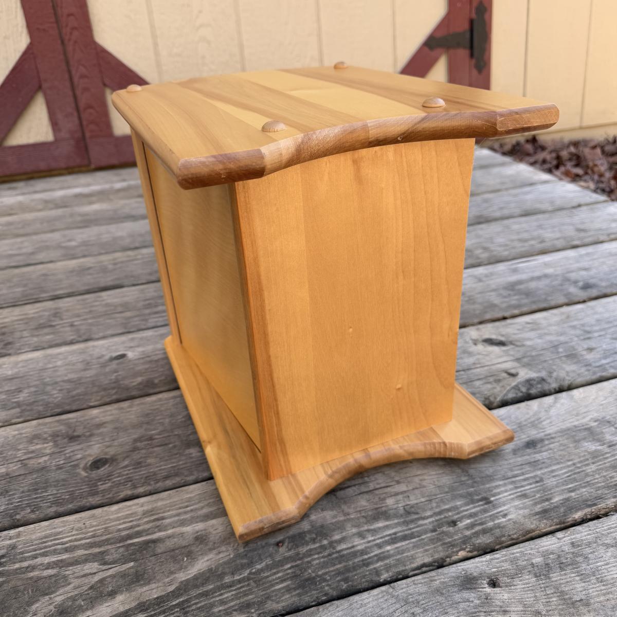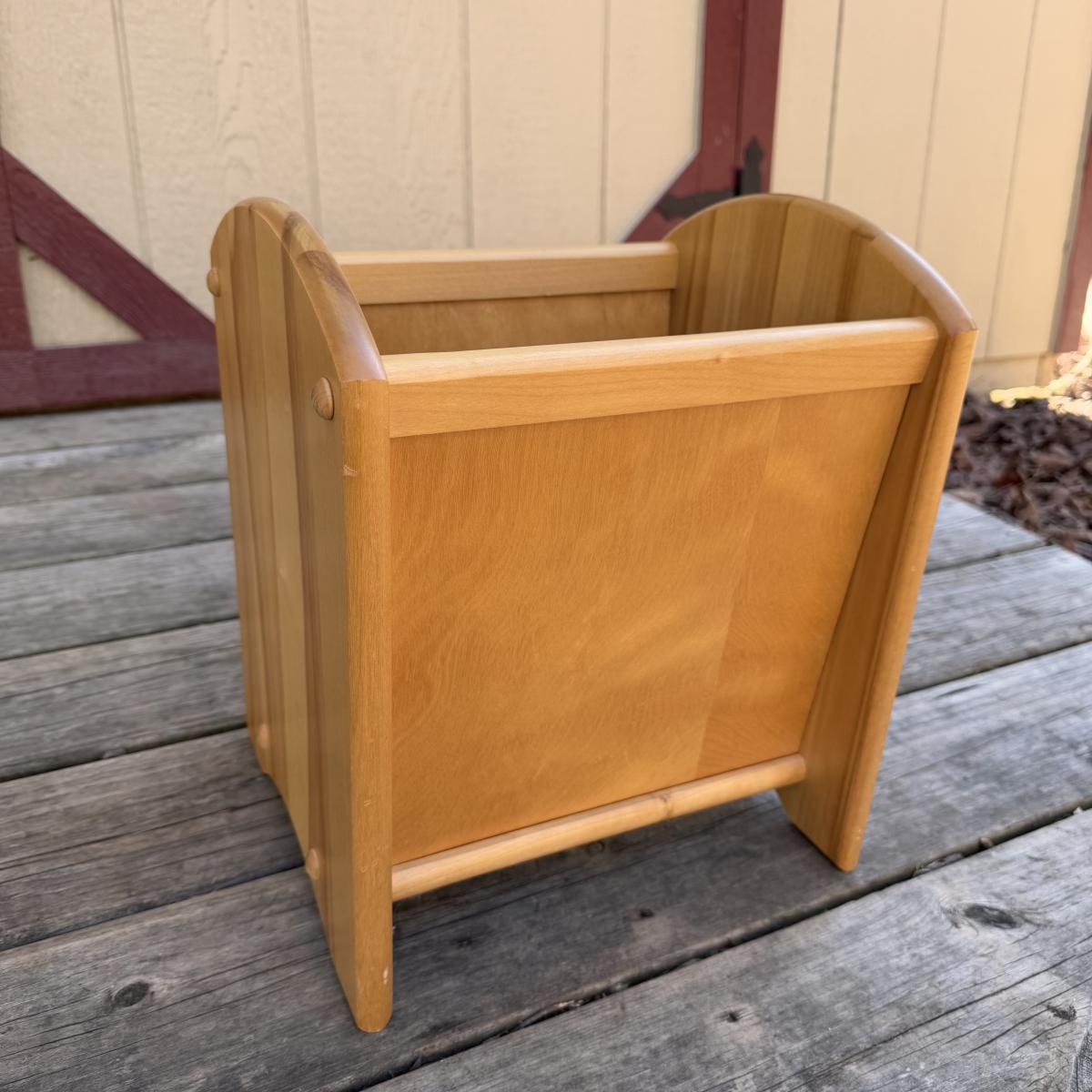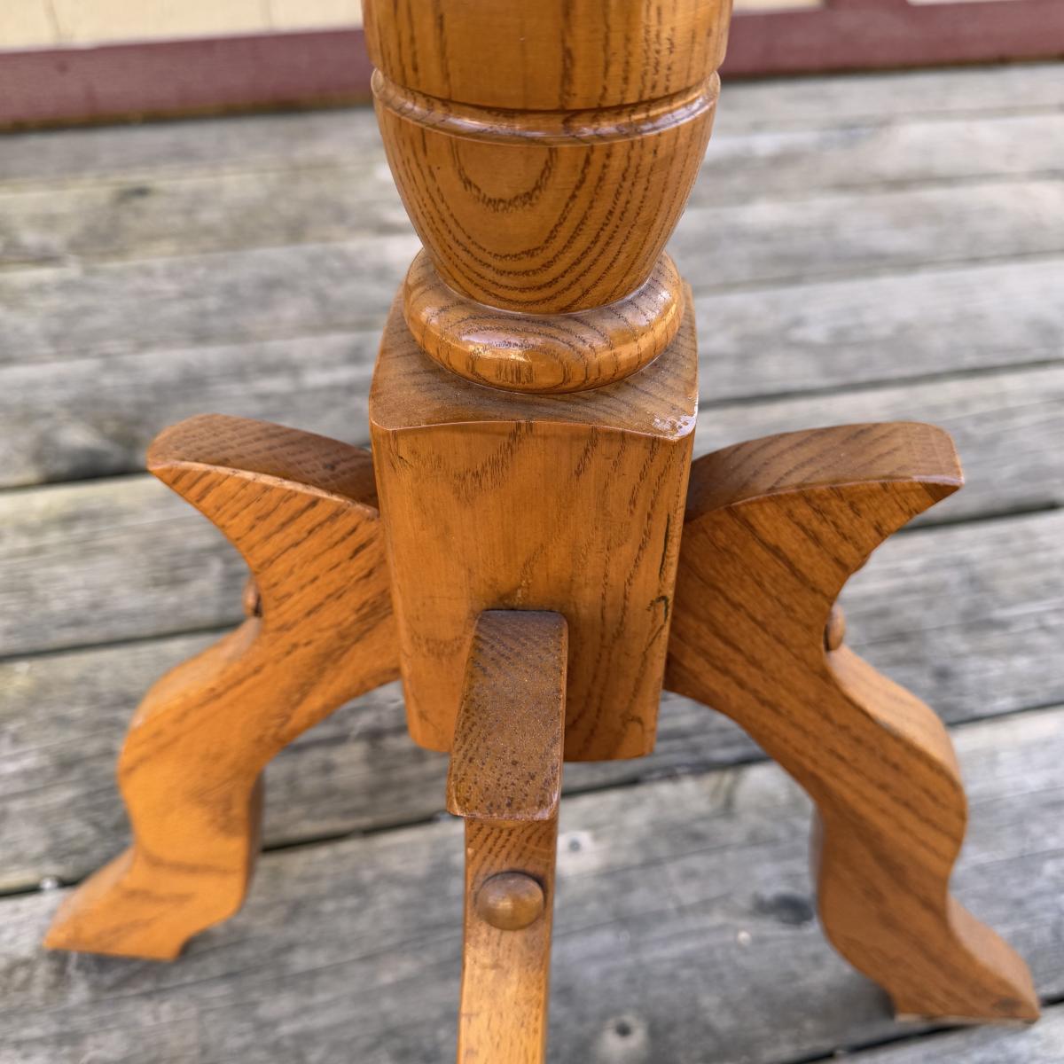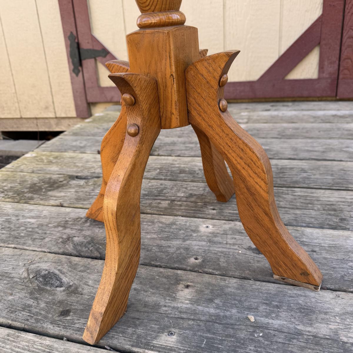 This lot includes a wooden pedestal side table with a scalloped top plus a wooden magazine rack. The table has creative touches throughout, including the wavy legs. Neither item appears to be stamped. The table measures 16”D x 25”H. Local pickup only.