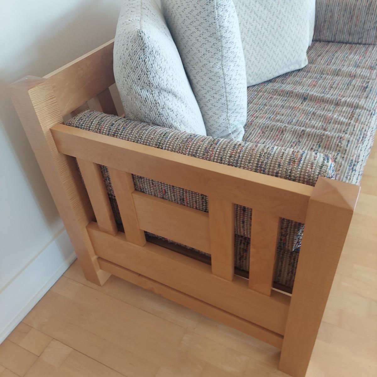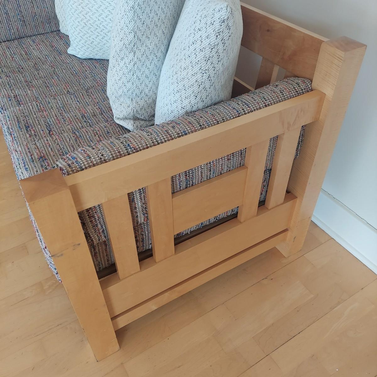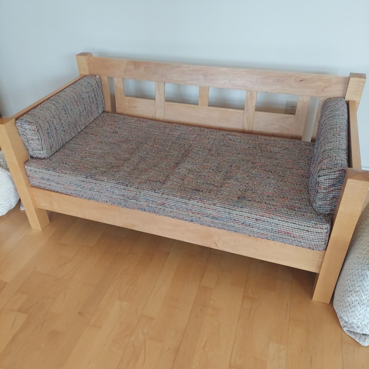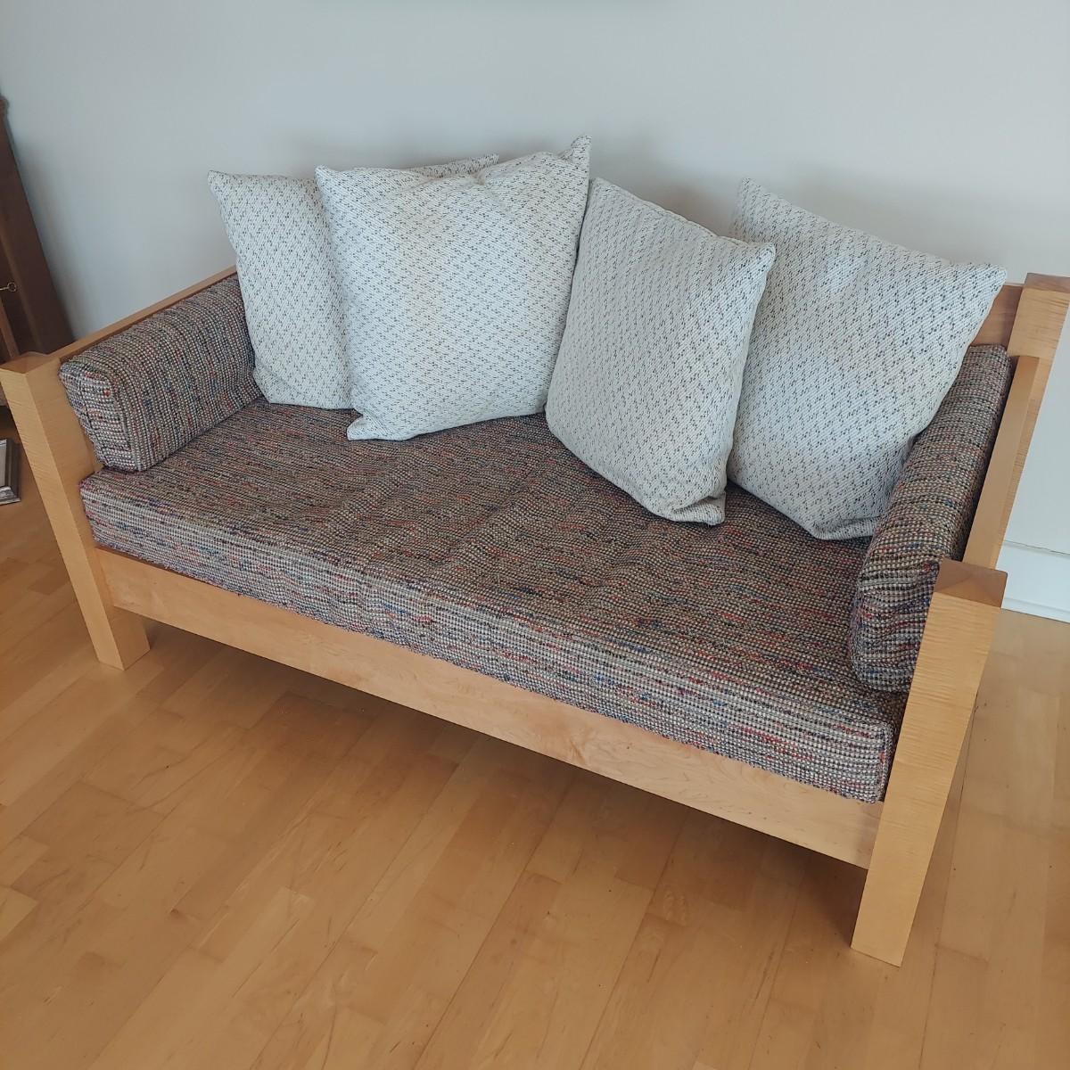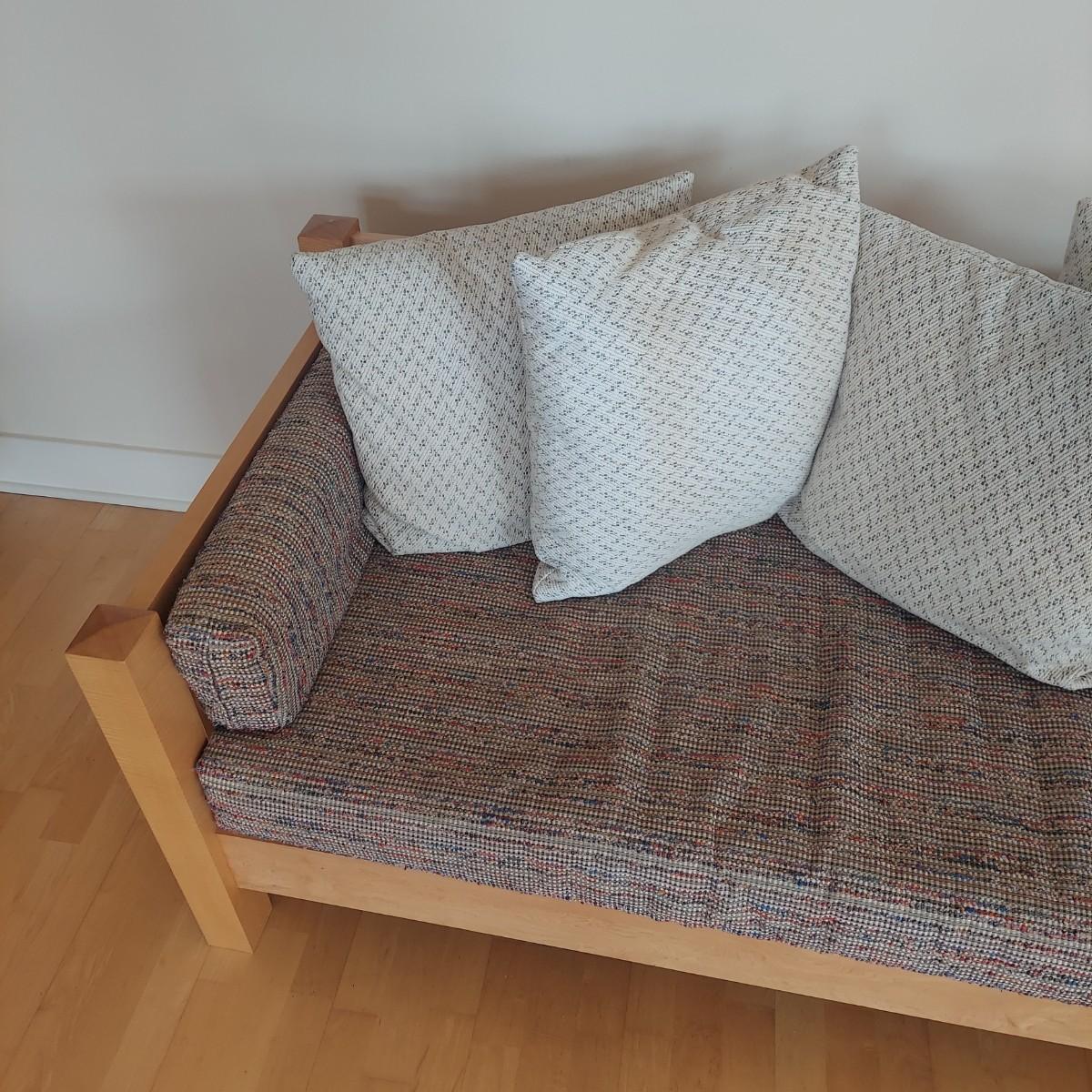 Solid wood settee with removable cushions and pillows. Piece measures 60” x 30” x 29"H with a 16” seat height. All cushions have zip-off covers. The seat and arm cushions match. The four pillows have a contrasting yet complementary fabric. Both upholstery fabrics are heavy and woven. The throw pillows and cushions do not traditionally match but are almost a reverse of each other. Please see photos for details.