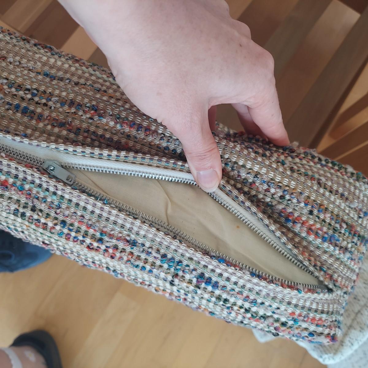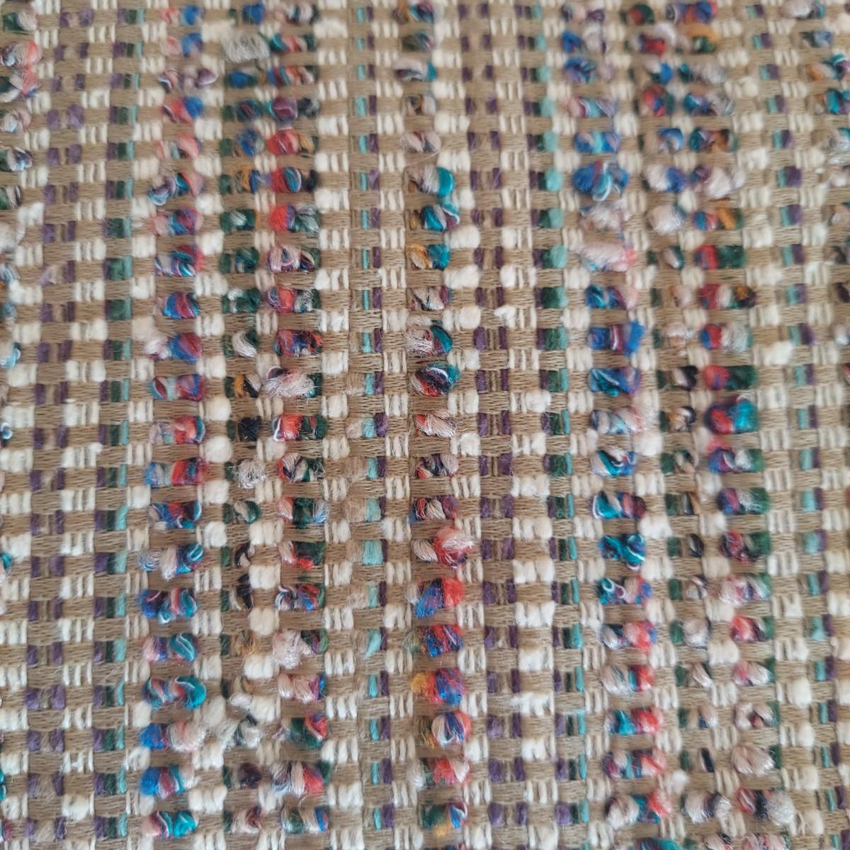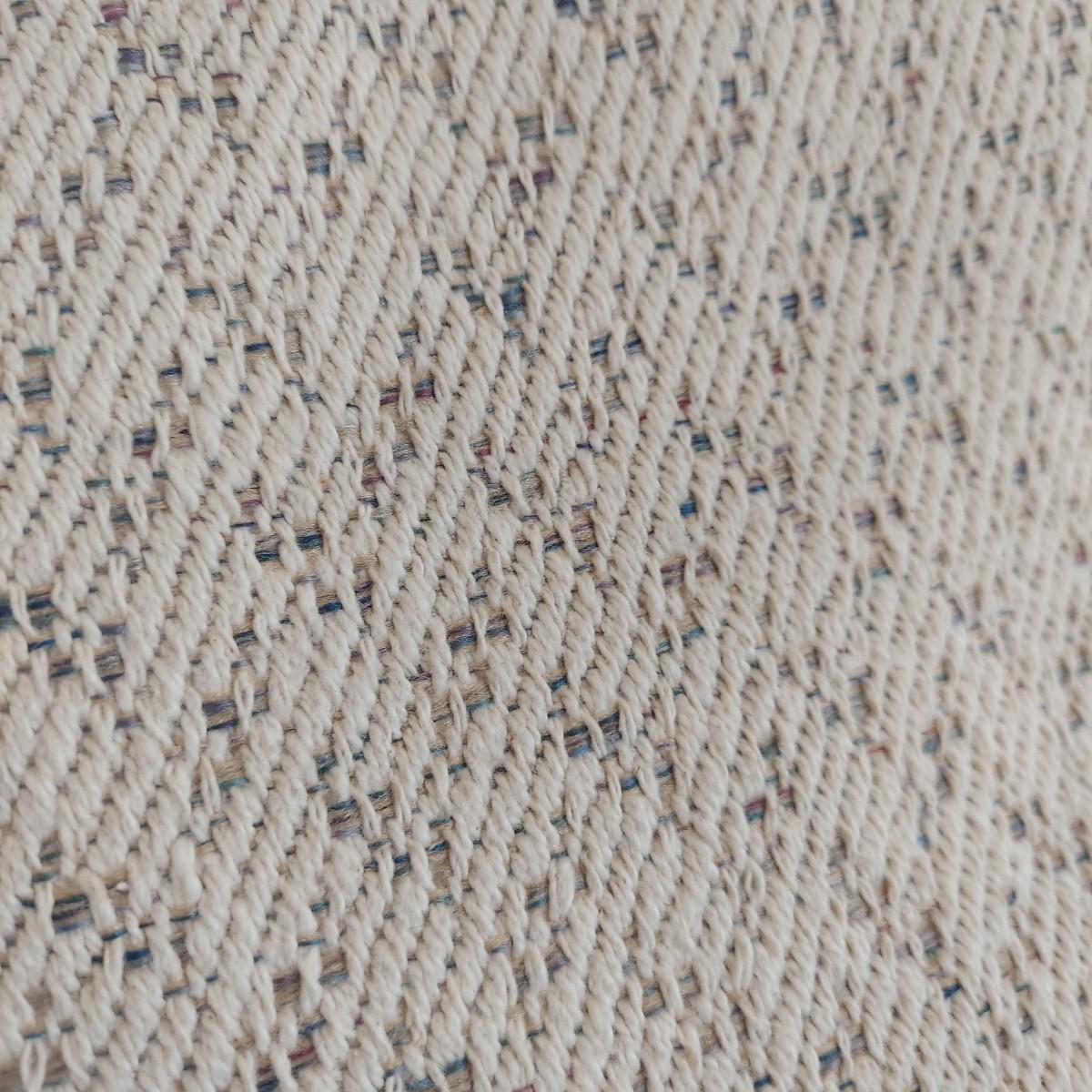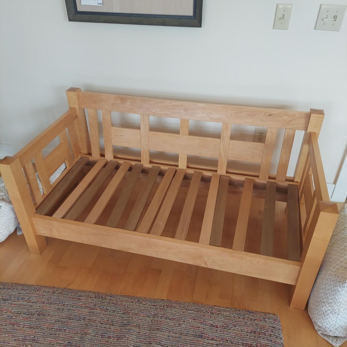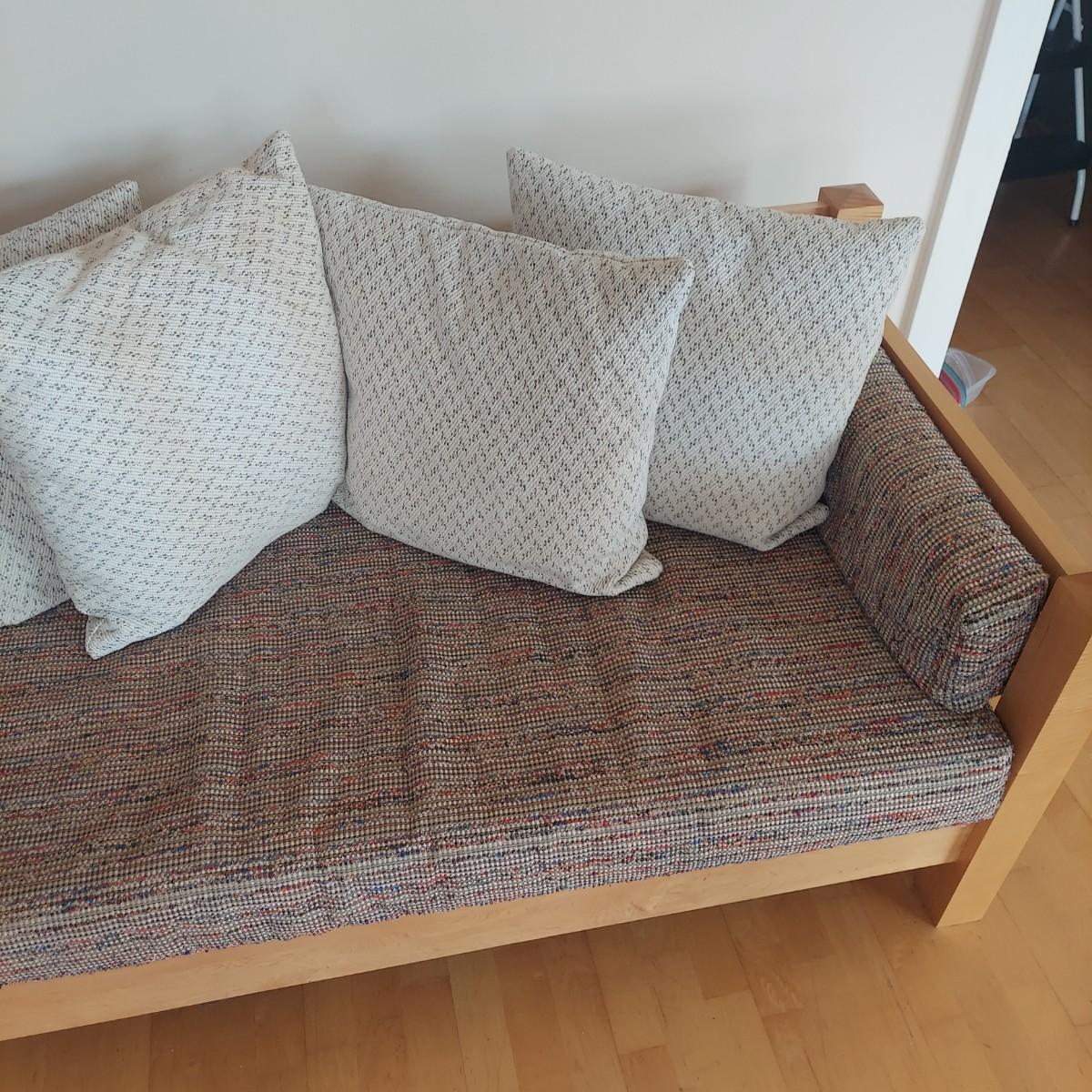 Solid wood settee with removable cushions and pillows. Piece measures 60” x 30” x 29"H with a 16” seat height. All cushions have zip-off covers. The seat and arm cushions match. The four pillows have a contrasting yet complementary fabric. Both upholstery fabrics are heavy and woven. The throw pillows and cushions do not traditionally match but are almost a reverse of each other. Please see photos for details.
