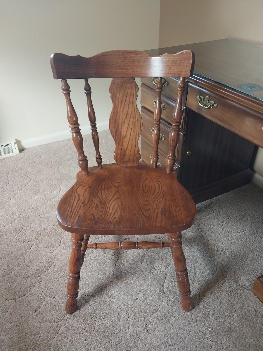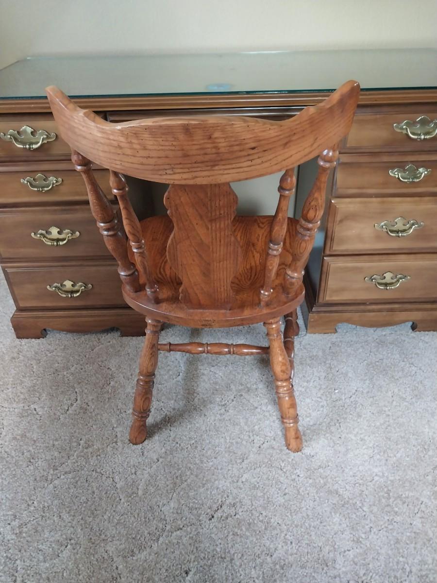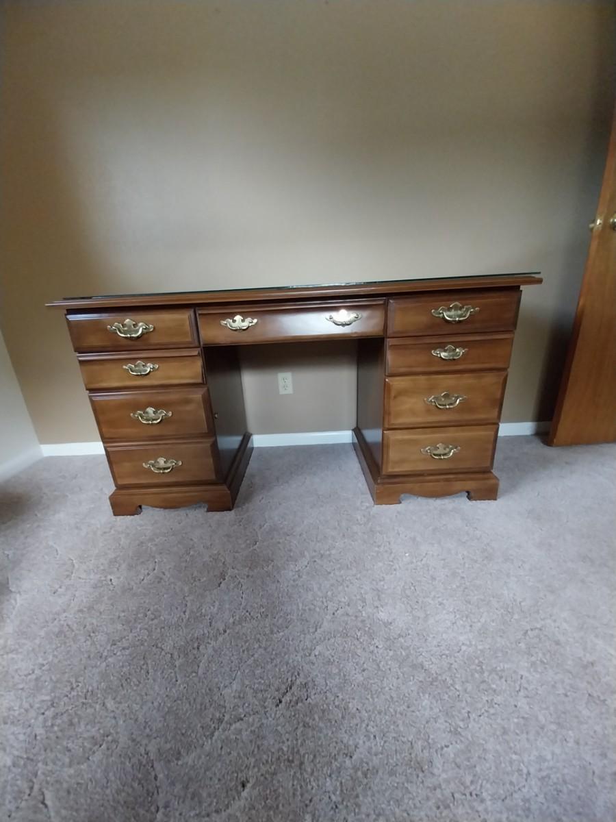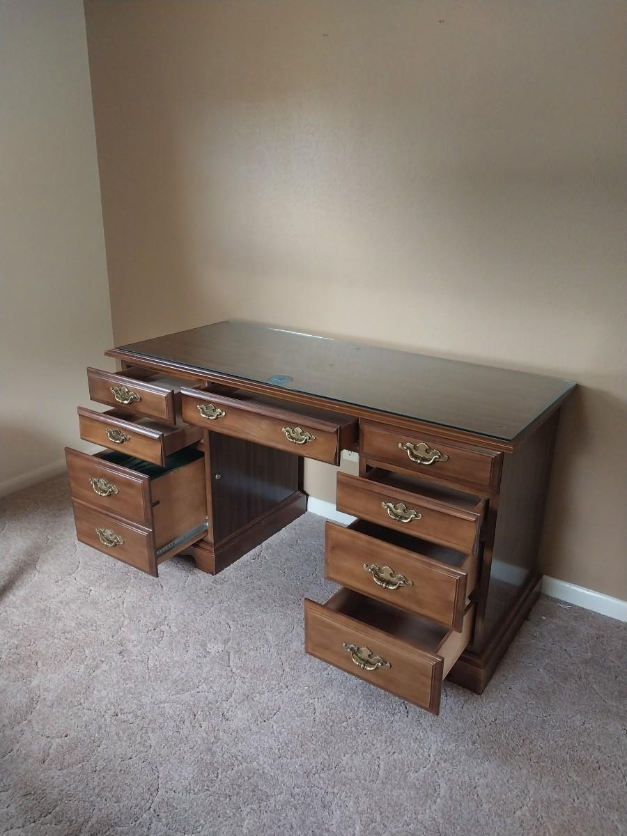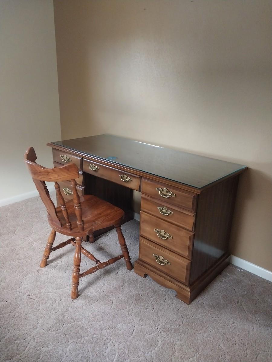 WOODEN SEVEN DRAWER DESK AND WOODEN CHAIR
