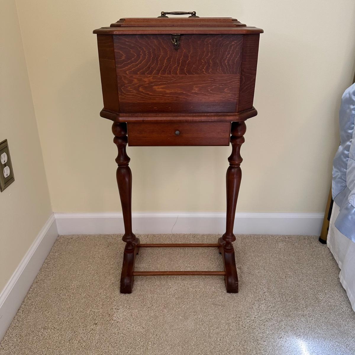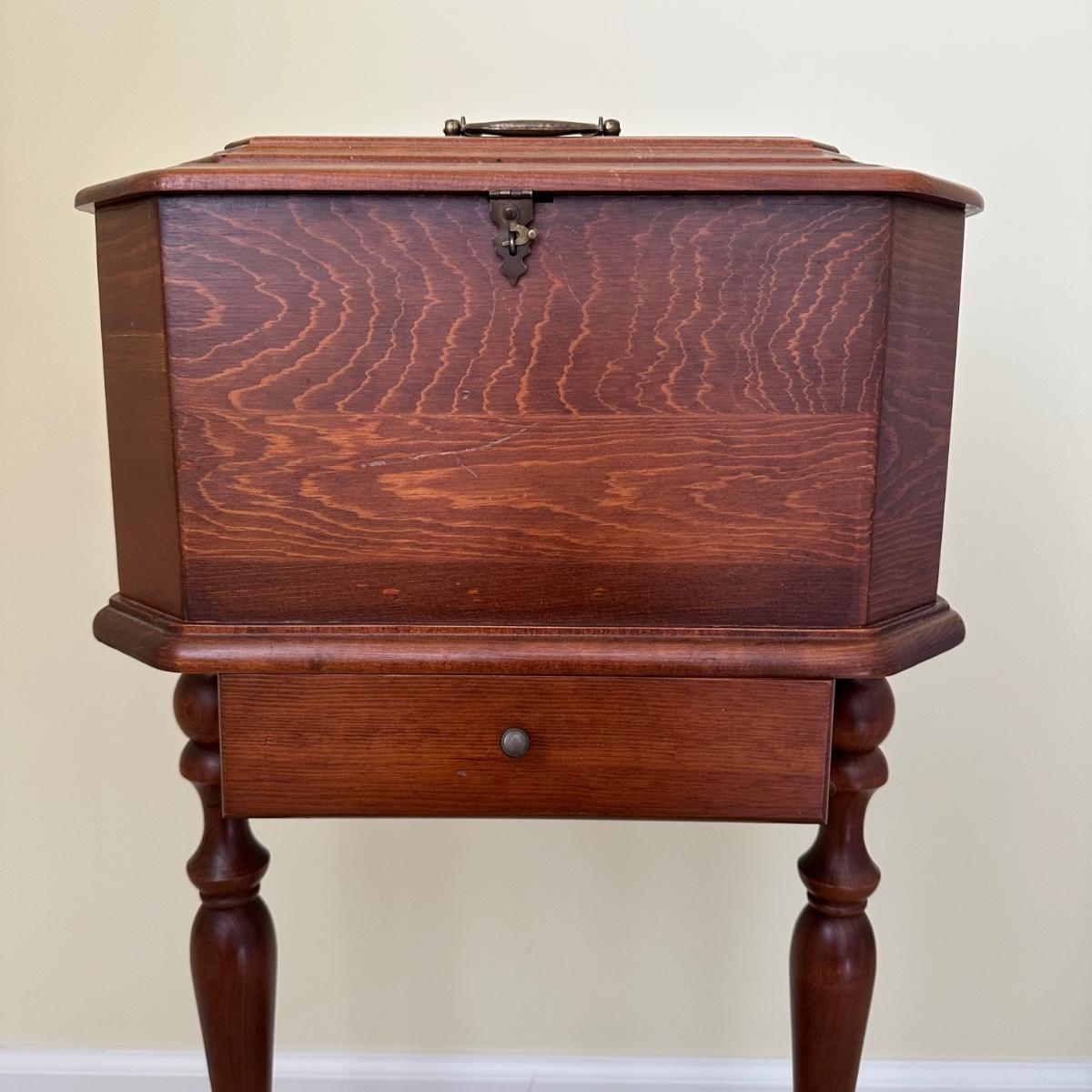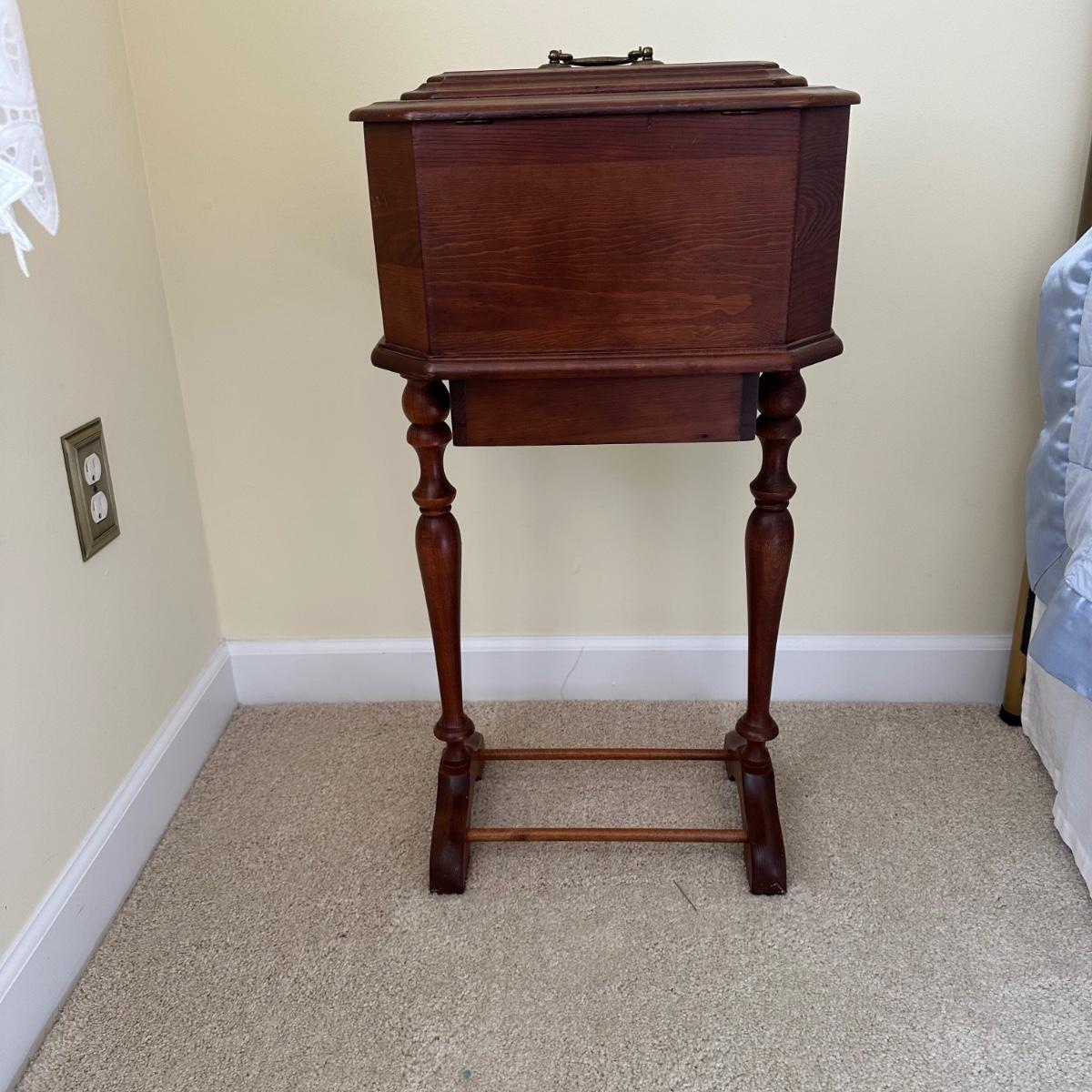 Standing wooden sewing box with drawer. Measures 14” X 9.5” X 30”H. Local pickup only.