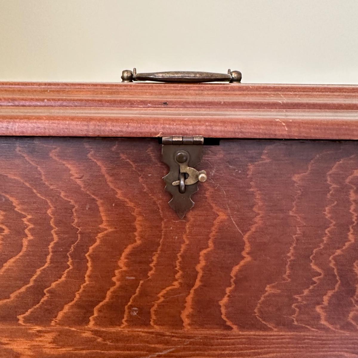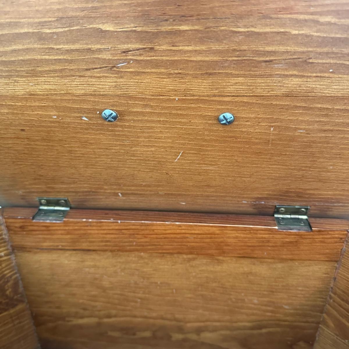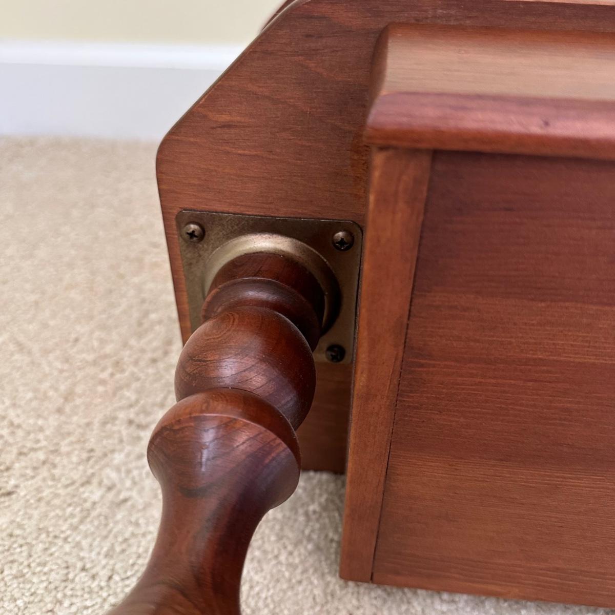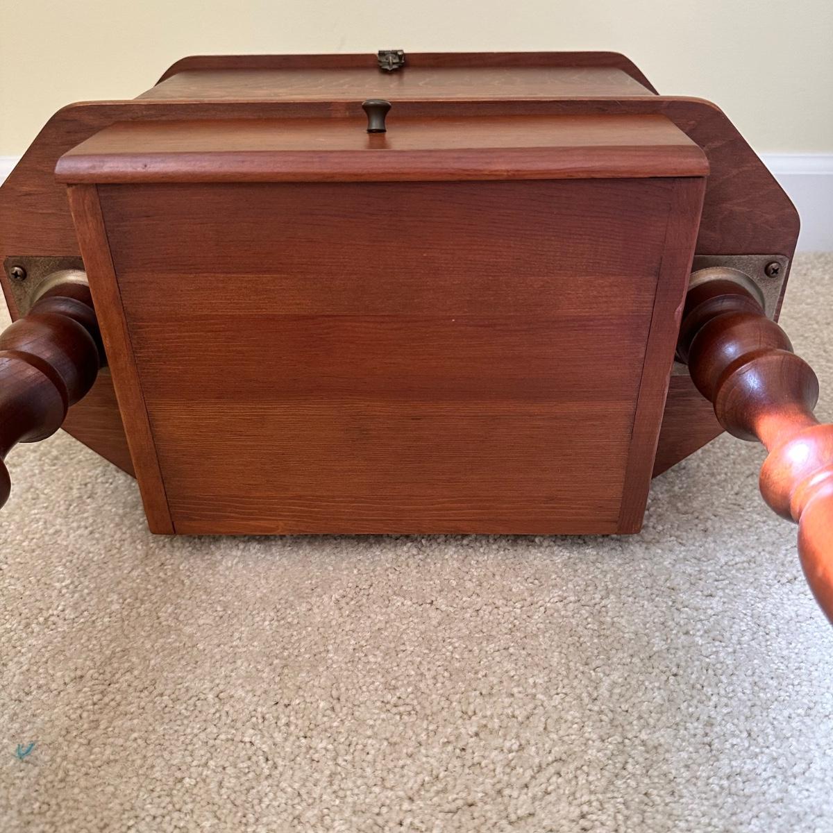 Standing wooden sewing box with drawer. Measures 14” X 9.5” X 30”H. Local pickup only.