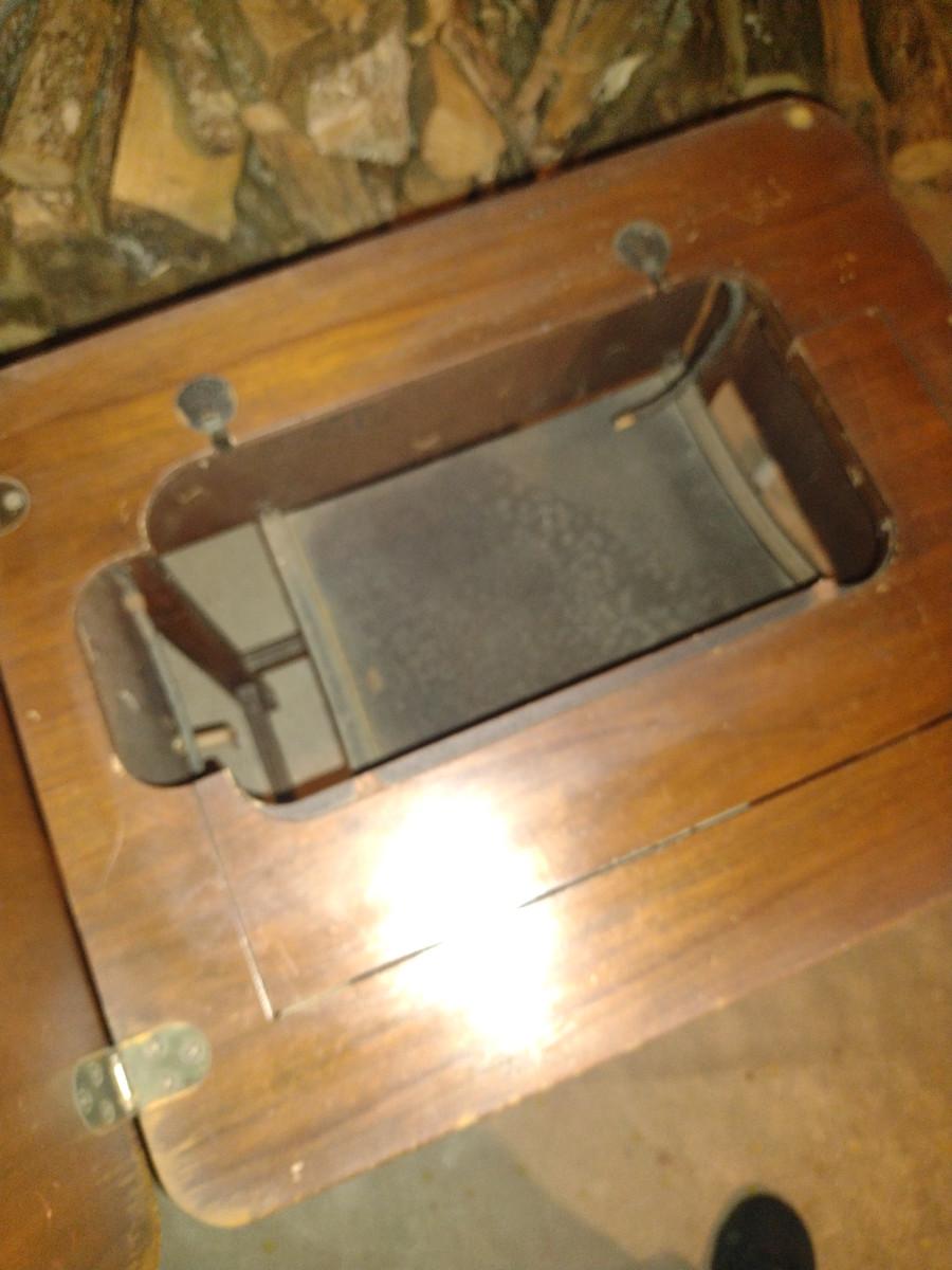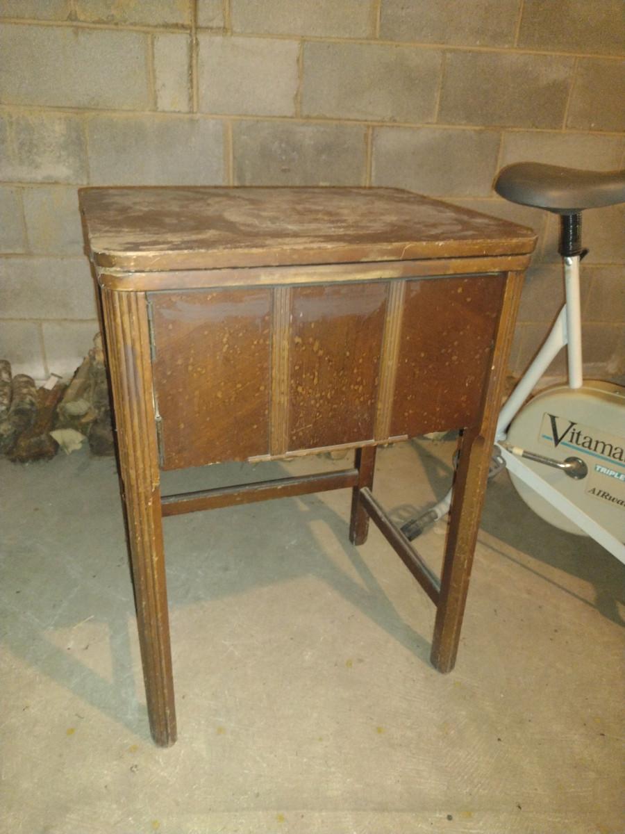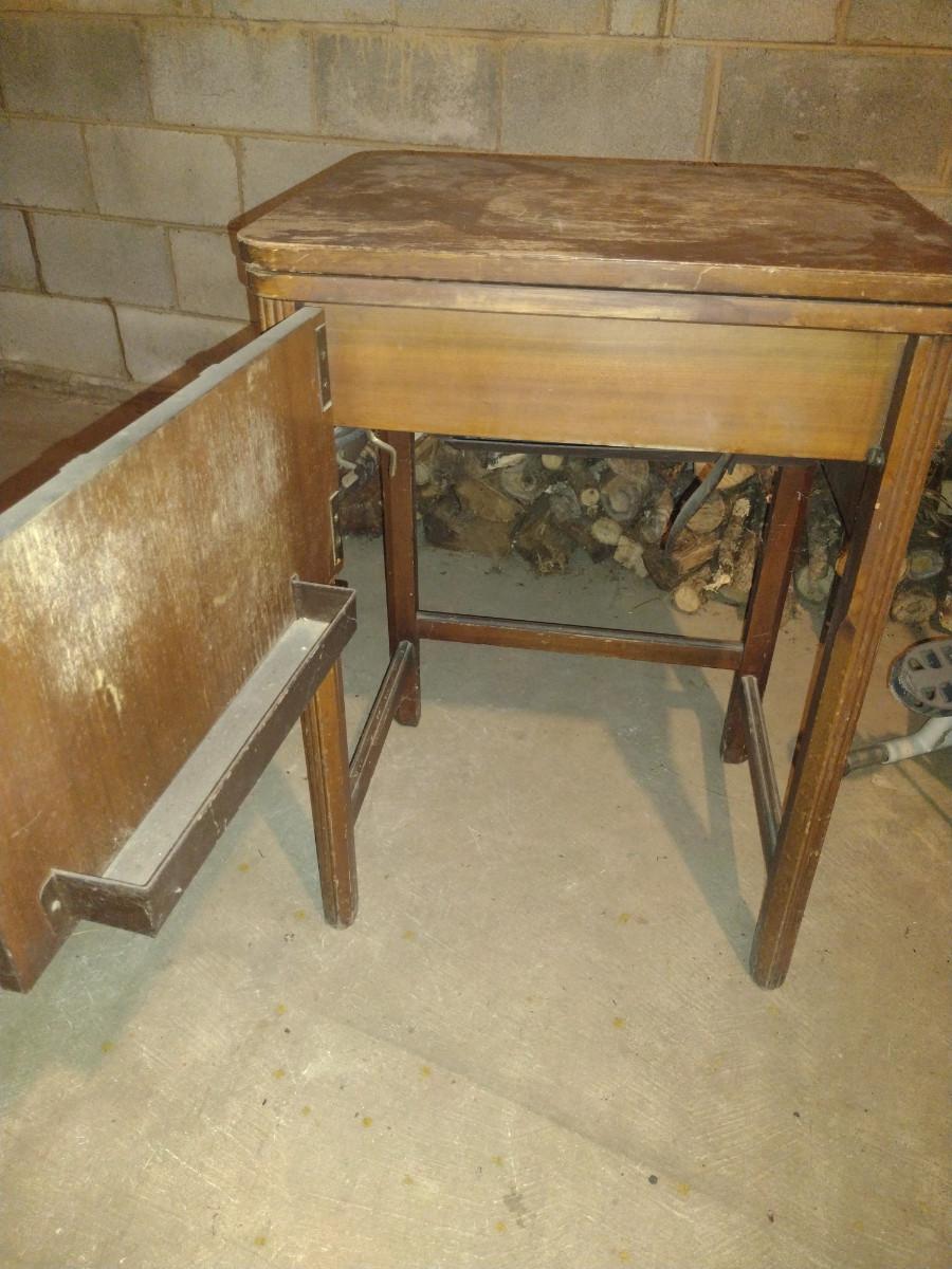 Wooden Sewing Cabinet- No Machine. Item has wear to finish.