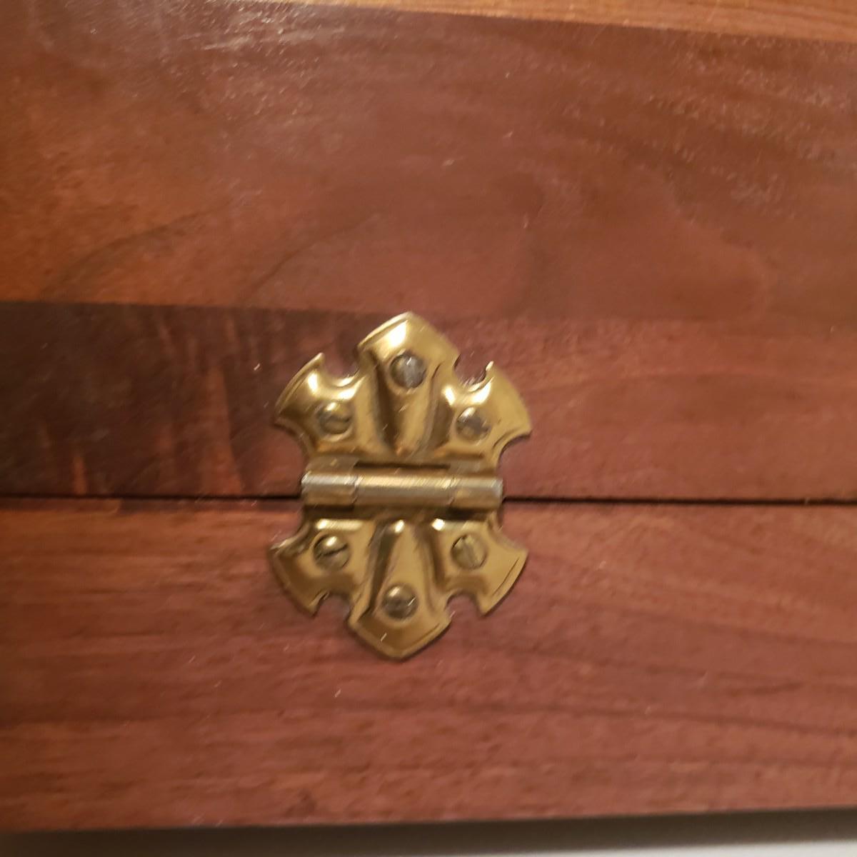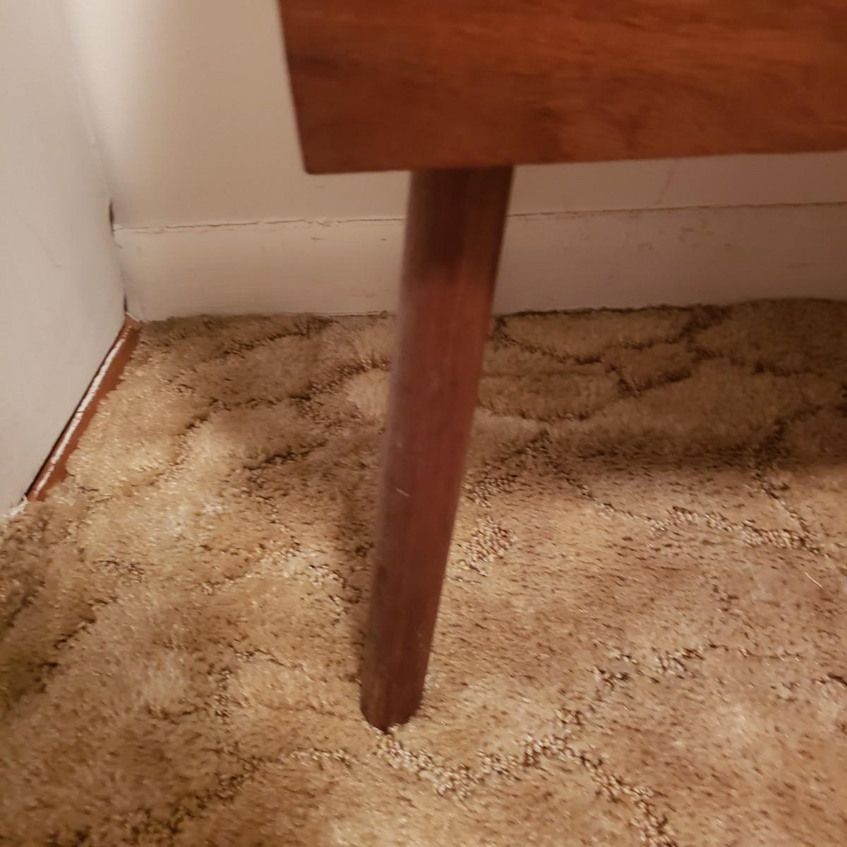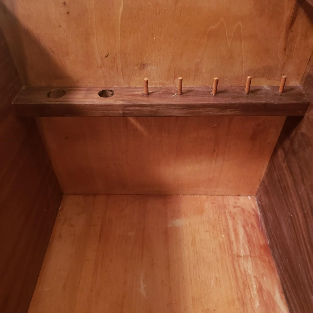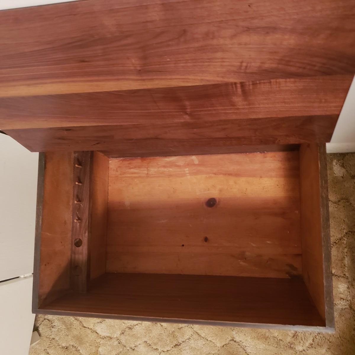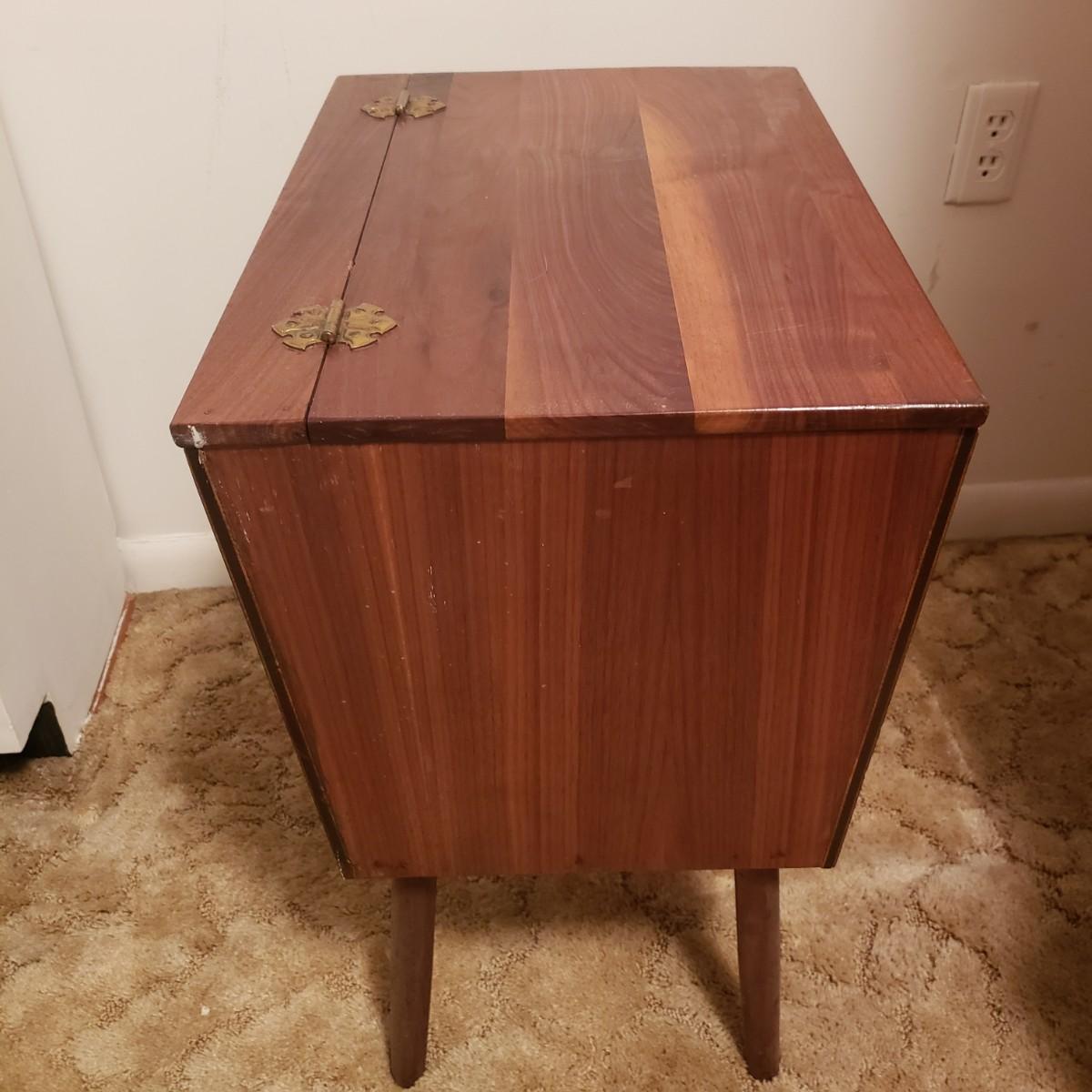 This beautiful wood table has a door which opens to a deep pocket, spool holders and holes for all your sewing needs. The table measures approximately 21" x 15" x 23"H. The top has a few blemishes in the wood finish, see pictures.