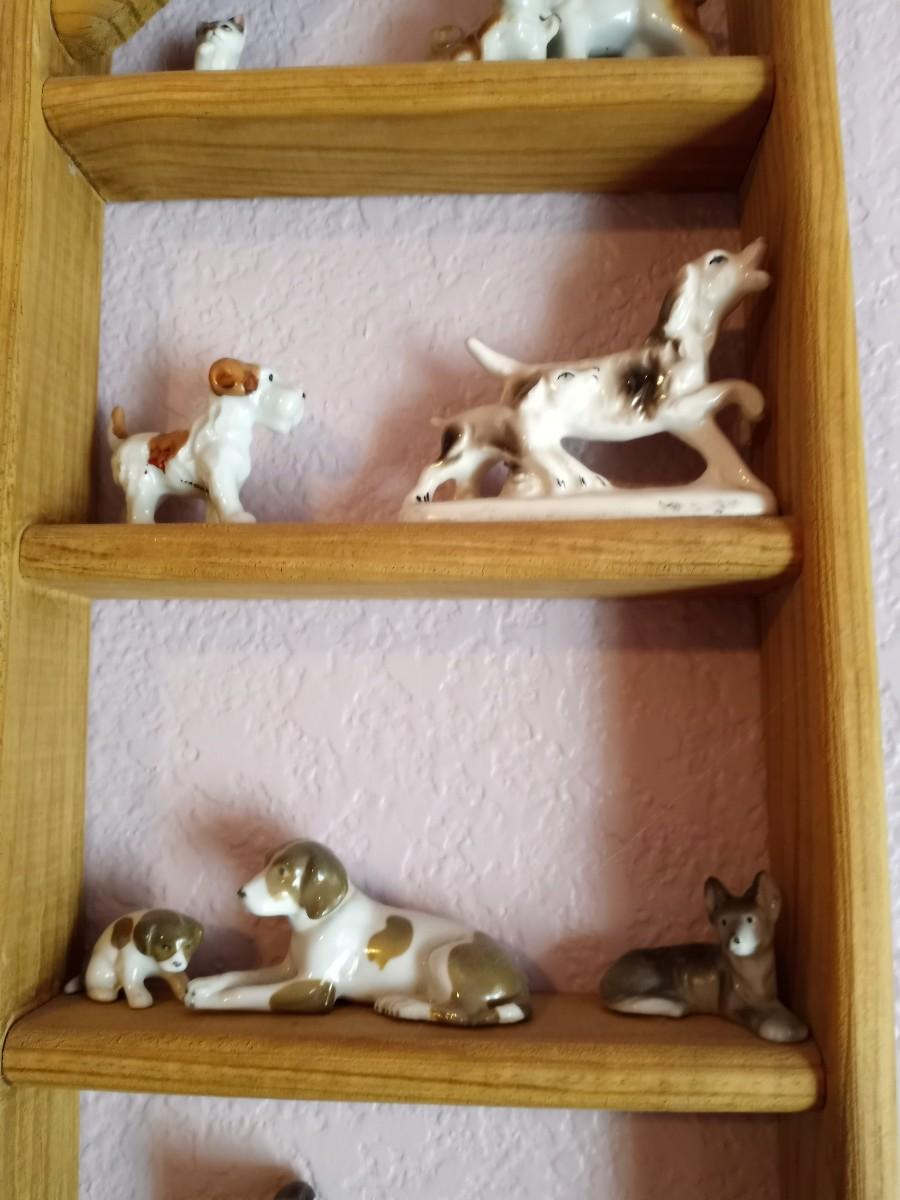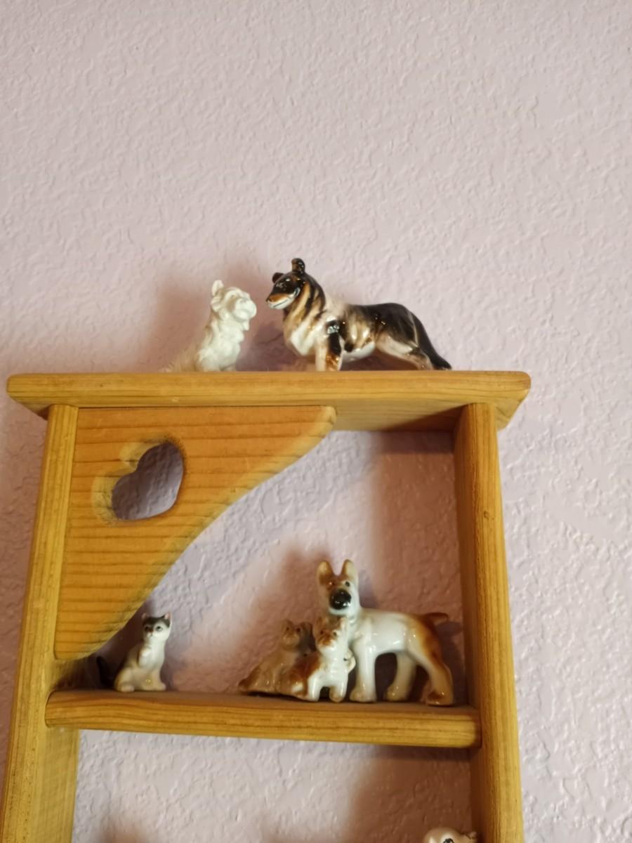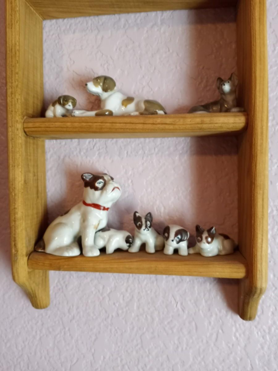 WOODEN SHELF MEASURES APPROX 19X8. WITH SMALL DOG COLLECTION
