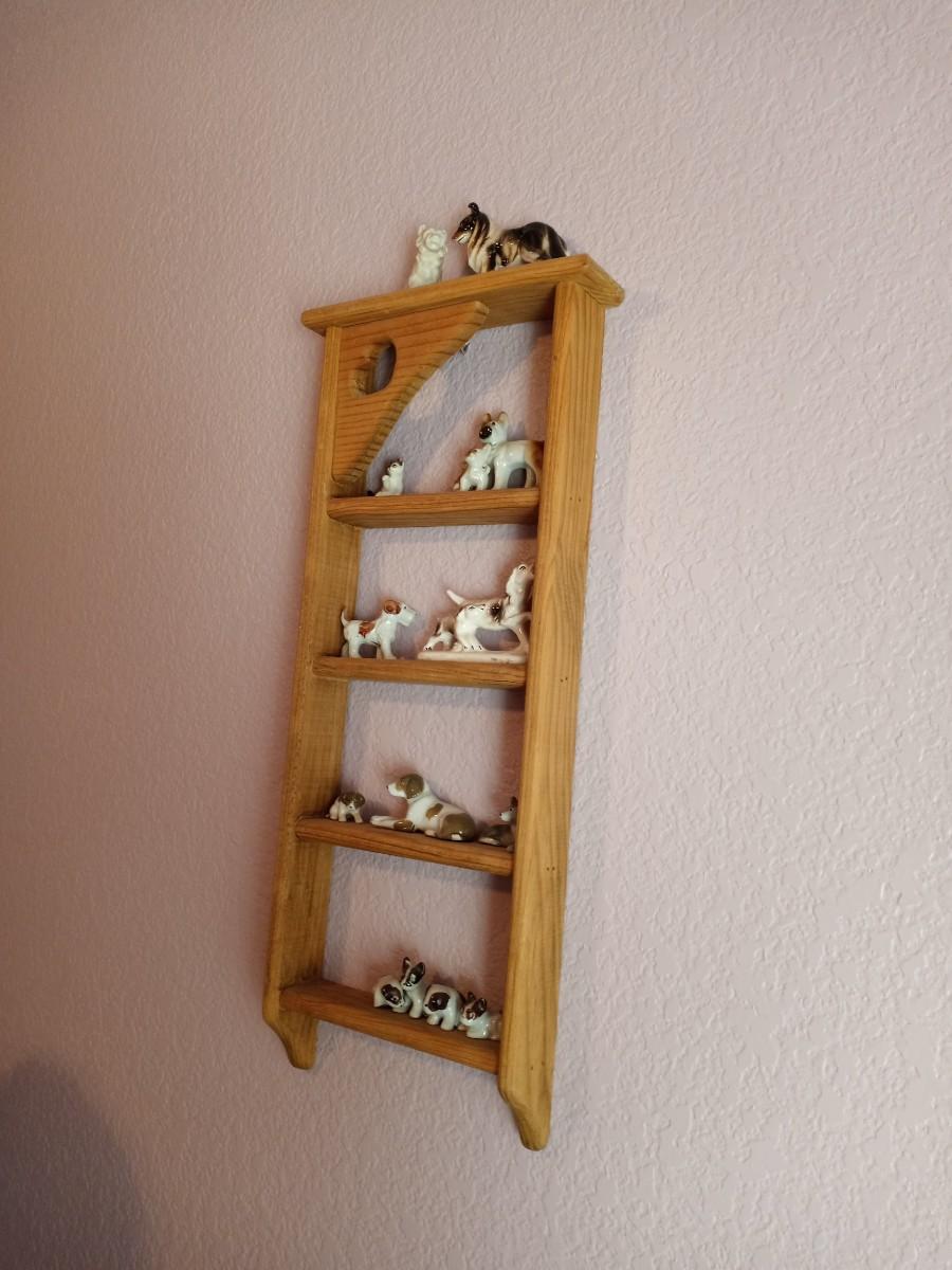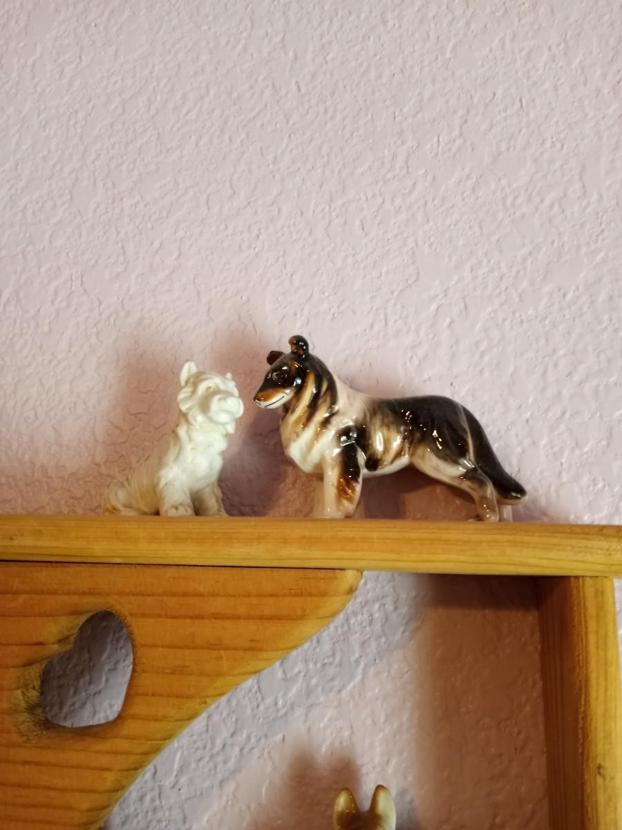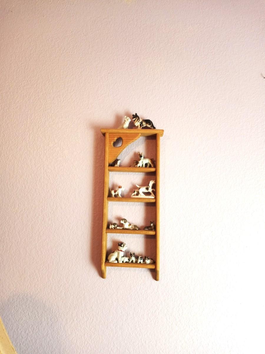 WOODEN SHELF MEASURES APPROX 19X8. WITH SMALL DOG COLLECTION