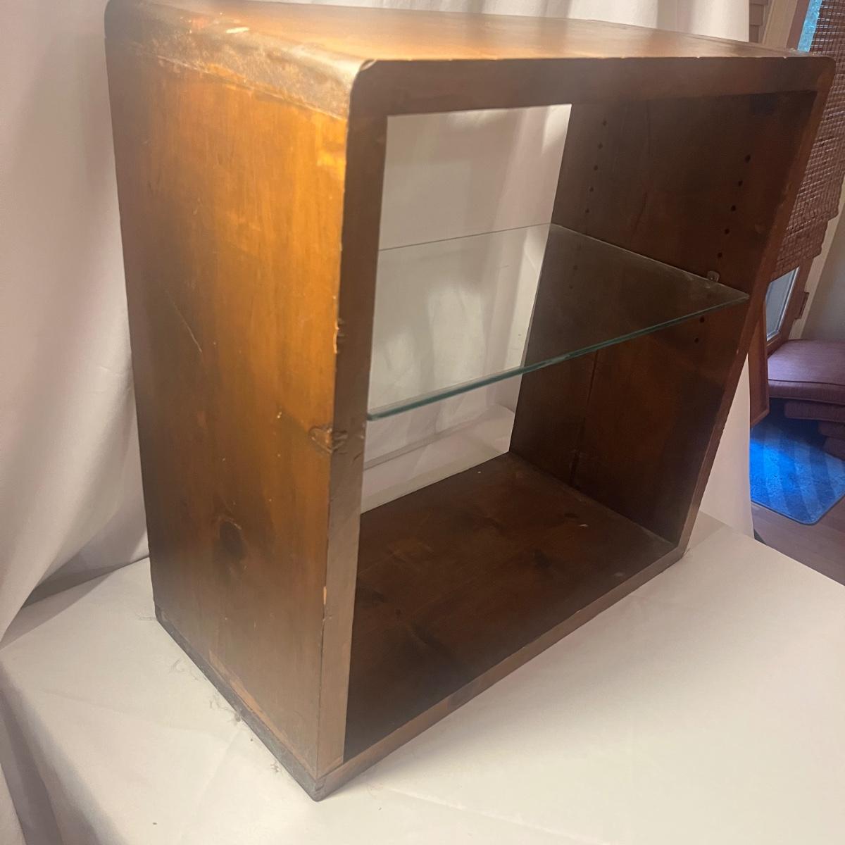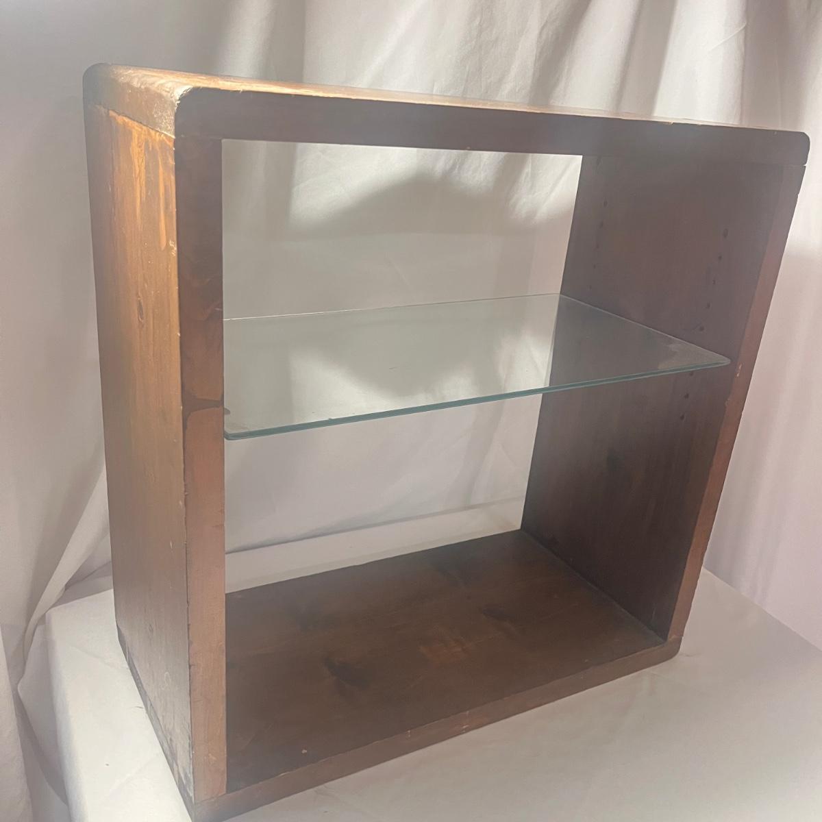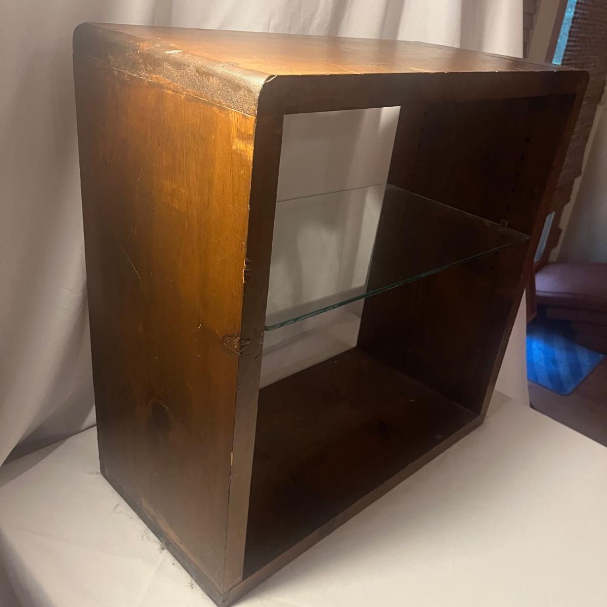 Lot includes a wooden shelf/table with an adjustable glass shelf. Piece measures 24” x 11” x 24”H.