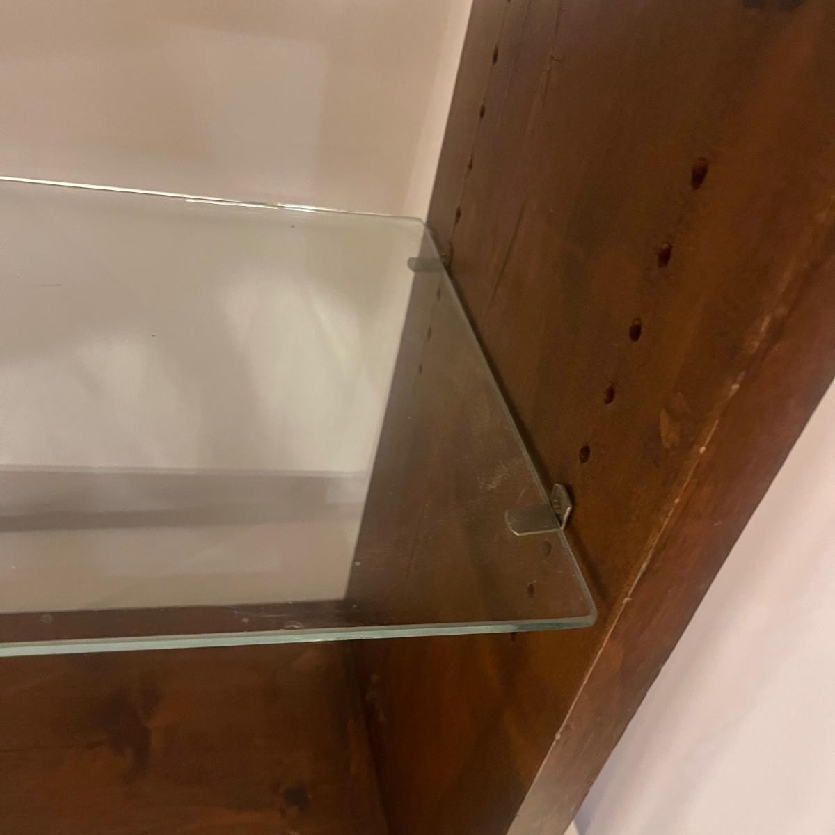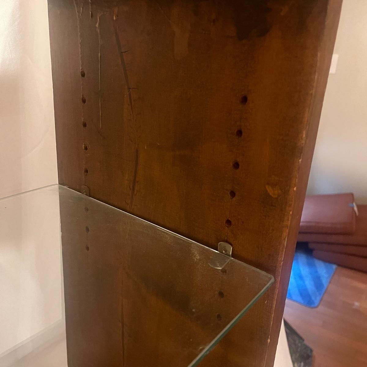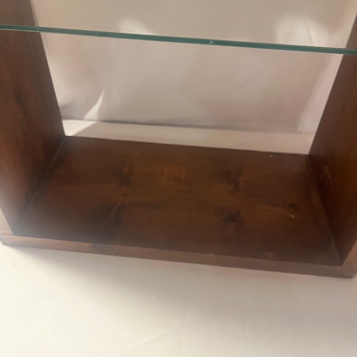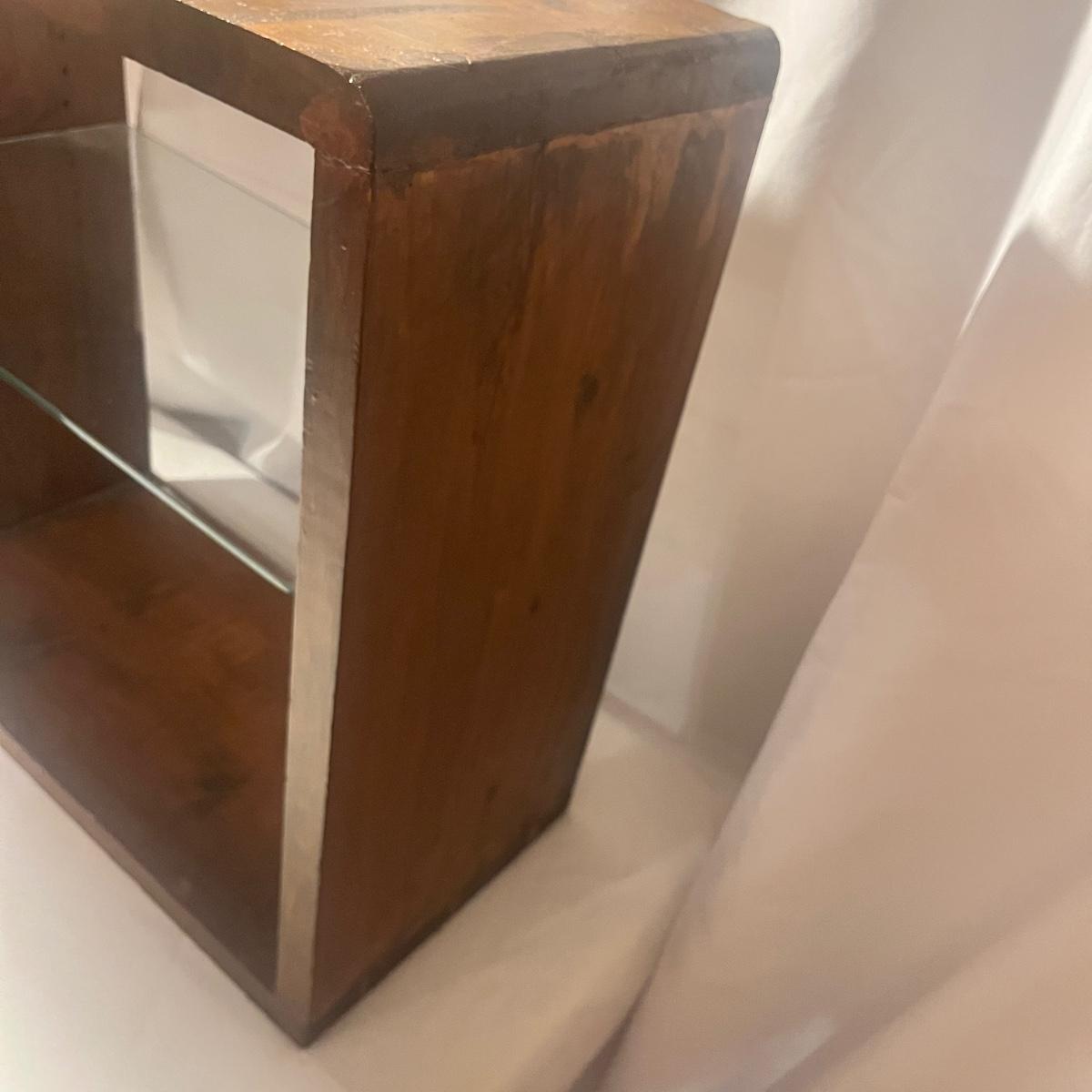 Lot includes a wooden shelf/table with an adjustable glass shelf. Piece measures 24” x 11” x 24”H.