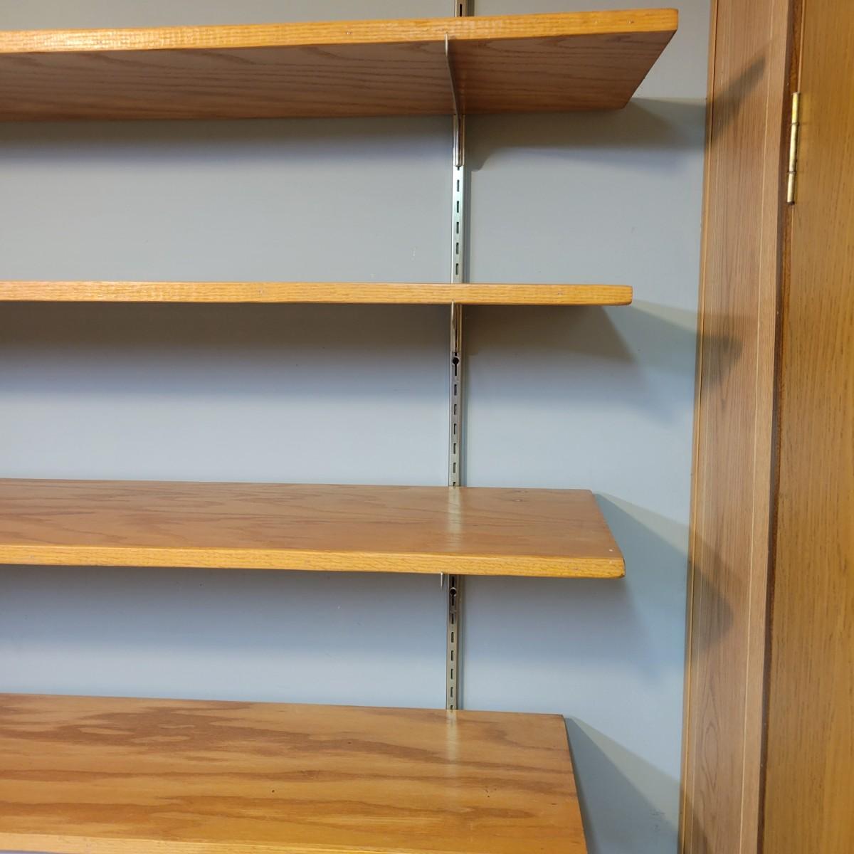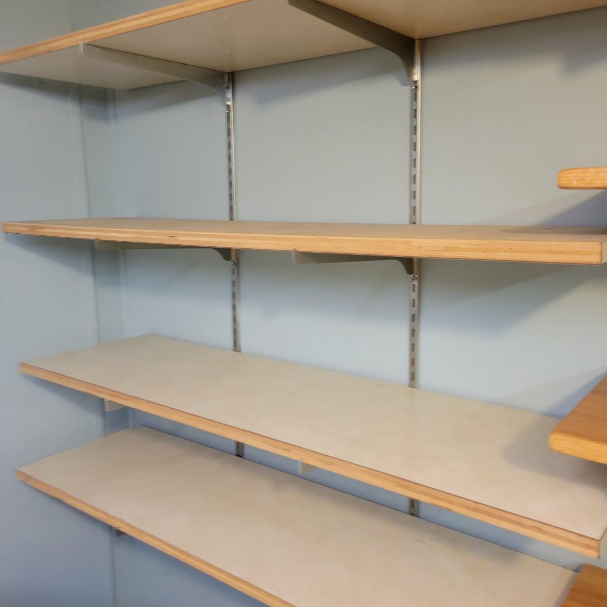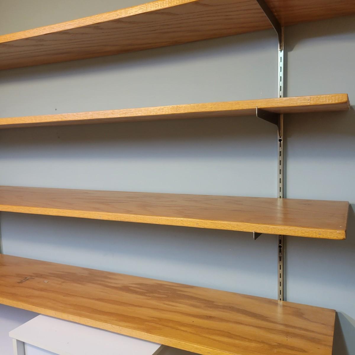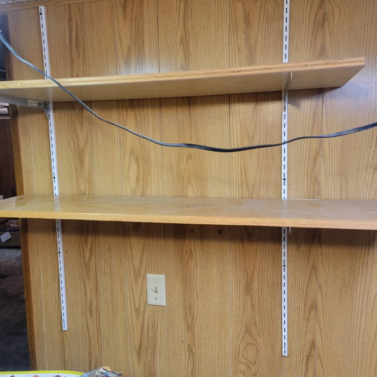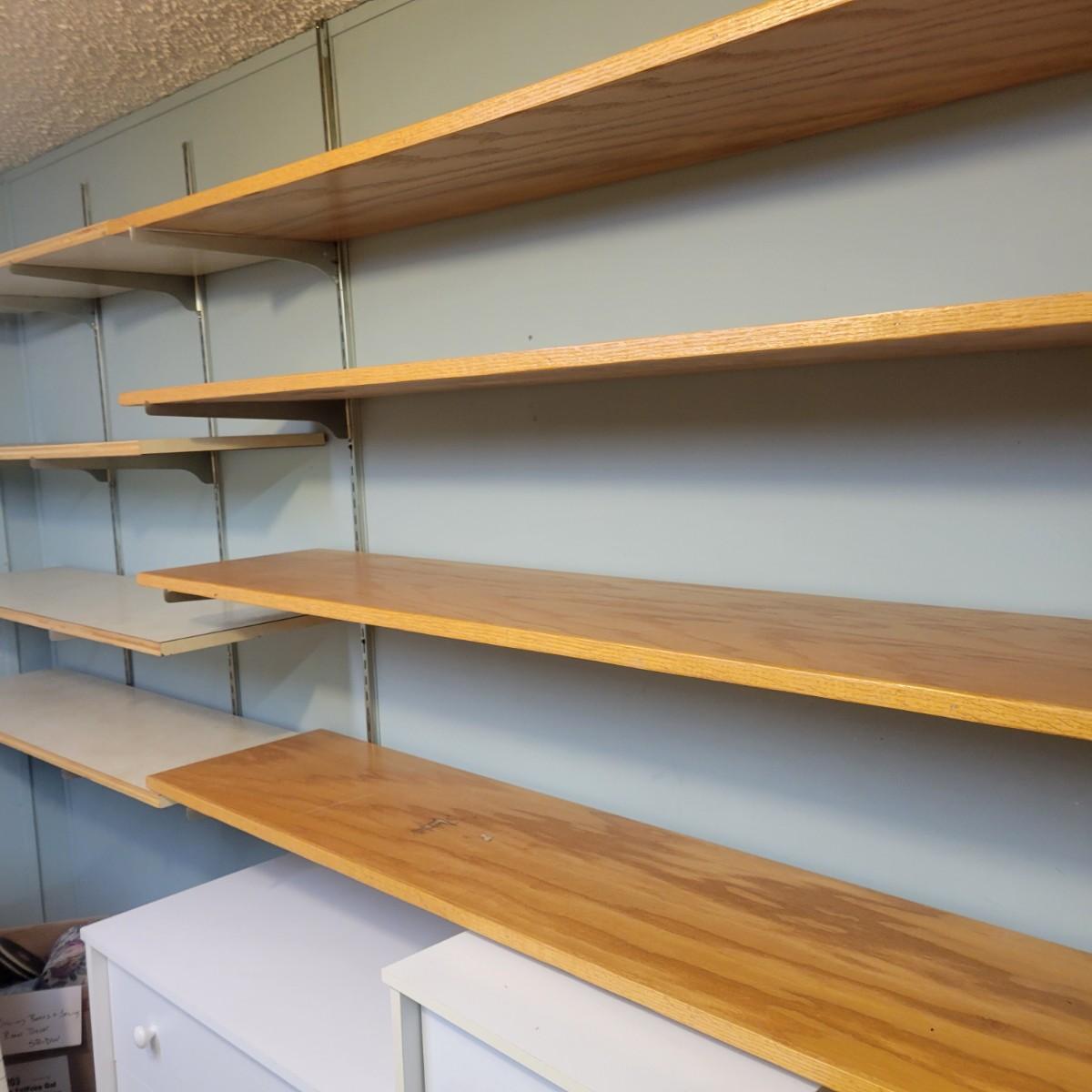 Ten wooden shelves three sets of wall brackets to hang them. Six of the shelves are cabinet grade oak plywood and four of them are plywood with formica on the top. Shelves range in length 56" to 42". Select are 12" deep x .75" tall. Winning bidder will be required to remove brackets from the wall. A Phillips head bit will be needed. Local pickup only