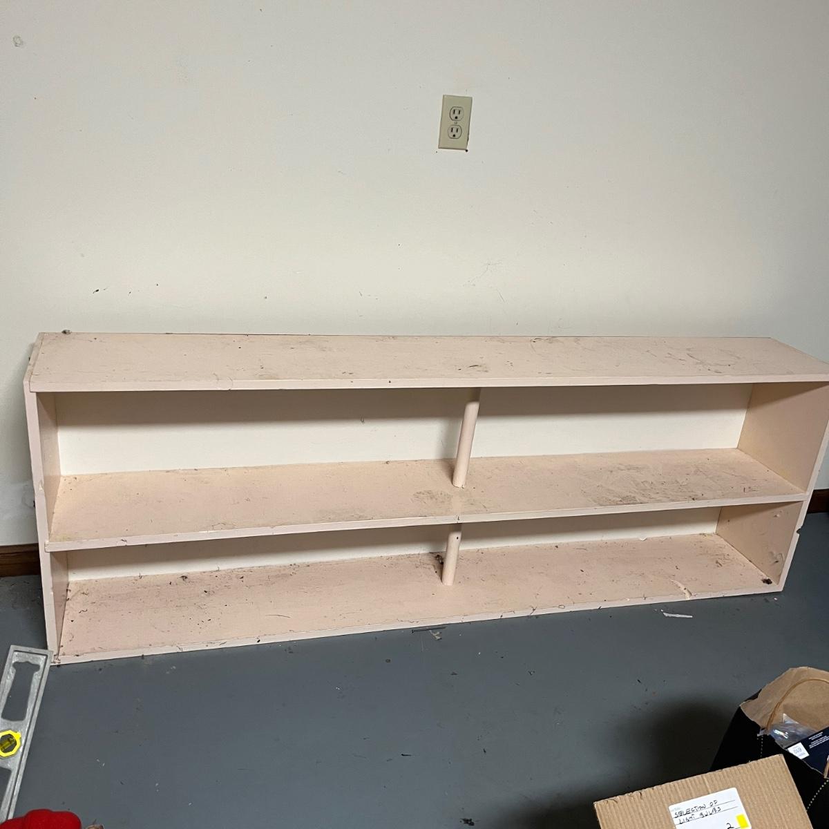 Lot includes a two shelf wooden shelving unit that measures 11.5” x 72” x 24.5”H. Unit has stains and could use a good cleaning.