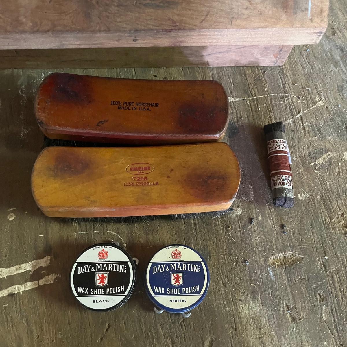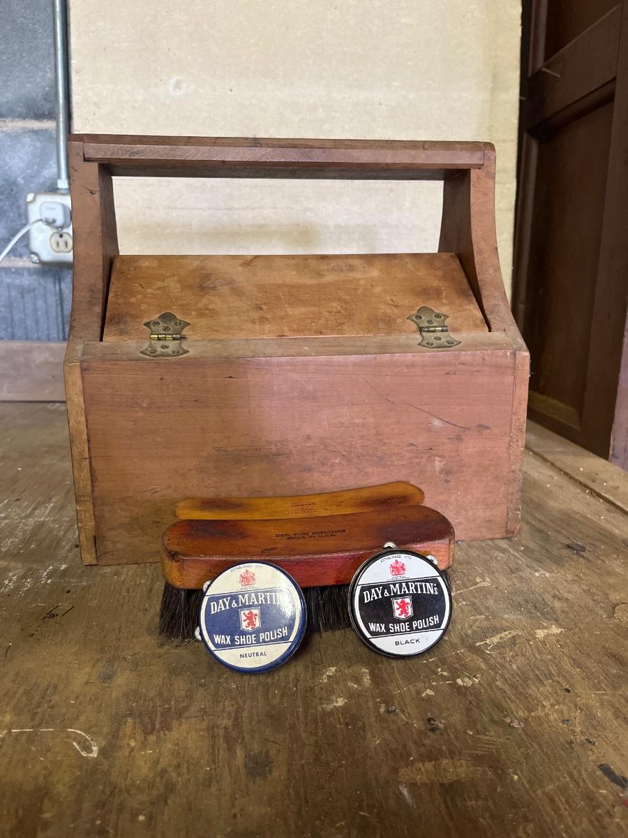 Lot includes a wooden shoeshine box with two horsehair brush, two Carr Day & Martins shoe polish tins. Also includes two small bushes in leather case.