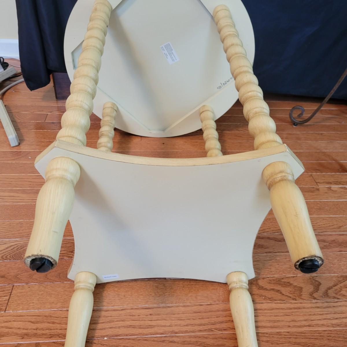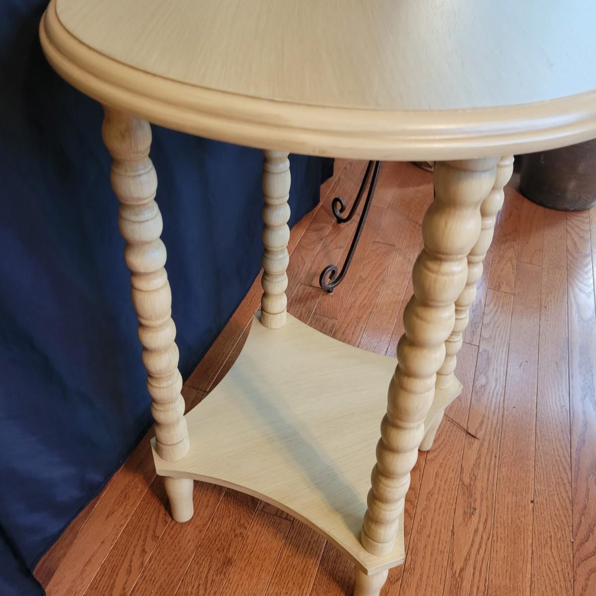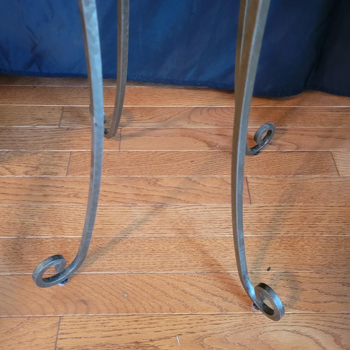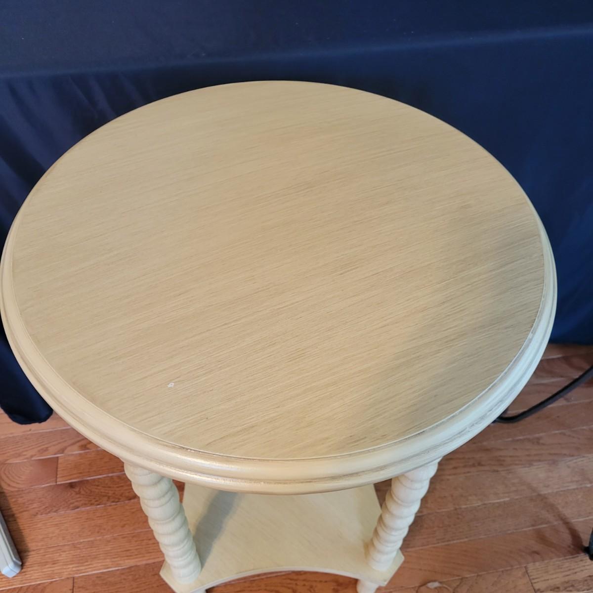 A round, wooden side table that has a rustic, off white finish and scrolled legs. It measures approximately 20.5"D x 28.5"H. Also included is a wrought iron plant stand that has a broken tile surface that measures approximately 13"D x 30"H. Local pickup only
