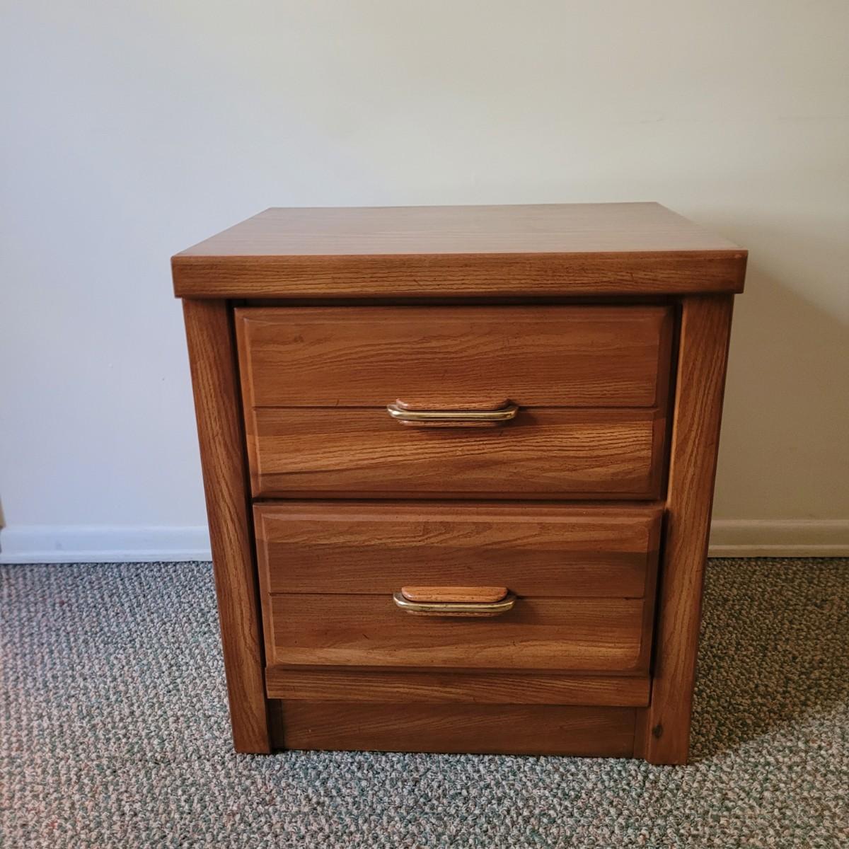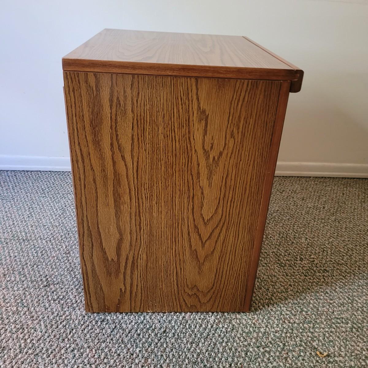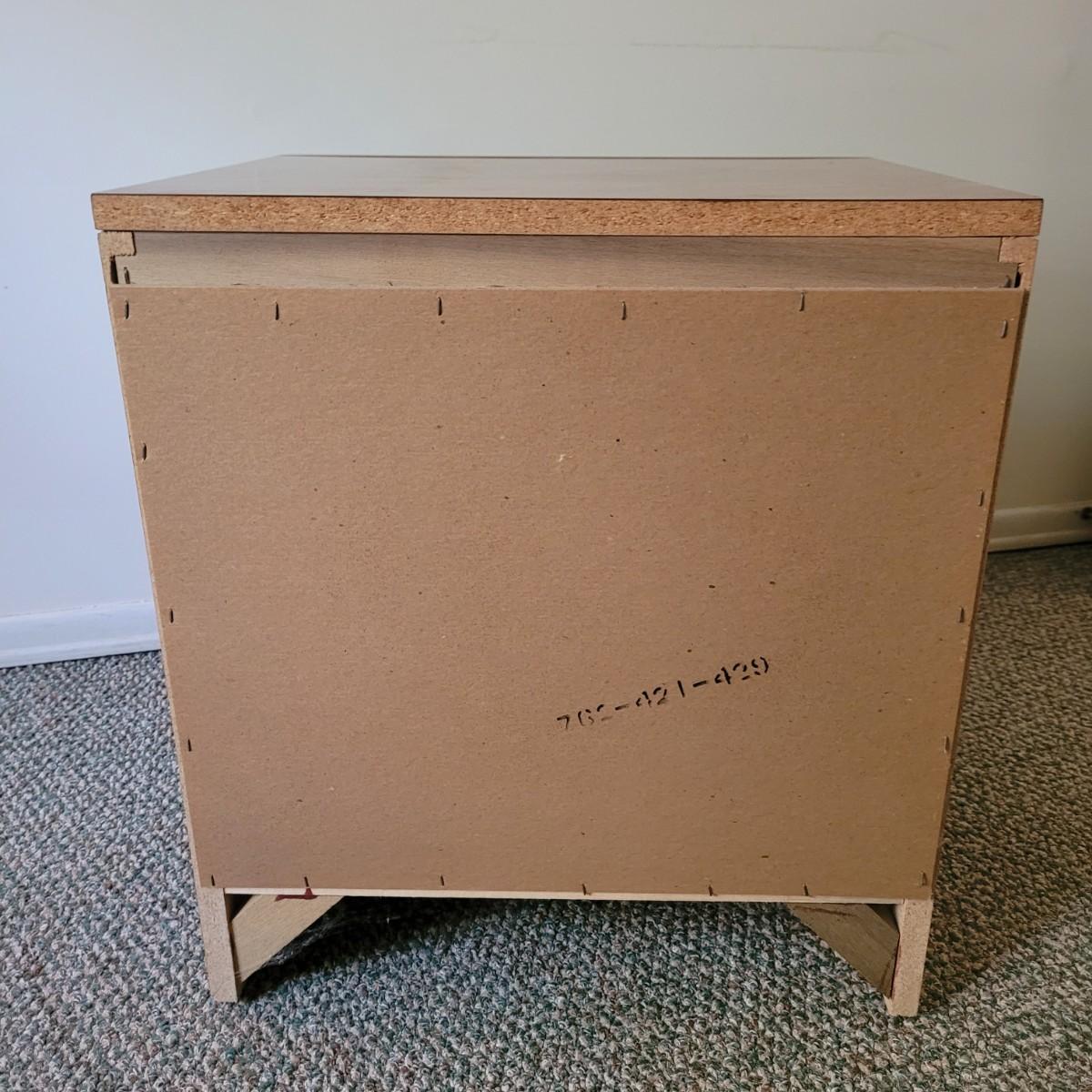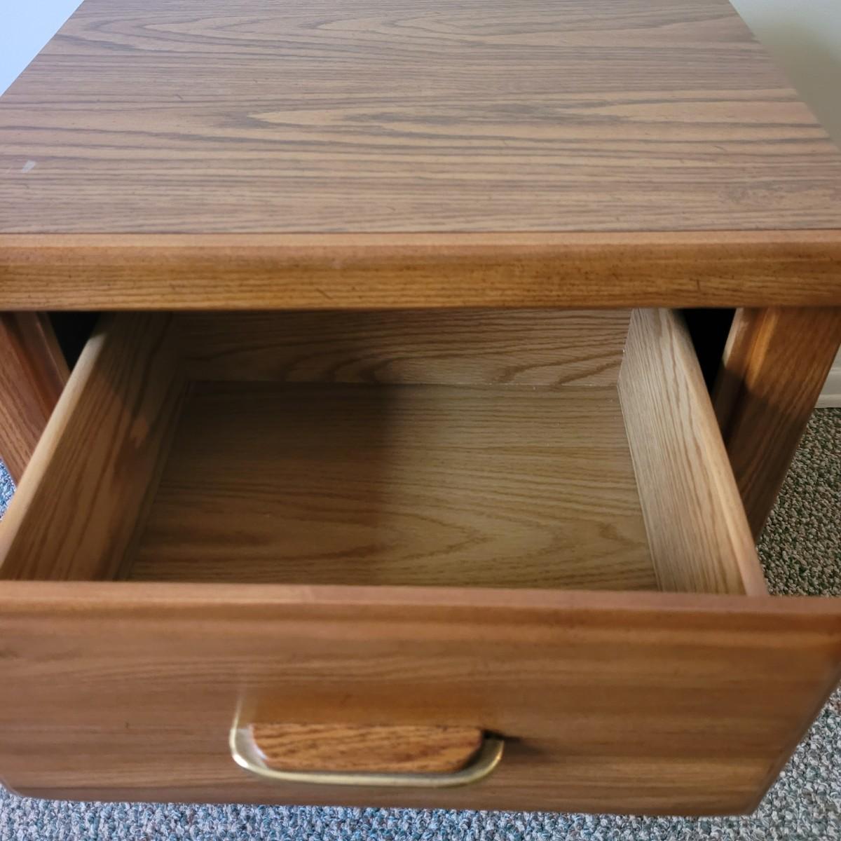 This wooden side table has a veneer coating with what appears to be solid wood drawer fronts. Table measures approximately 20” x 16” x 23”H, with drawer height of 5.5”.