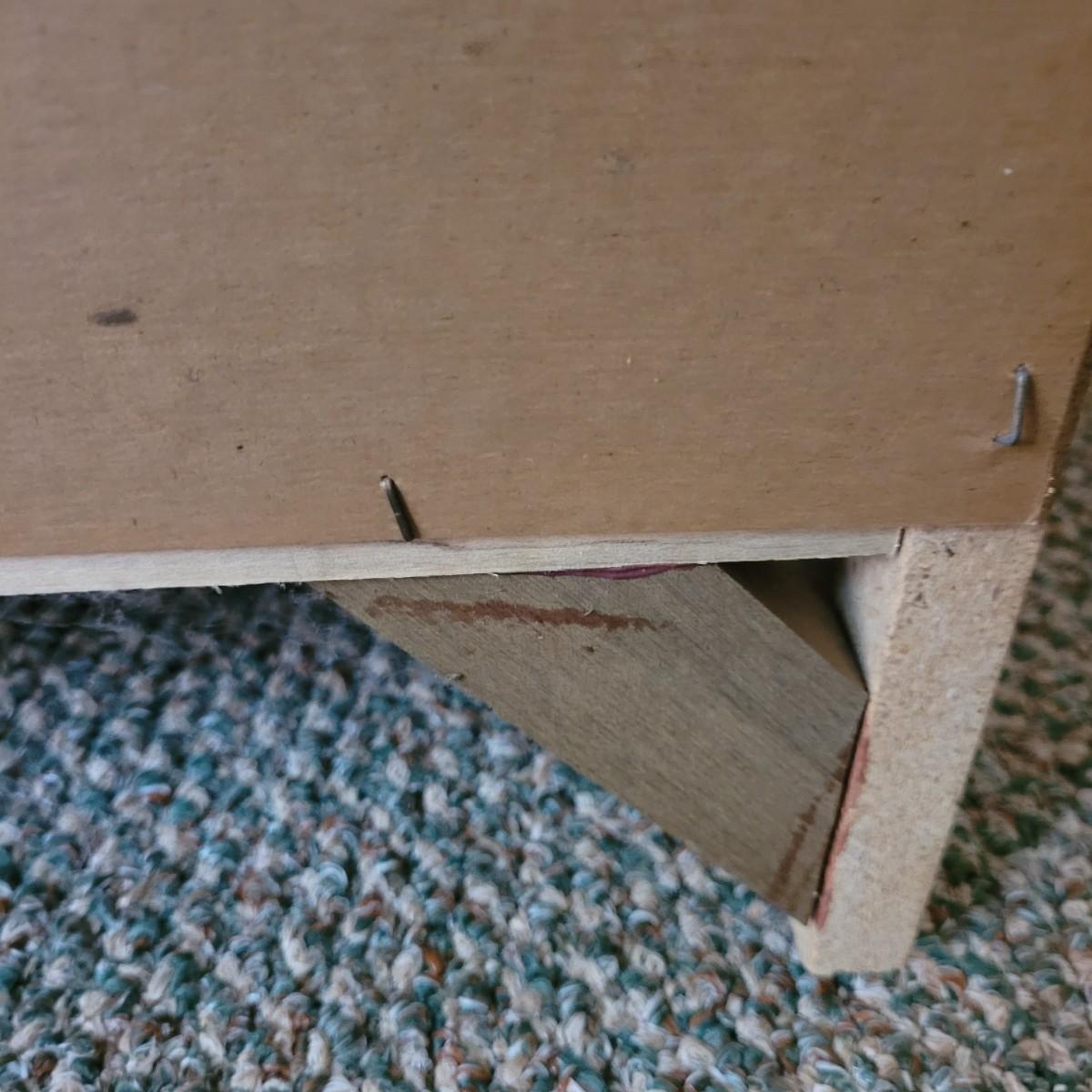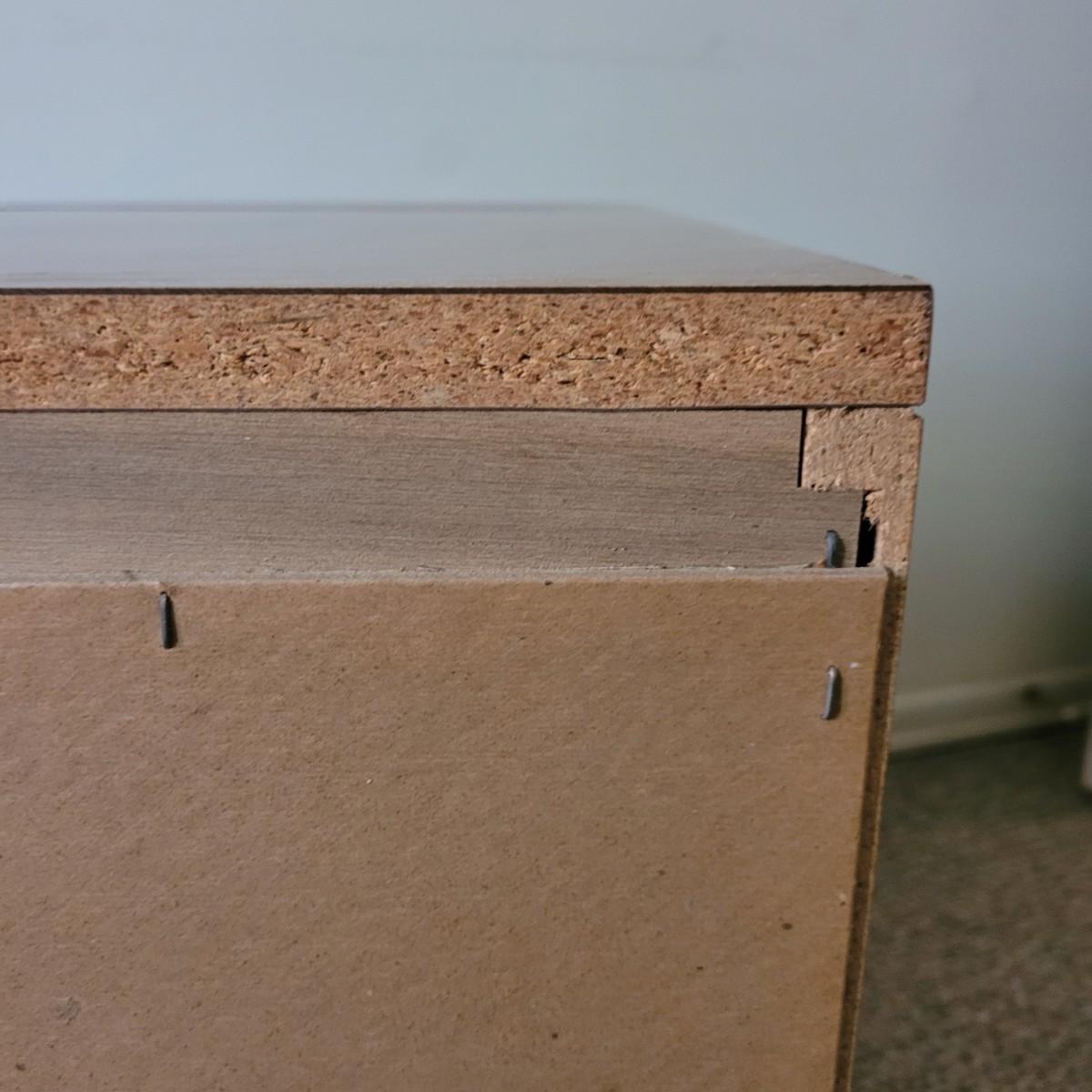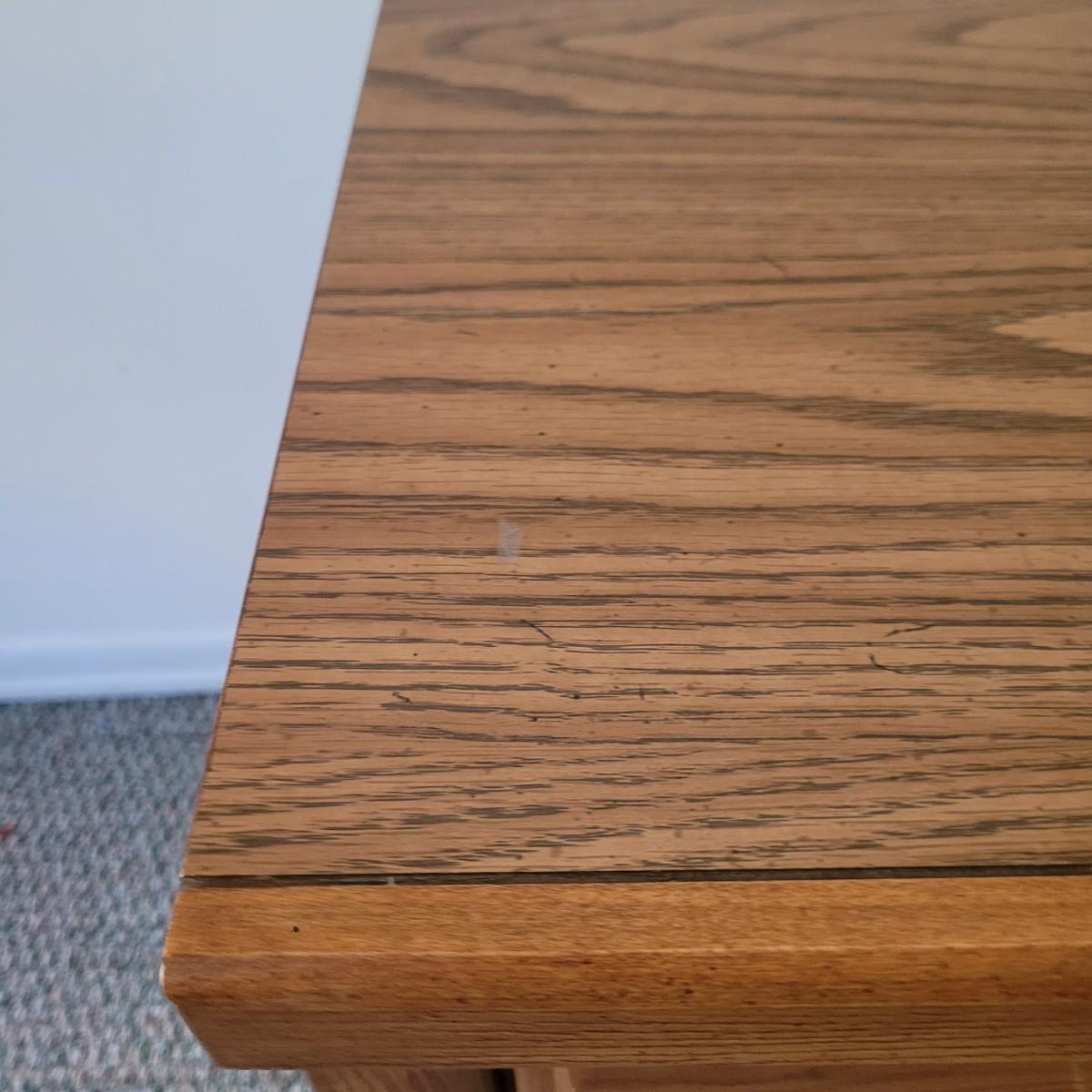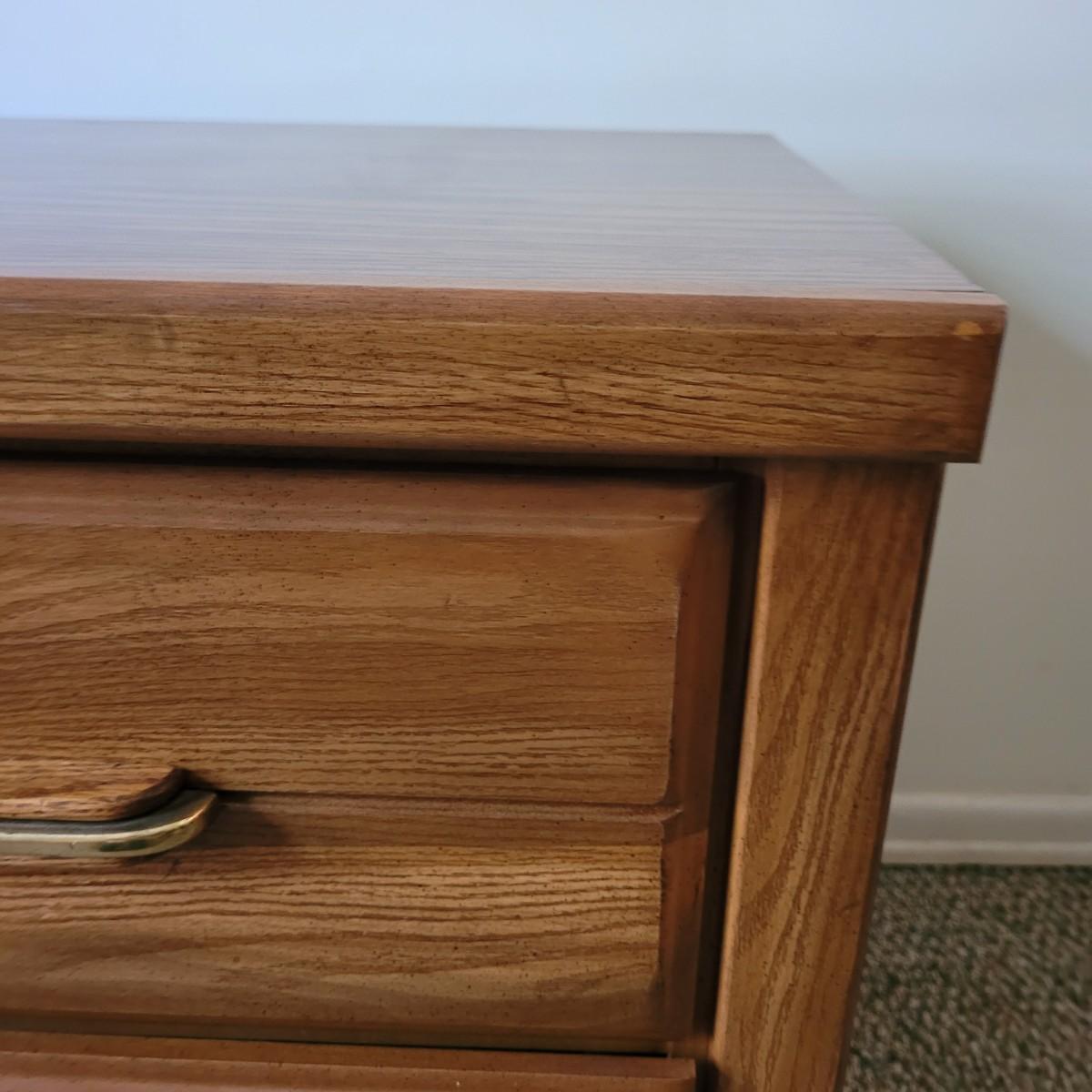 This wooden side table has a veneer coating with what appears to be solid wood drawer fronts. Table measures approximately 20” x 16” x 23”H, with drawer height of 5.5”.