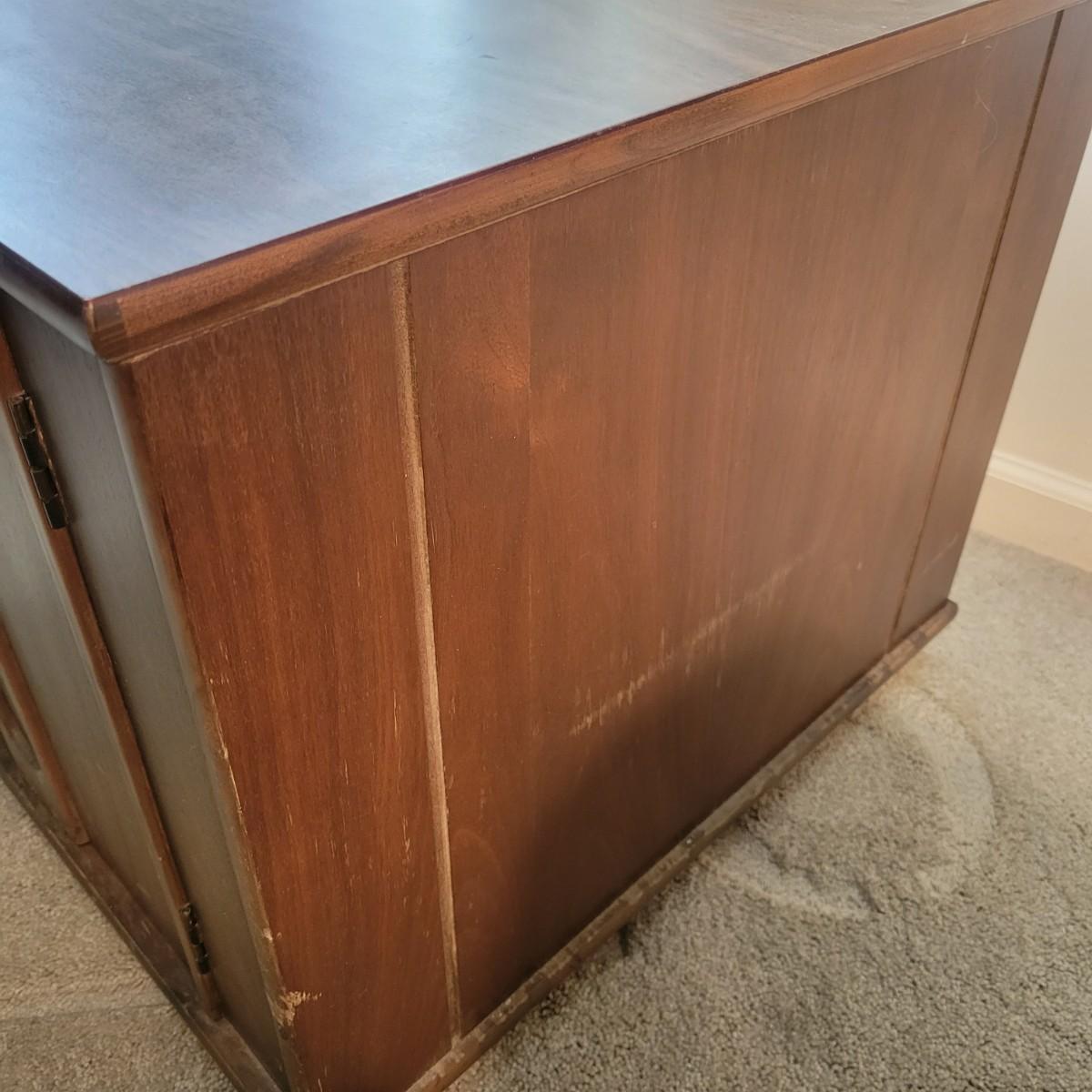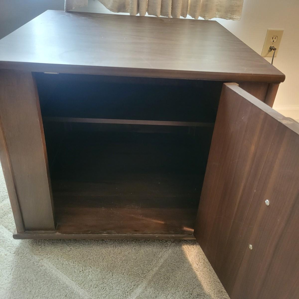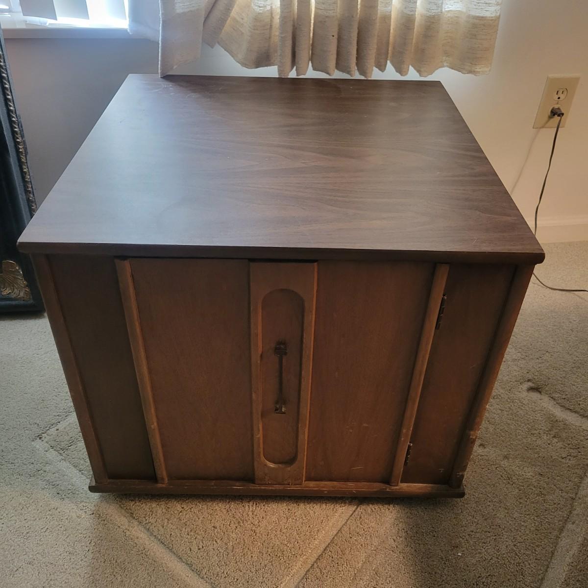 A wooden side table with a single cabinet door. Table is made of wood with a laminate type surface. It has a brass door pull and some minor damage. Measures approximately 23.5" x 23.5" x 20"H. Local pickup only. Winning bidder must bring assistance to help move and load this item due to its weight and/or size.