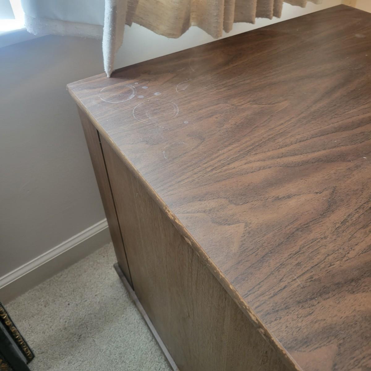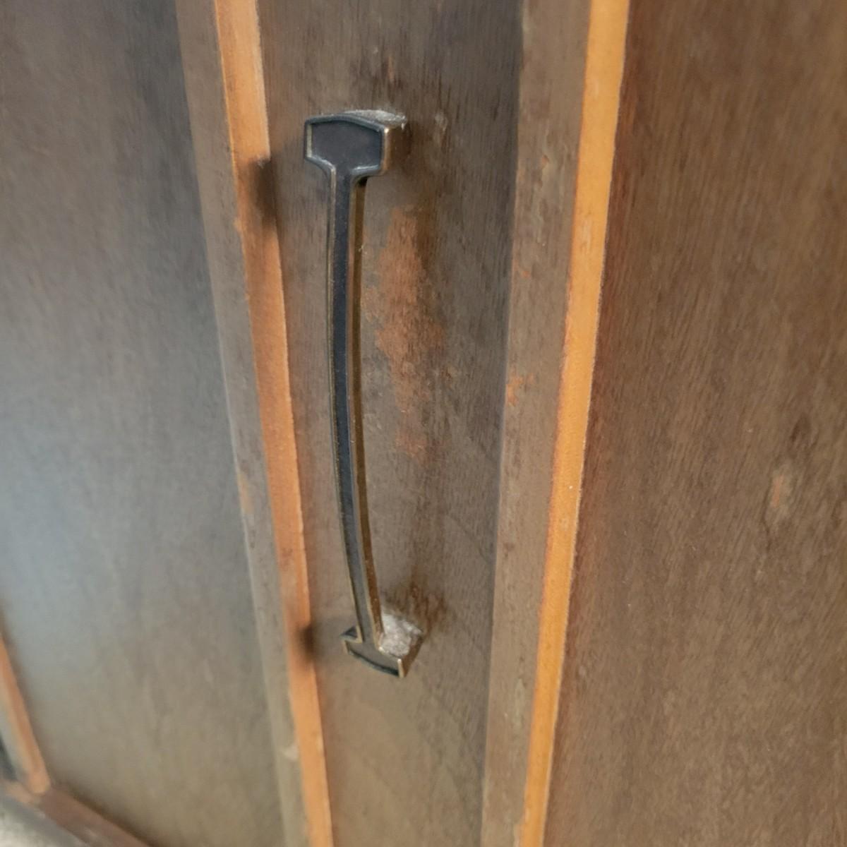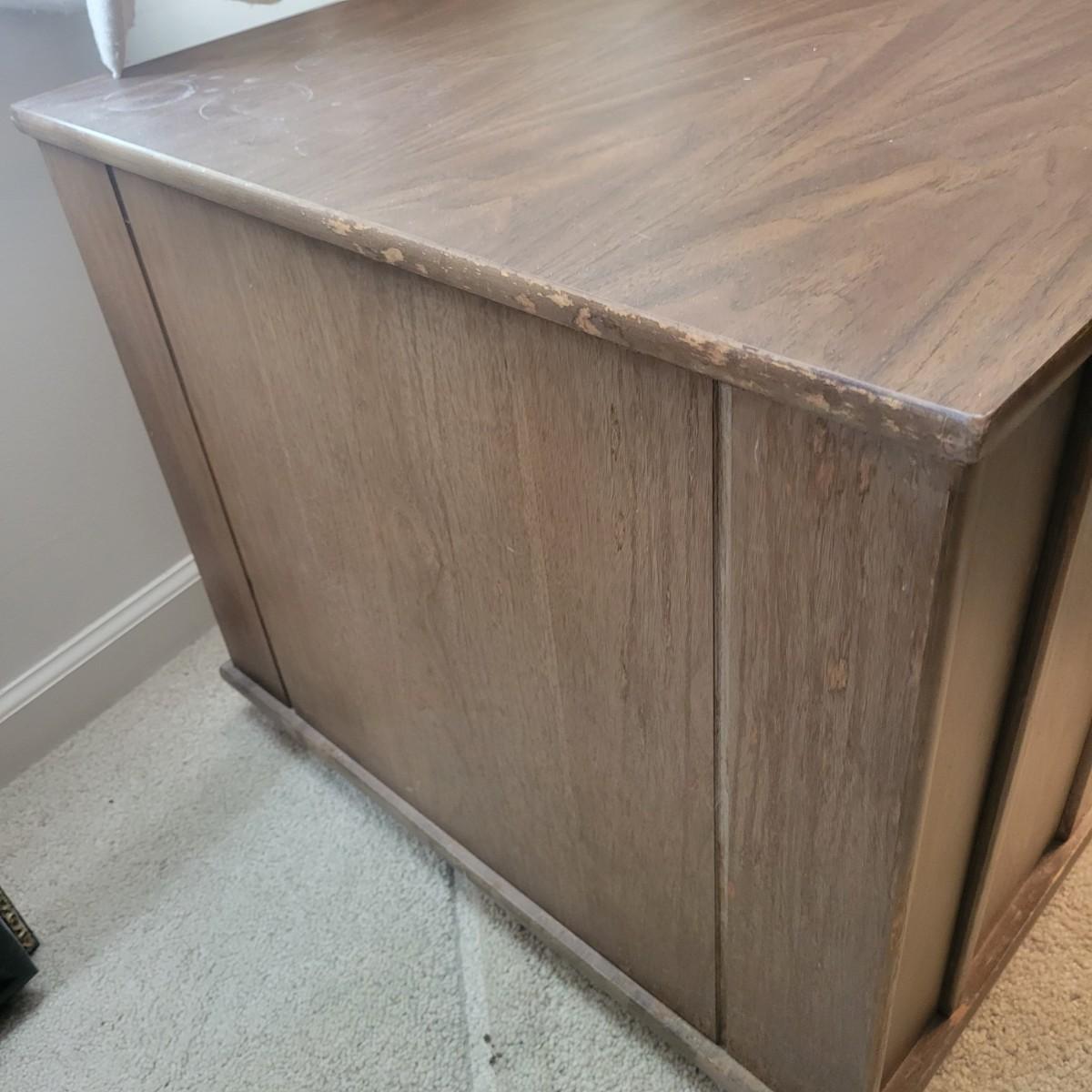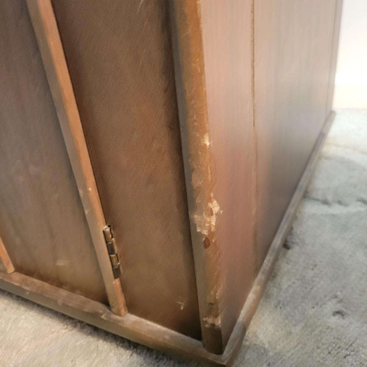A wooden side table with a single cabinet door. Table is made of wood with a laminate type surface. It has a brass door pull and some minor damage. Measures approximately 23.5" x 23.5" x 20"H. Local pickup only. Winning bidder must bring assistance to help move and load this item due to its weight and/or size.