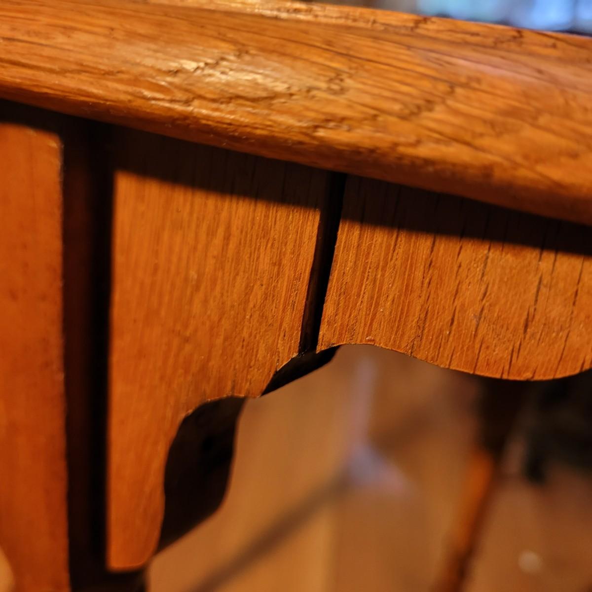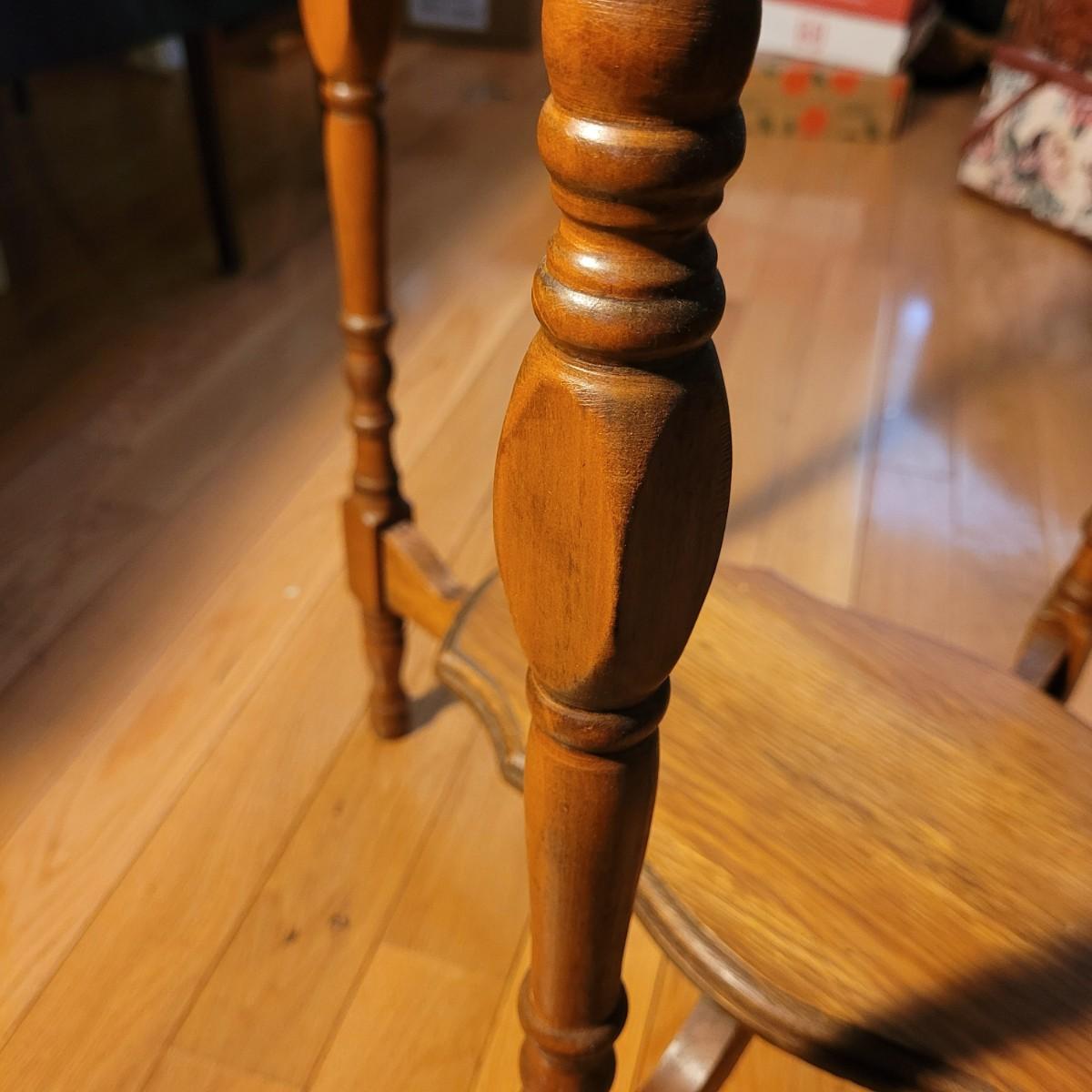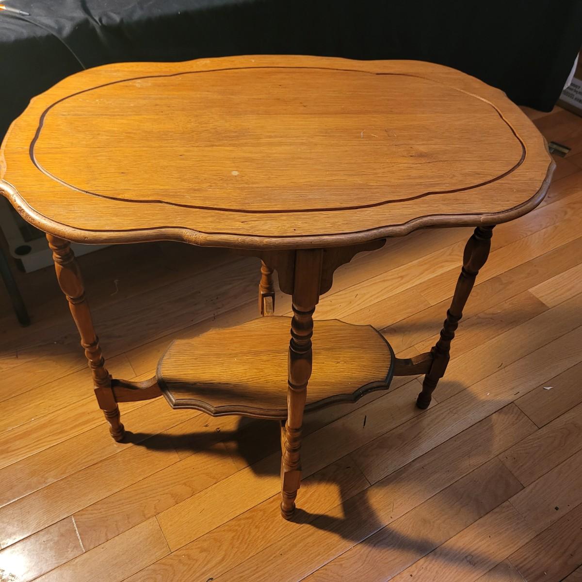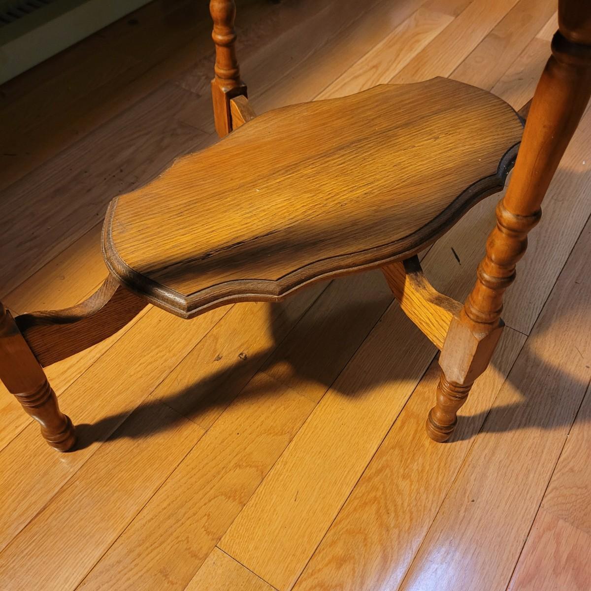 This carved wooden side table has a lower shelf for more display and storage. Legs are slightly wobbly, and wood is split at top of one leg (see photos). Measures approximately 29.5” x 19” x 29”H. Local pick up only.