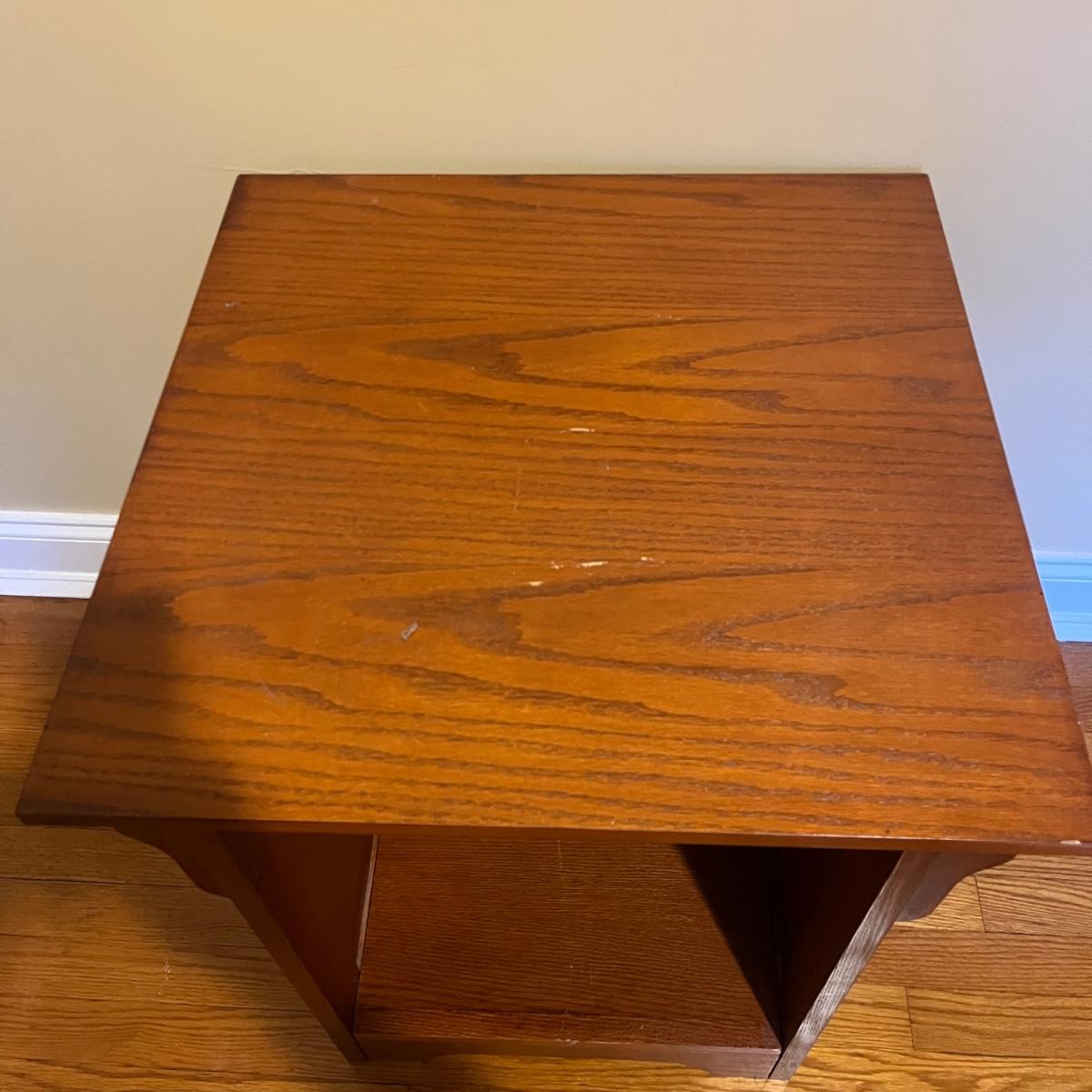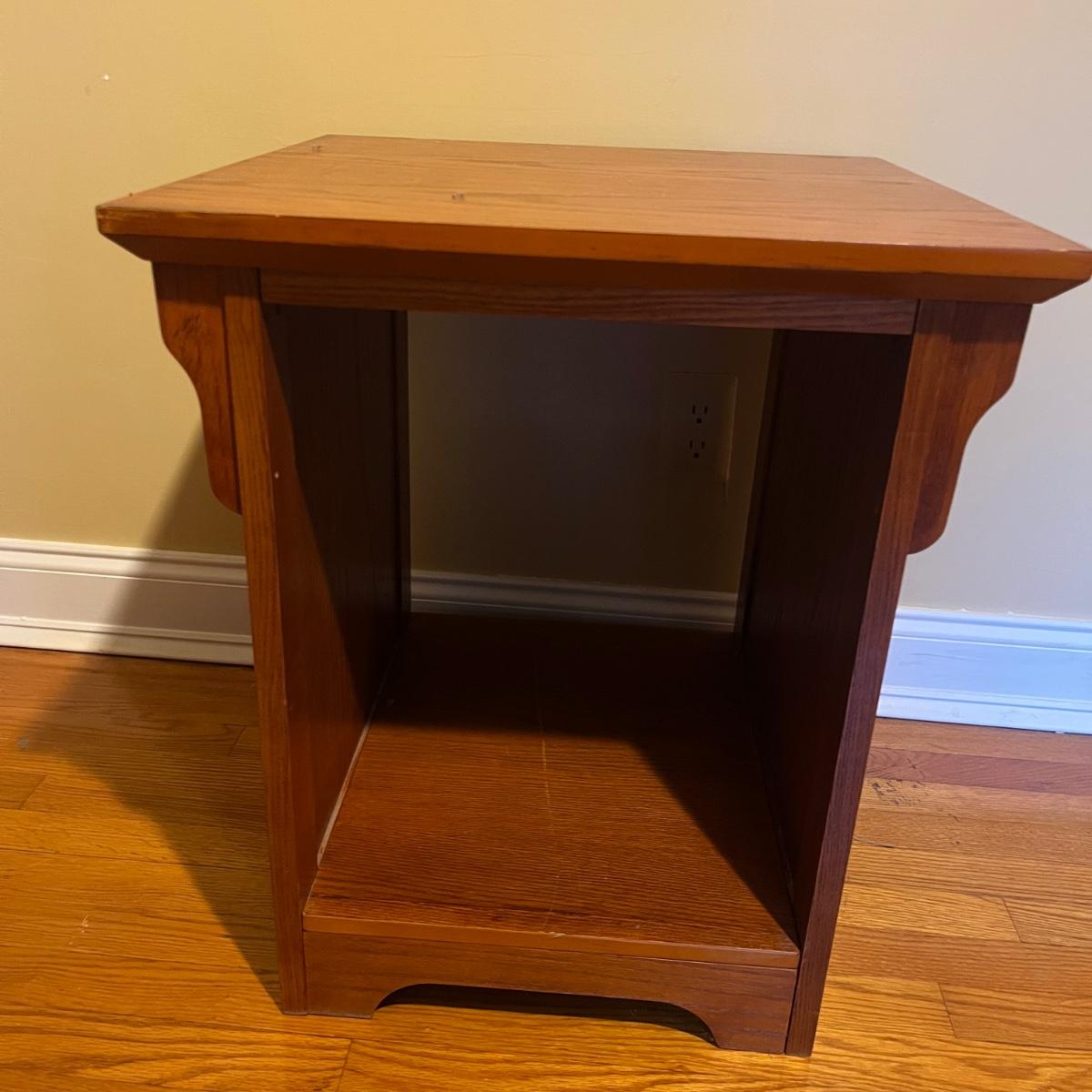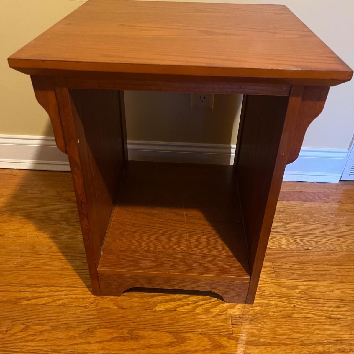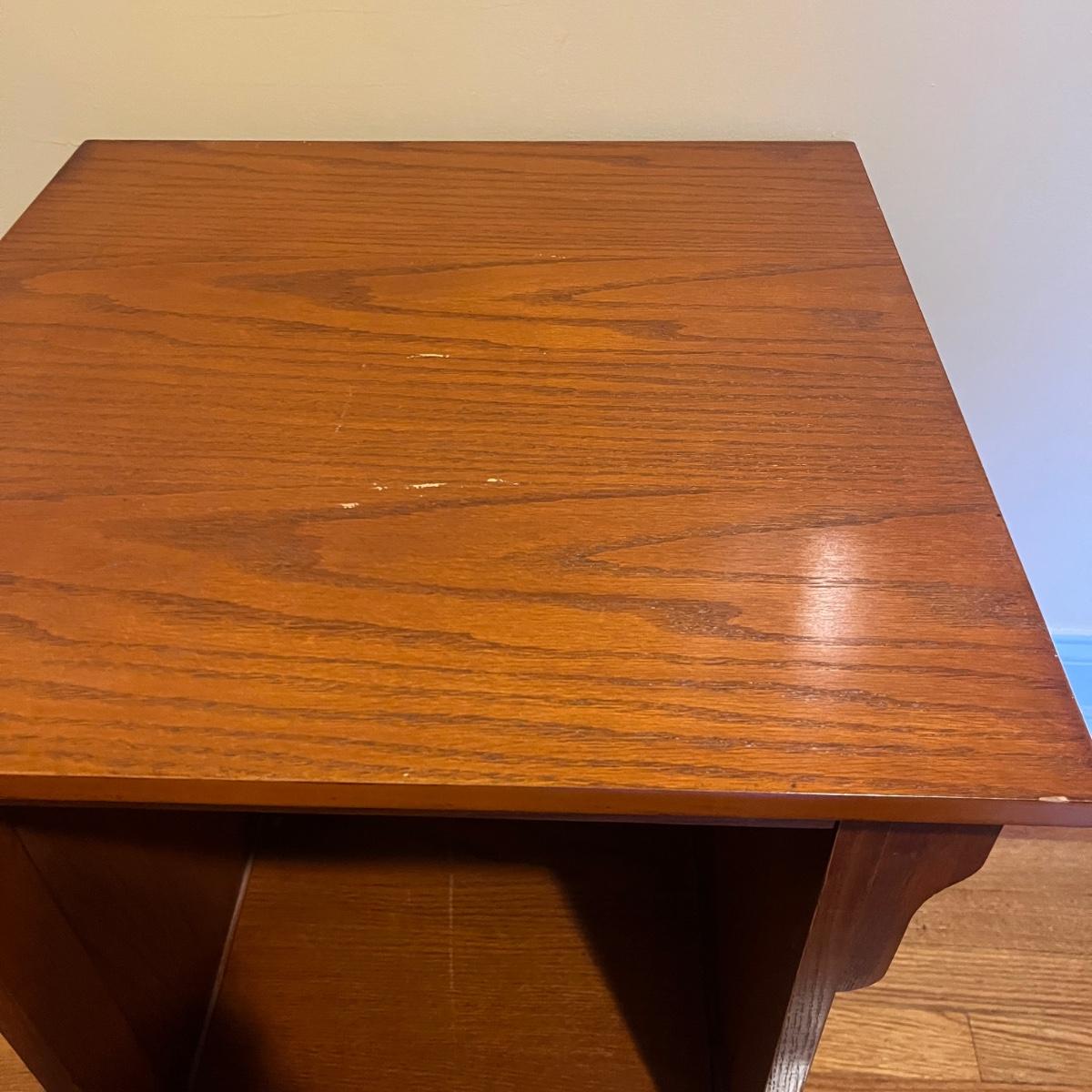 Lot includes an open-bottom wooden side table. Table measures 21” x 21” x 24”H. Piece appears to be pressed wood. Top has scratches, see pictures.