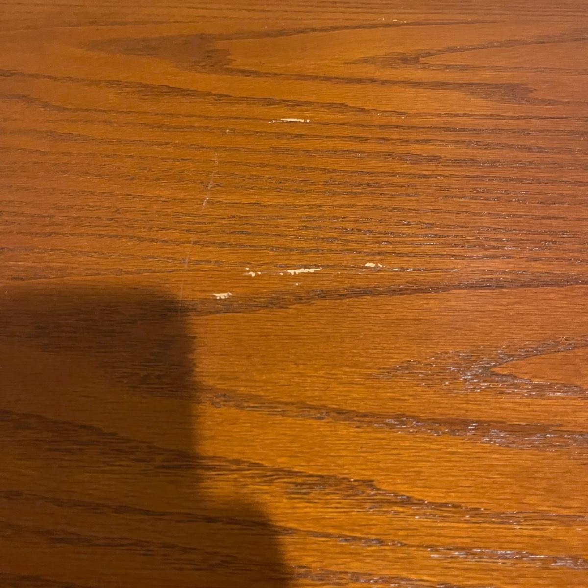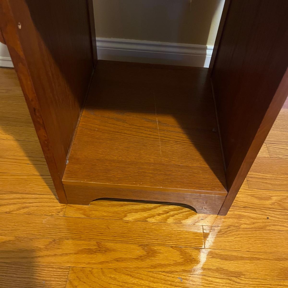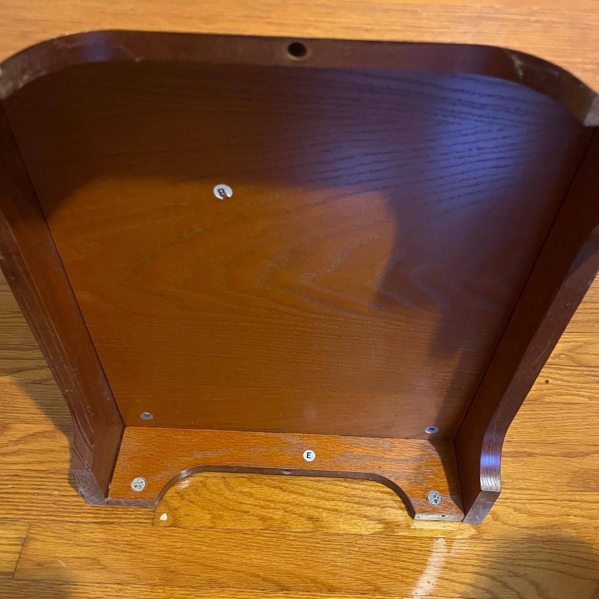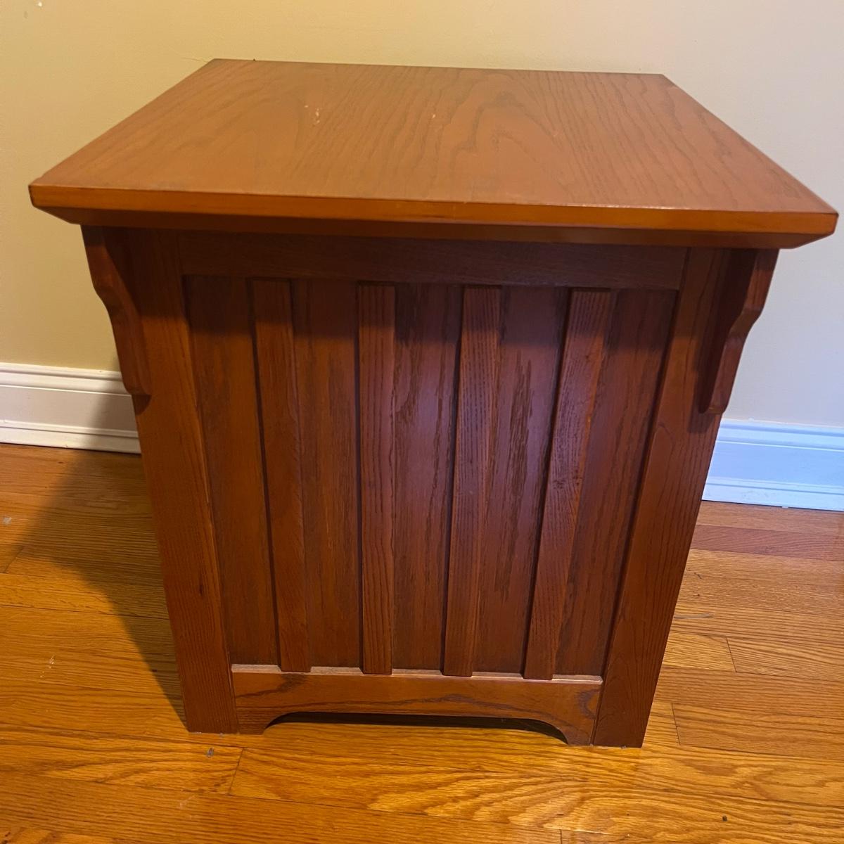 Lot includes an open-bottom wooden side table. Table measures 21” x 21” x 24”H. Piece appears to be pressed wood. Top has scratches, see pictures.