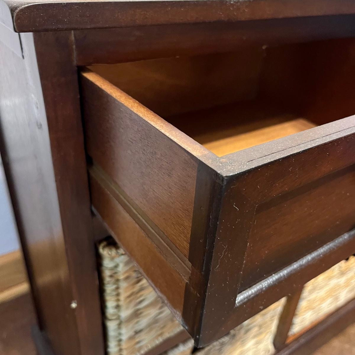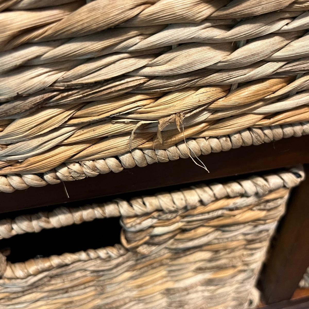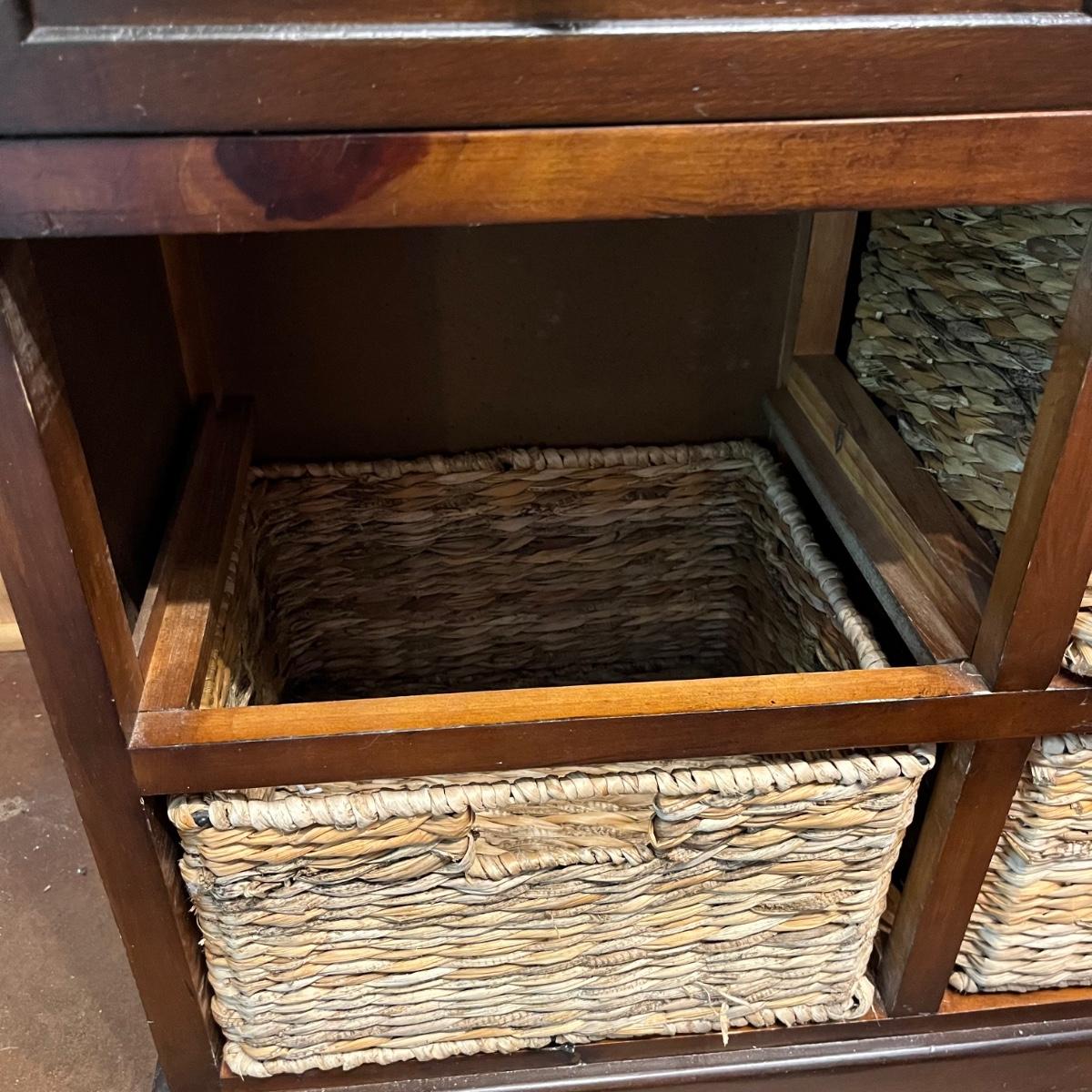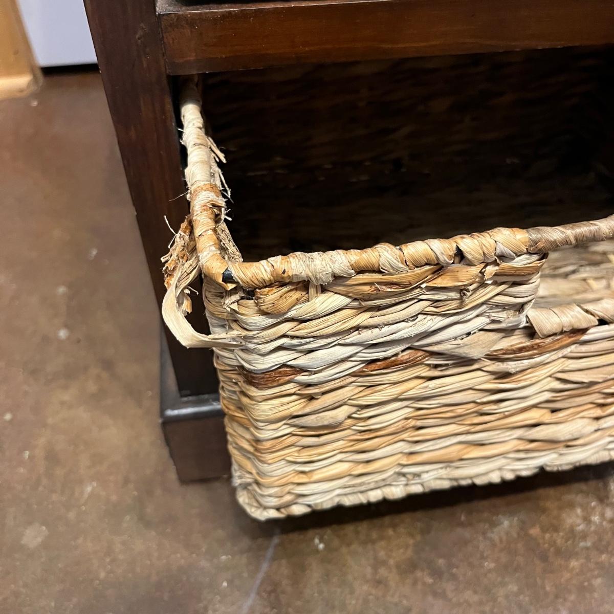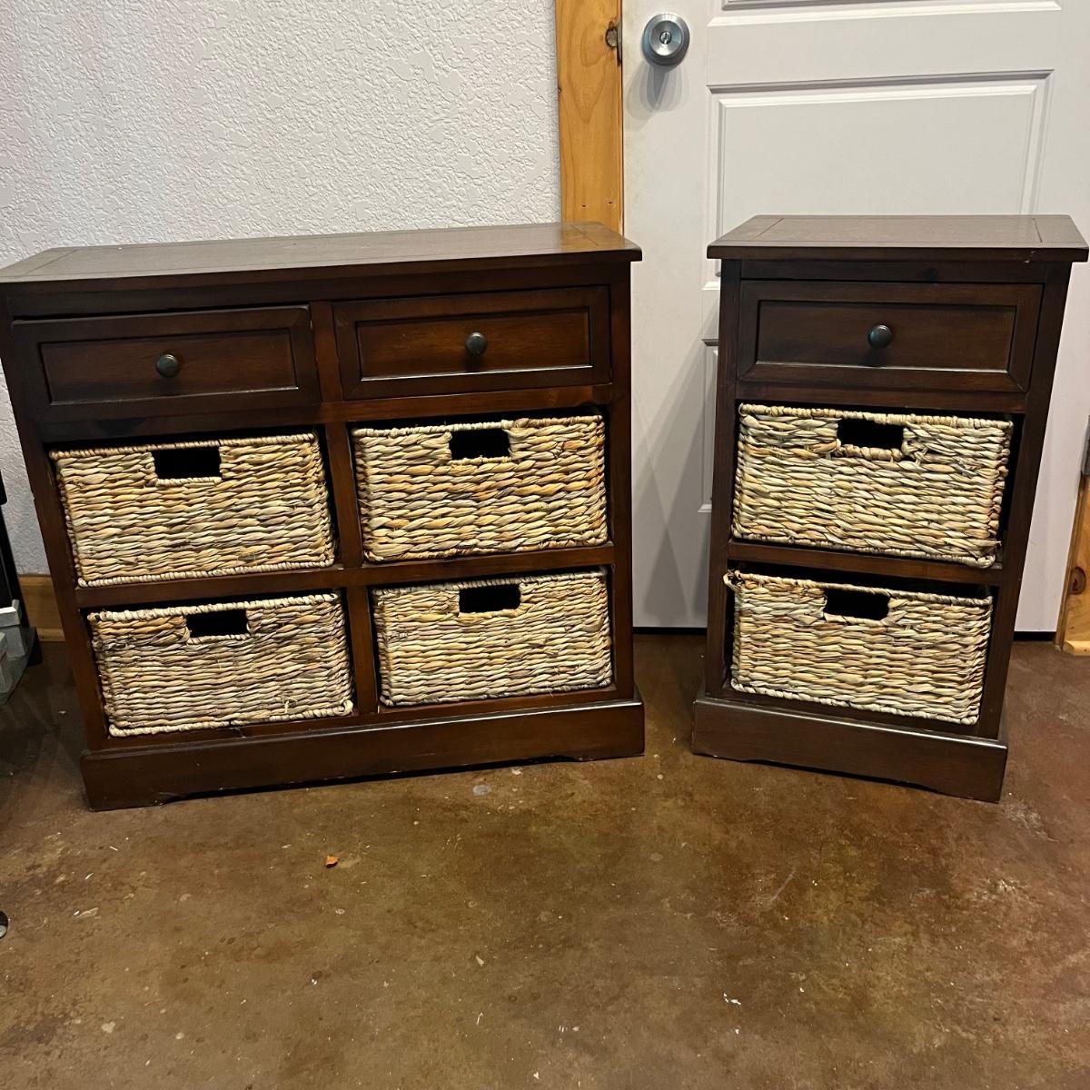 This lot includes one larger side table with ix drawers and one smaller matching side table with three drawers. The tables are made of a lightweight wood and have woven baskets. The baskets are removable. Some of the baskets have snags (see photos). The smaller table has a small chip in the wood on the back and the large table has some tiny scratches on the top (see photos). They are a bit dusty. The larger table measures about 30” x 13” x 27.5”H. Local pickup only.