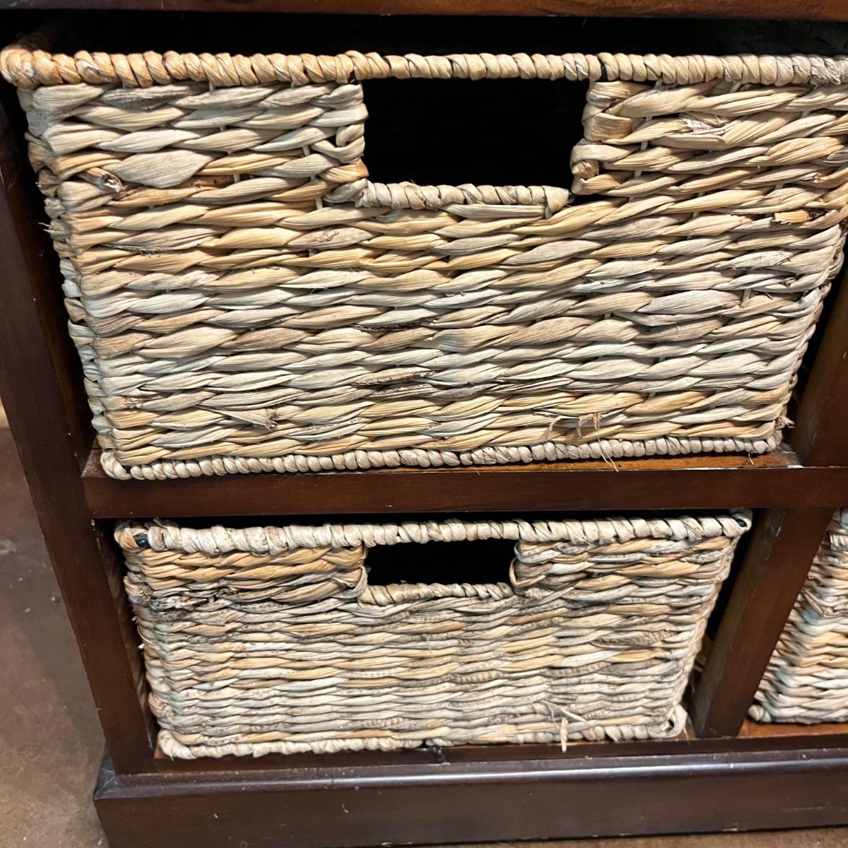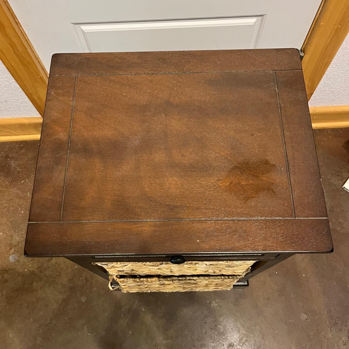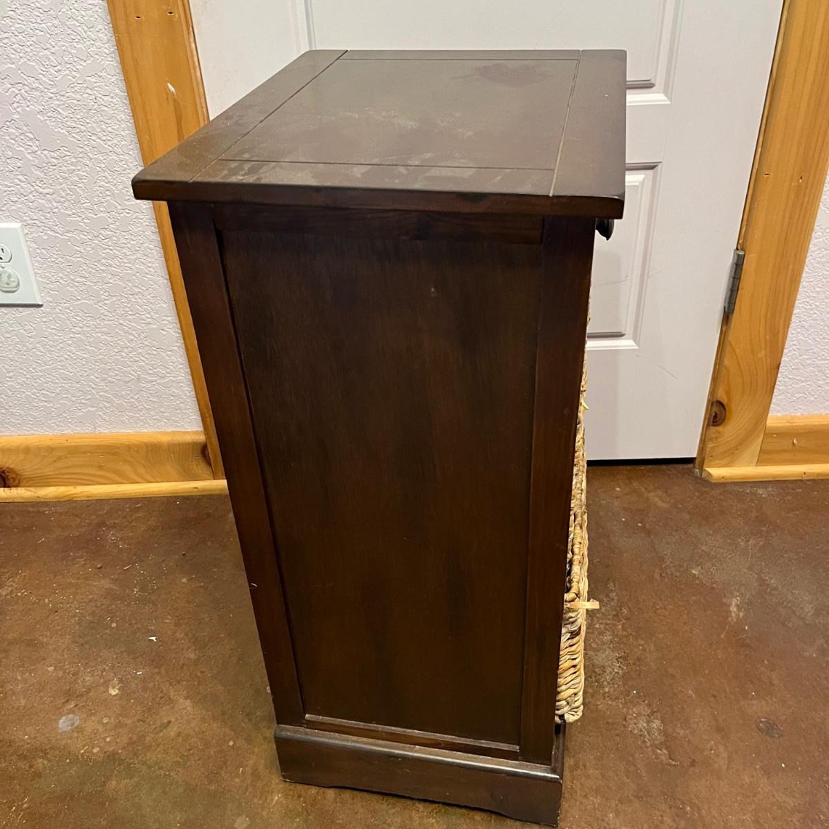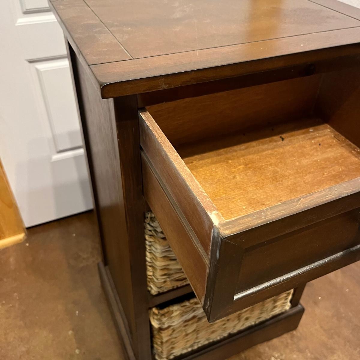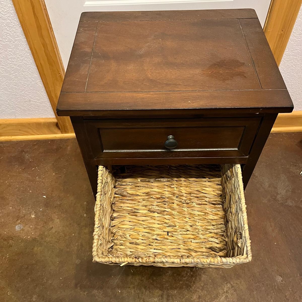 This lot includes one larger side table with ix drawers and one smaller matching side table with three drawers. The tables are made of a lightweight wood and have woven baskets. The baskets are removable. Some of the baskets have snags (see photos). The smaller table has a small chip in the wood on the back and the large table has some tiny scratches on the top (see photos). They are a bit dusty. The larger table measures about 30” x 13” x 27.5”H. Local pickup only.
