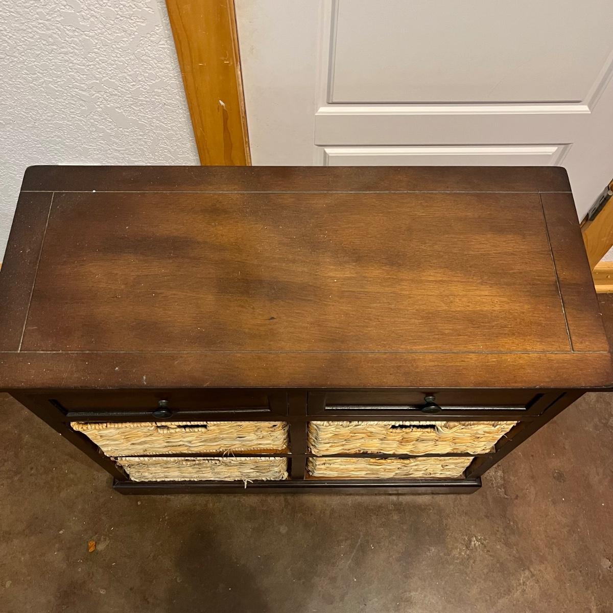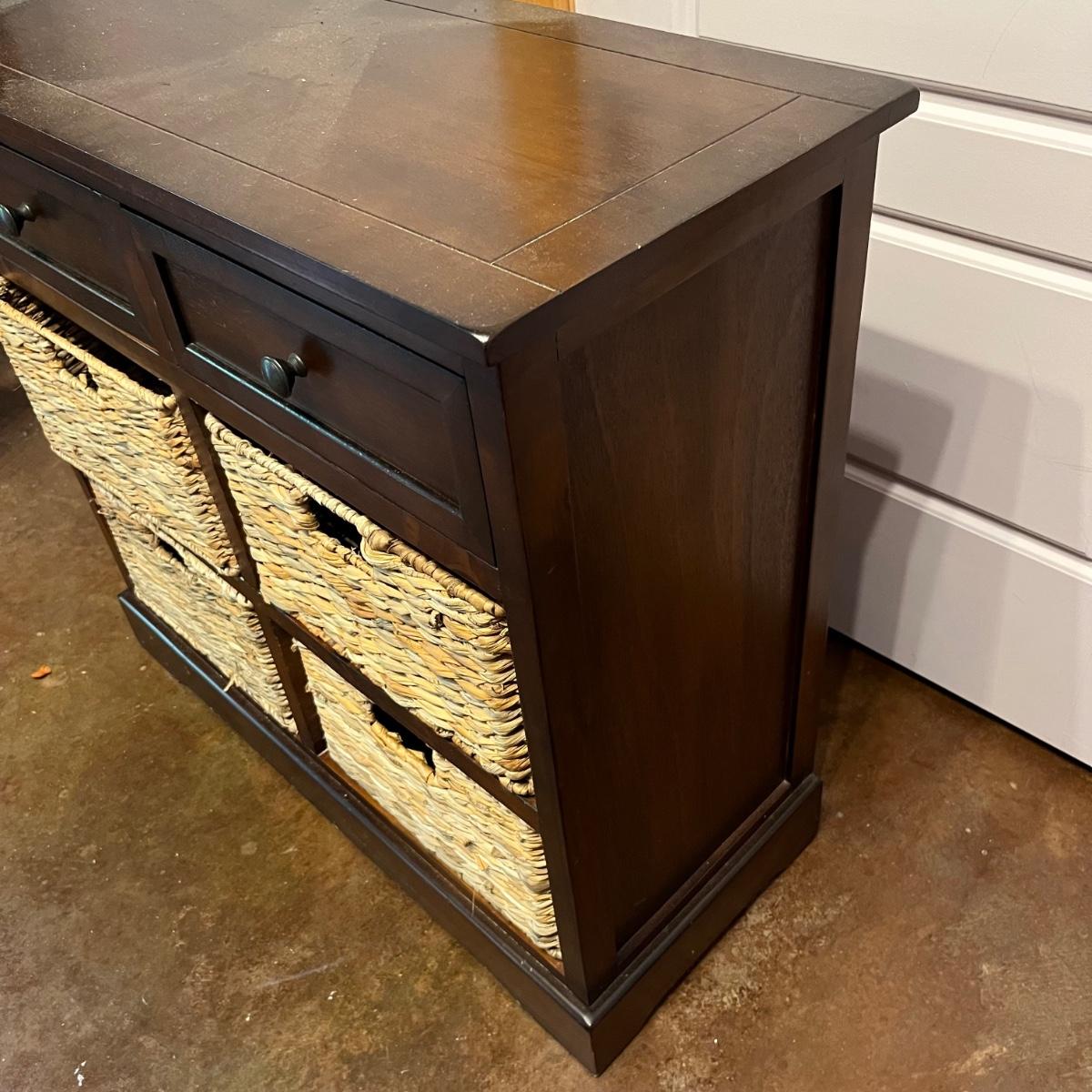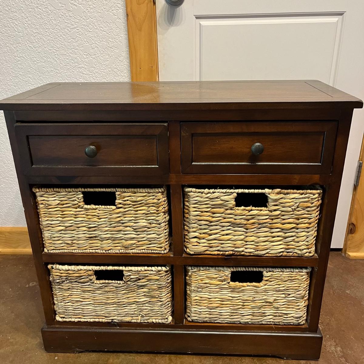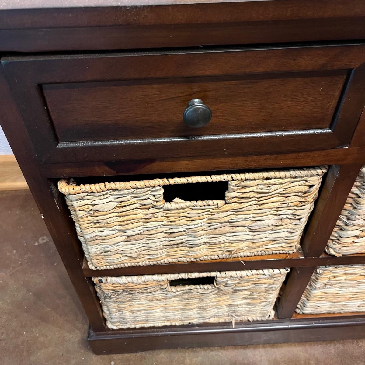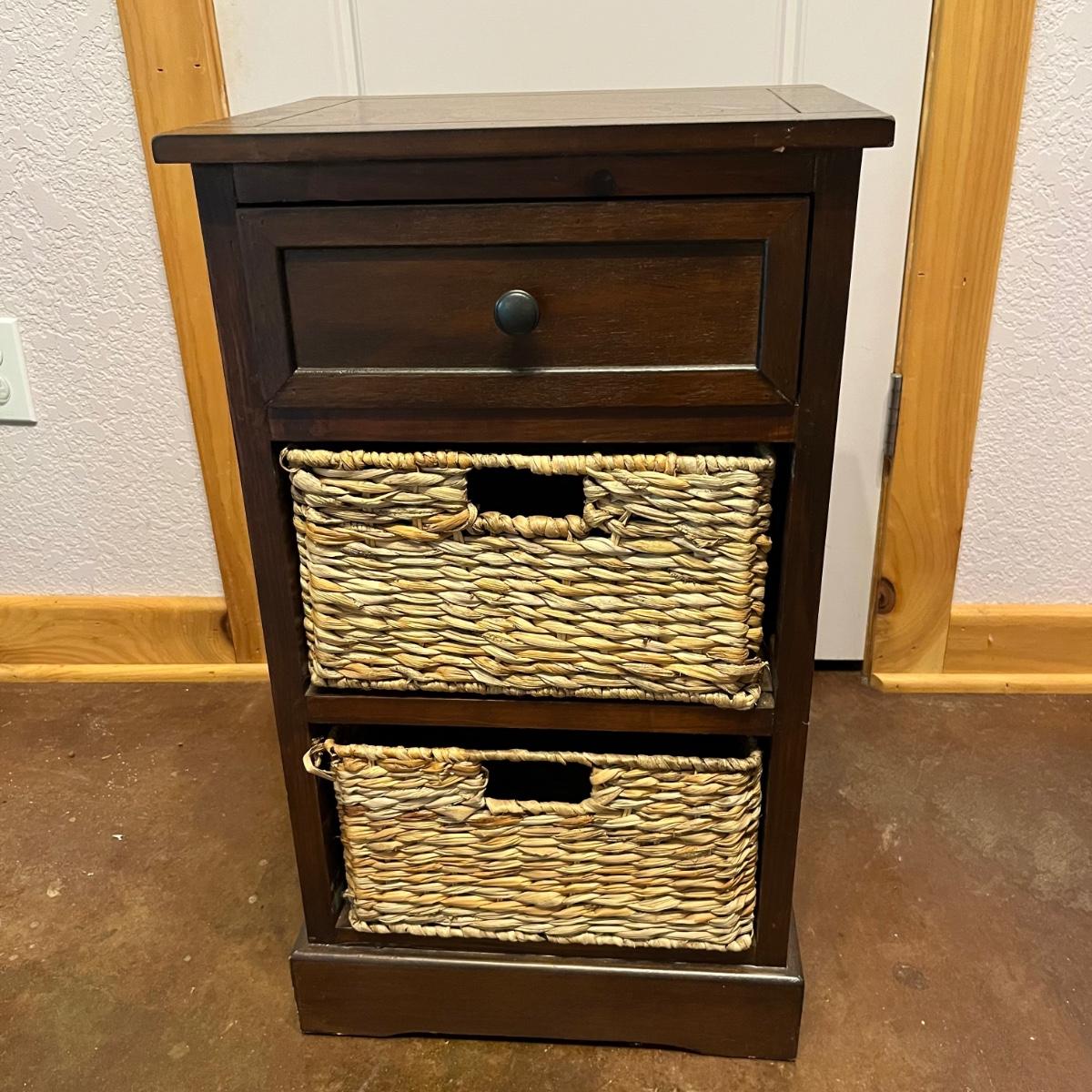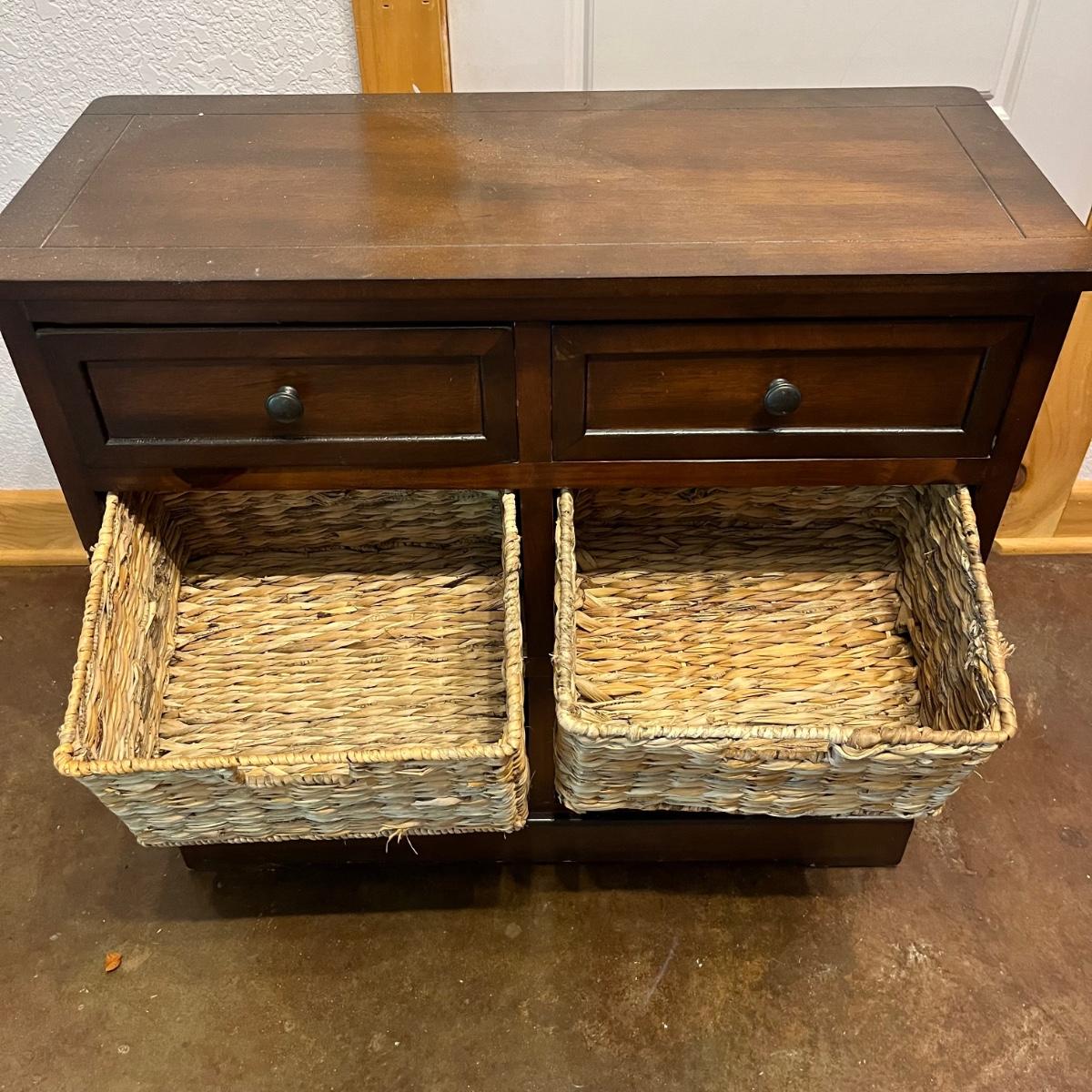 This lot includes one larger side table with ix drawers and one smaller matching side table with three drawers. The tables are made of a lightweight wood and have woven baskets. The baskets are removable. Some of the baskets have snags (see photos). The smaller table has a small chip in the wood on the back and the large table has some tiny scratches on the top (see photos). They are a bit dusty. The larger table measures about 30” x 13” x 27.5”H. Local pickup only.