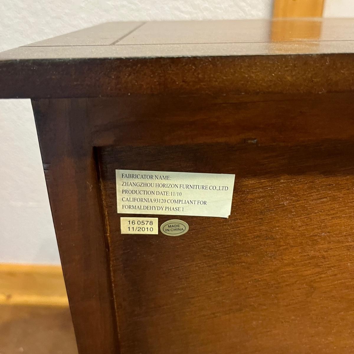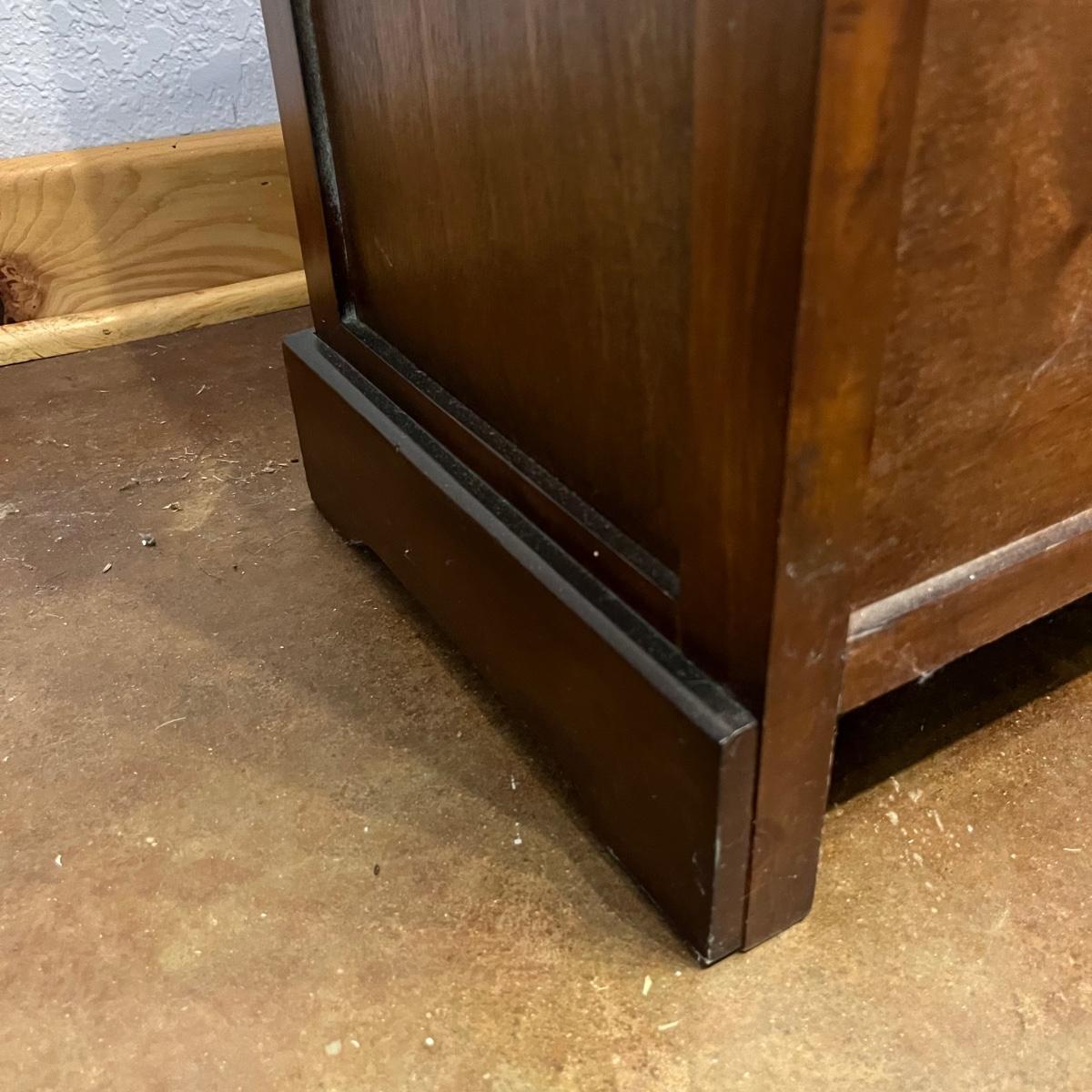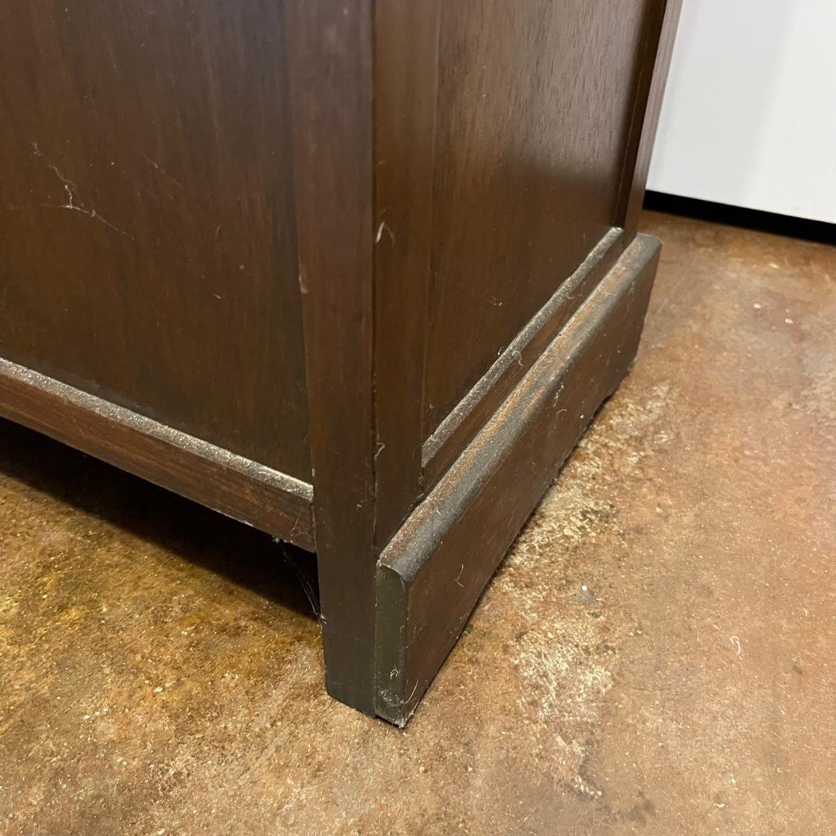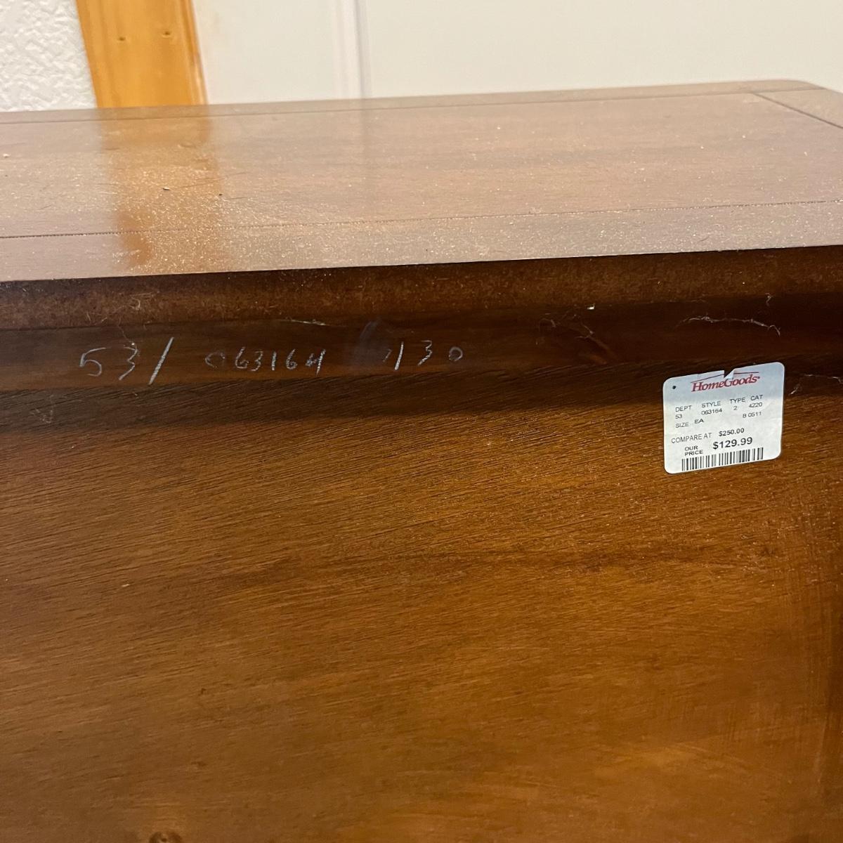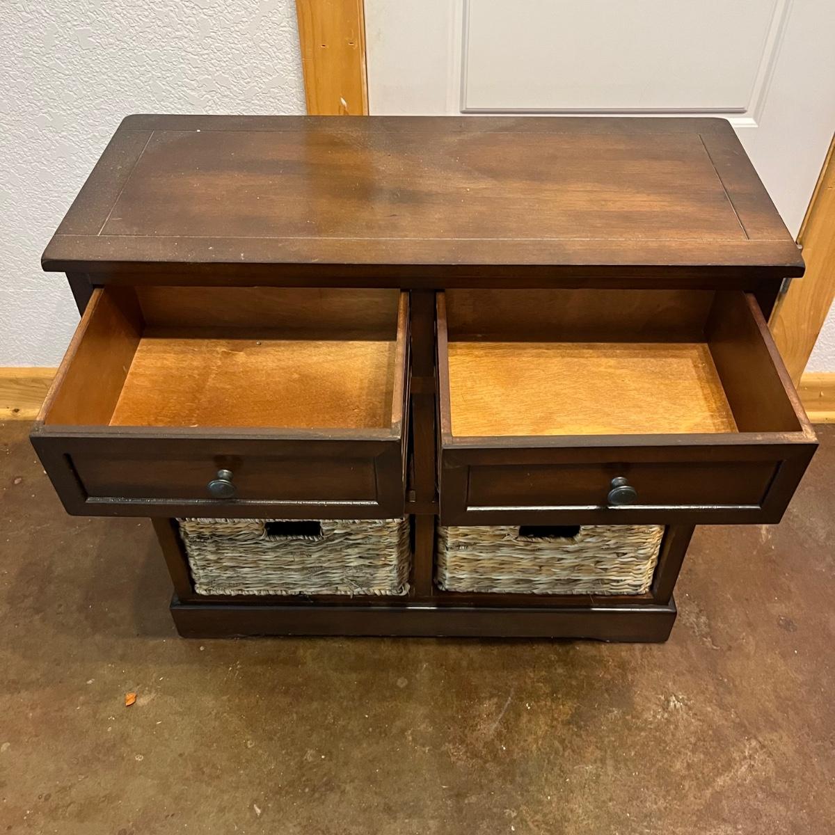 This lot includes one larger side table with ix drawers and one smaller matching side table with three drawers. The tables are made of a lightweight wood and have woven baskets. The baskets are removable. Some of the baskets have snags (see photos). The smaller table has a small chip in the wood on the back and the large table has some tiny scratches on the top (see photos). They are a bit dusty. The larger table measures about 30” x 13” x 27.5”H. Local pickup only.