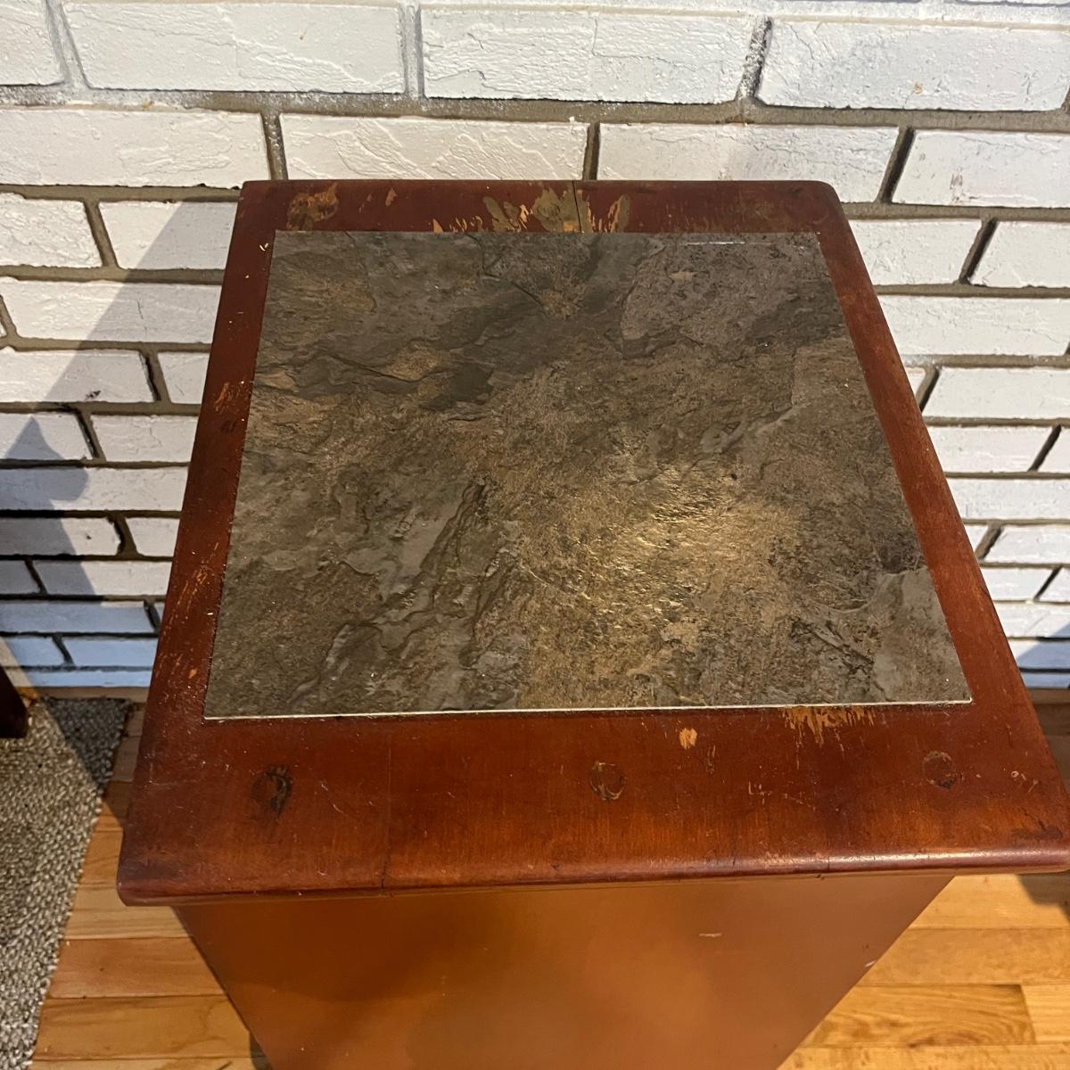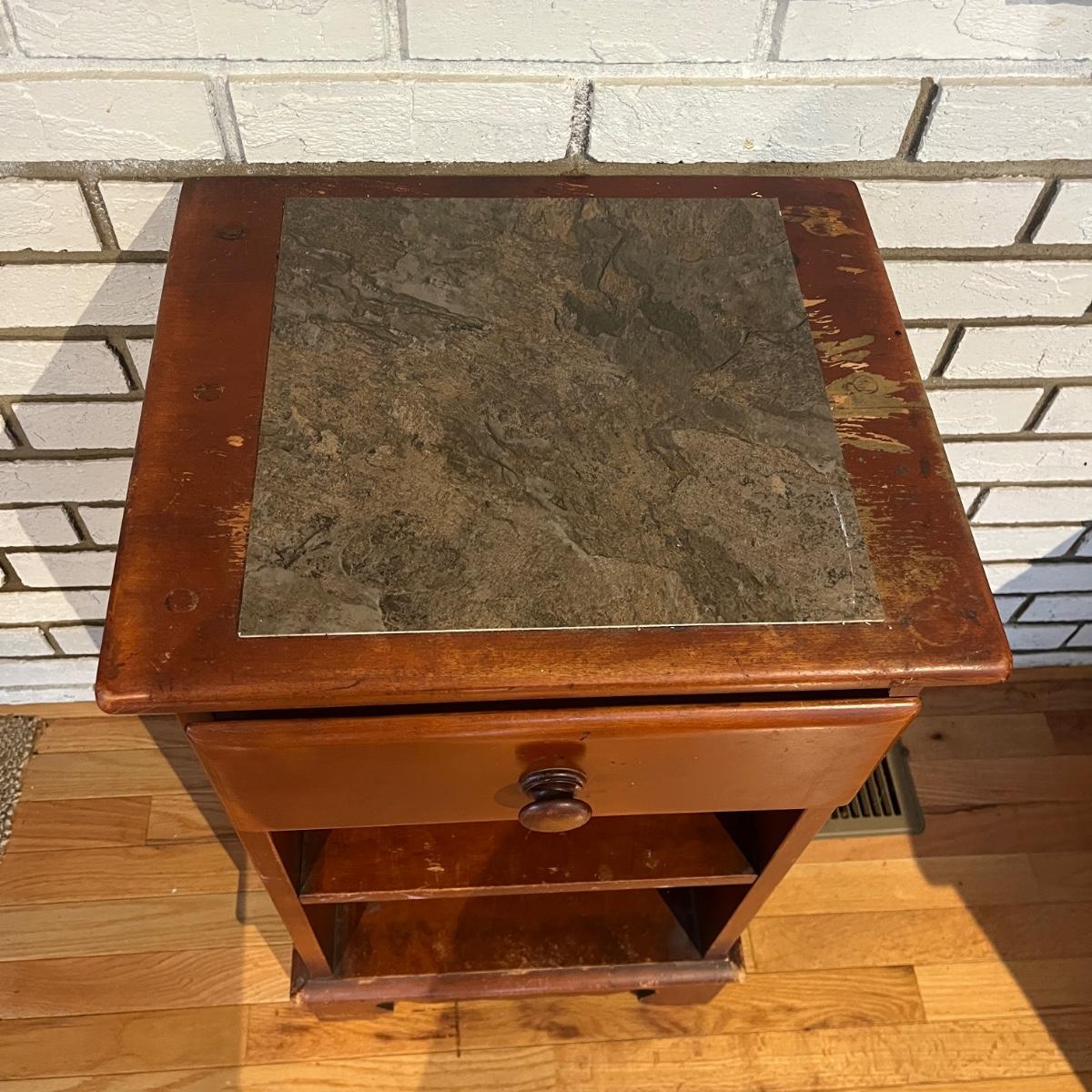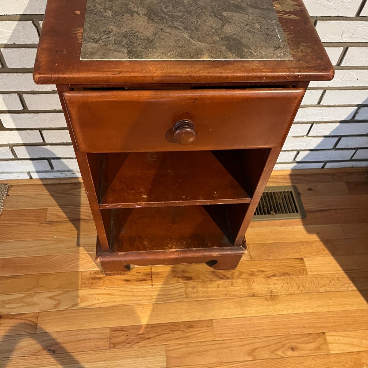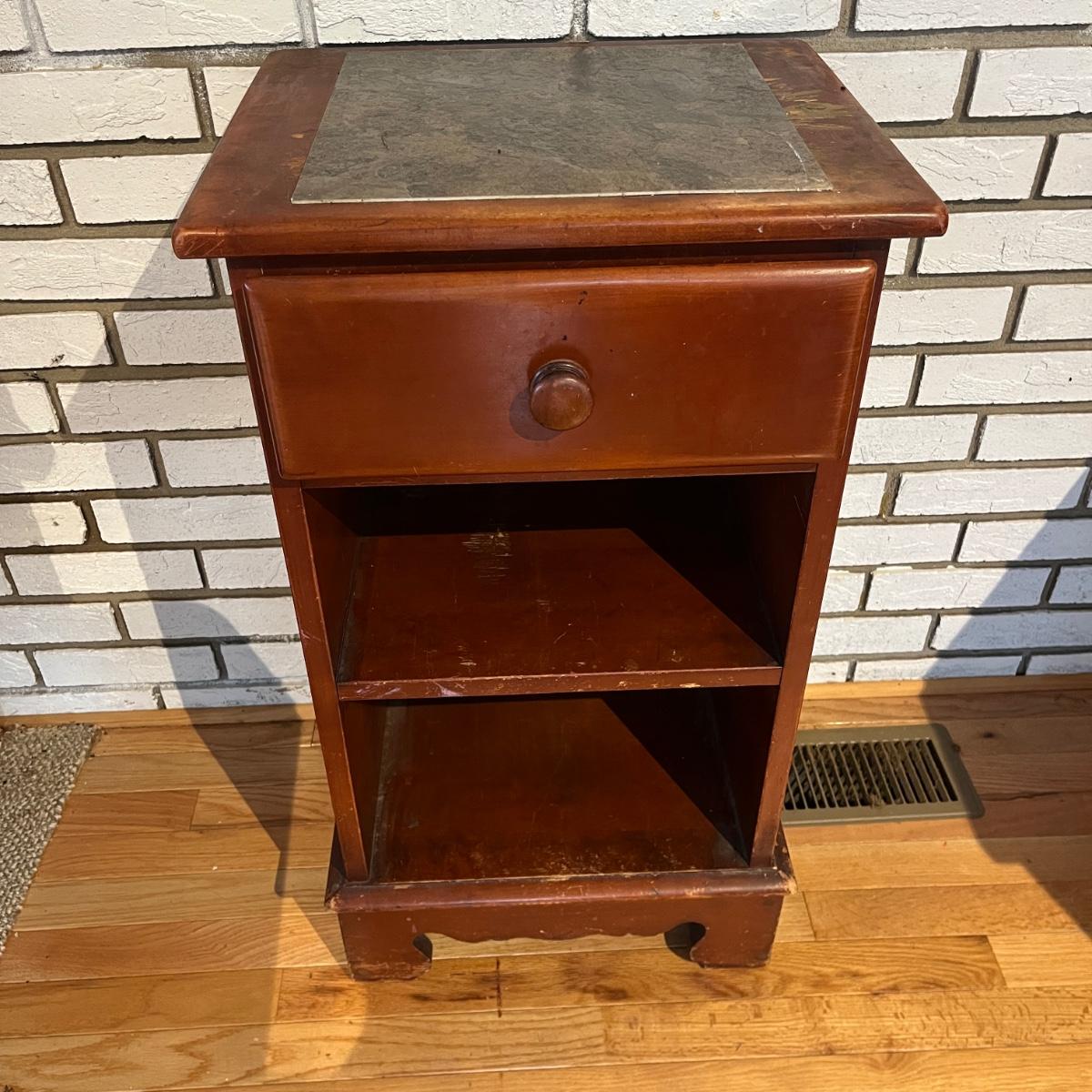Lot includes a wooden side table with dovetailed drawer and a shelf underneath. Top of table has a faux stone linoleum stuck to it and has wear on top, see pictures. Table measures 17” x 14” x 30”H.