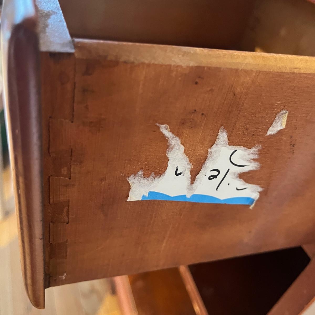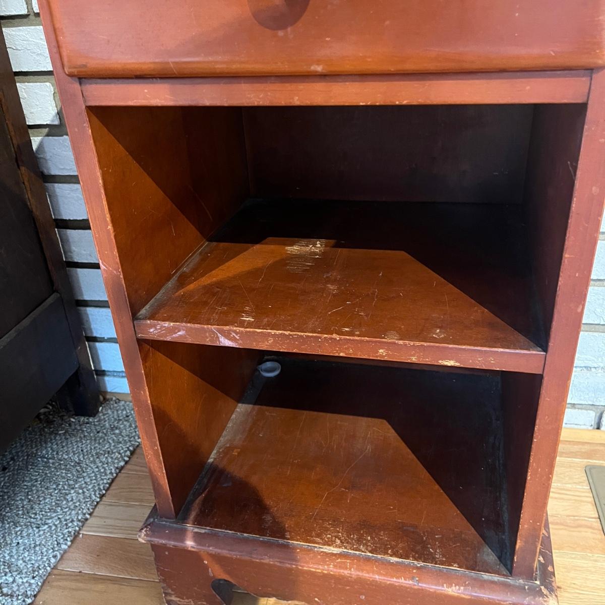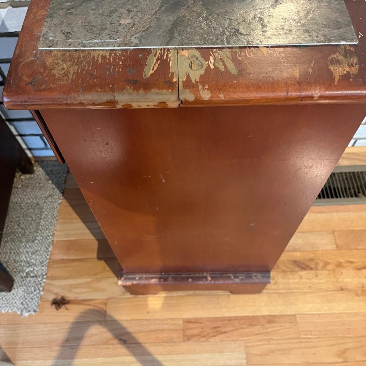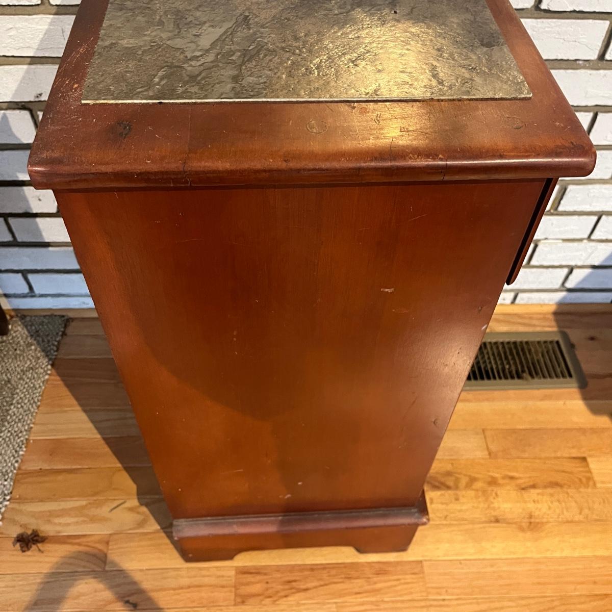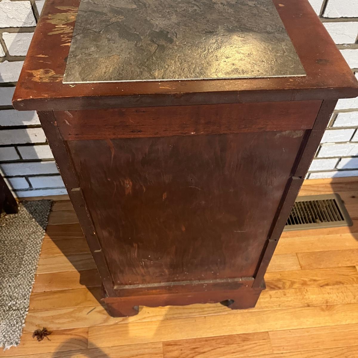 Lot includes a wooden side table with dovetailed drawer and a shelf underneath. Top of table has a faux stone linoleum stuck to it and has wear on top, see pictures. Table measures 17” x 14” x 30”H.