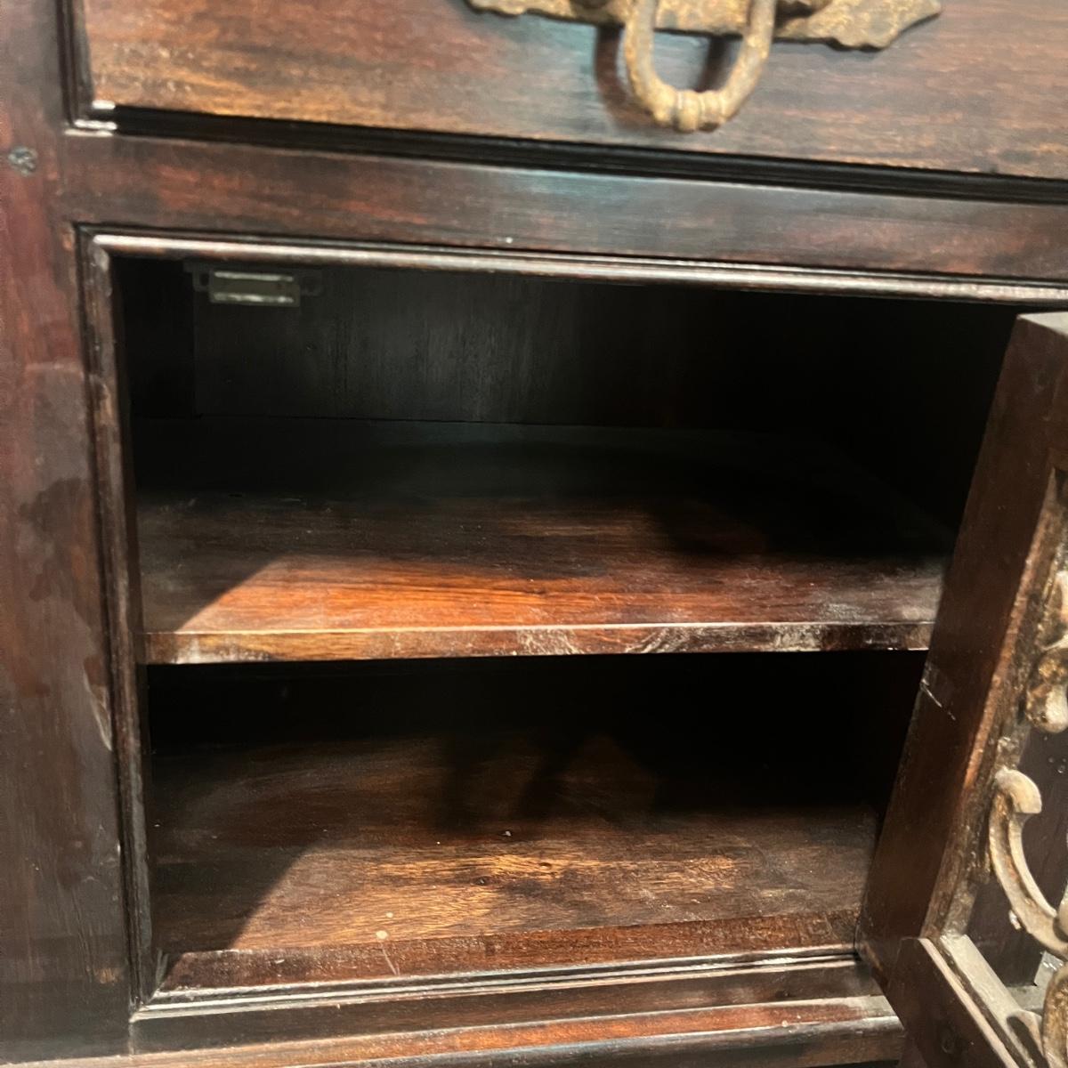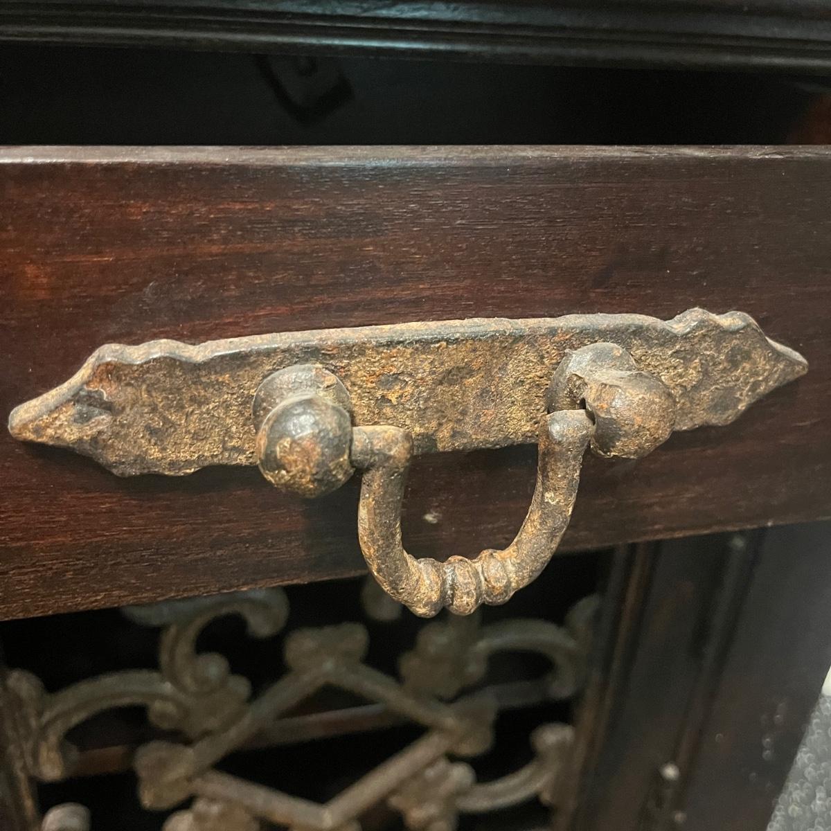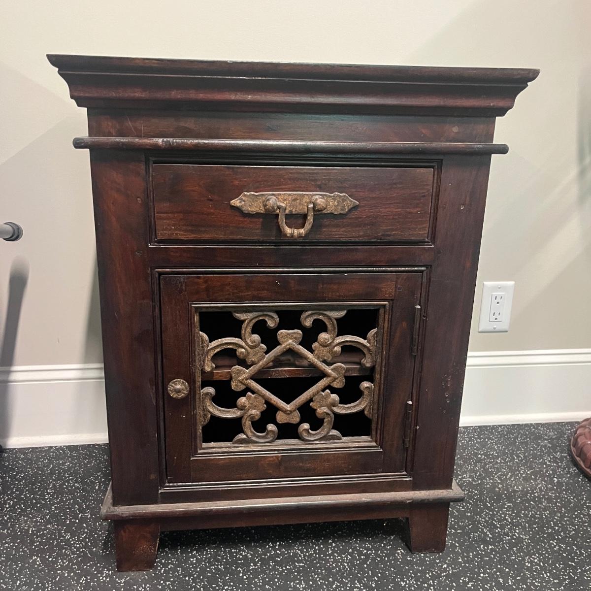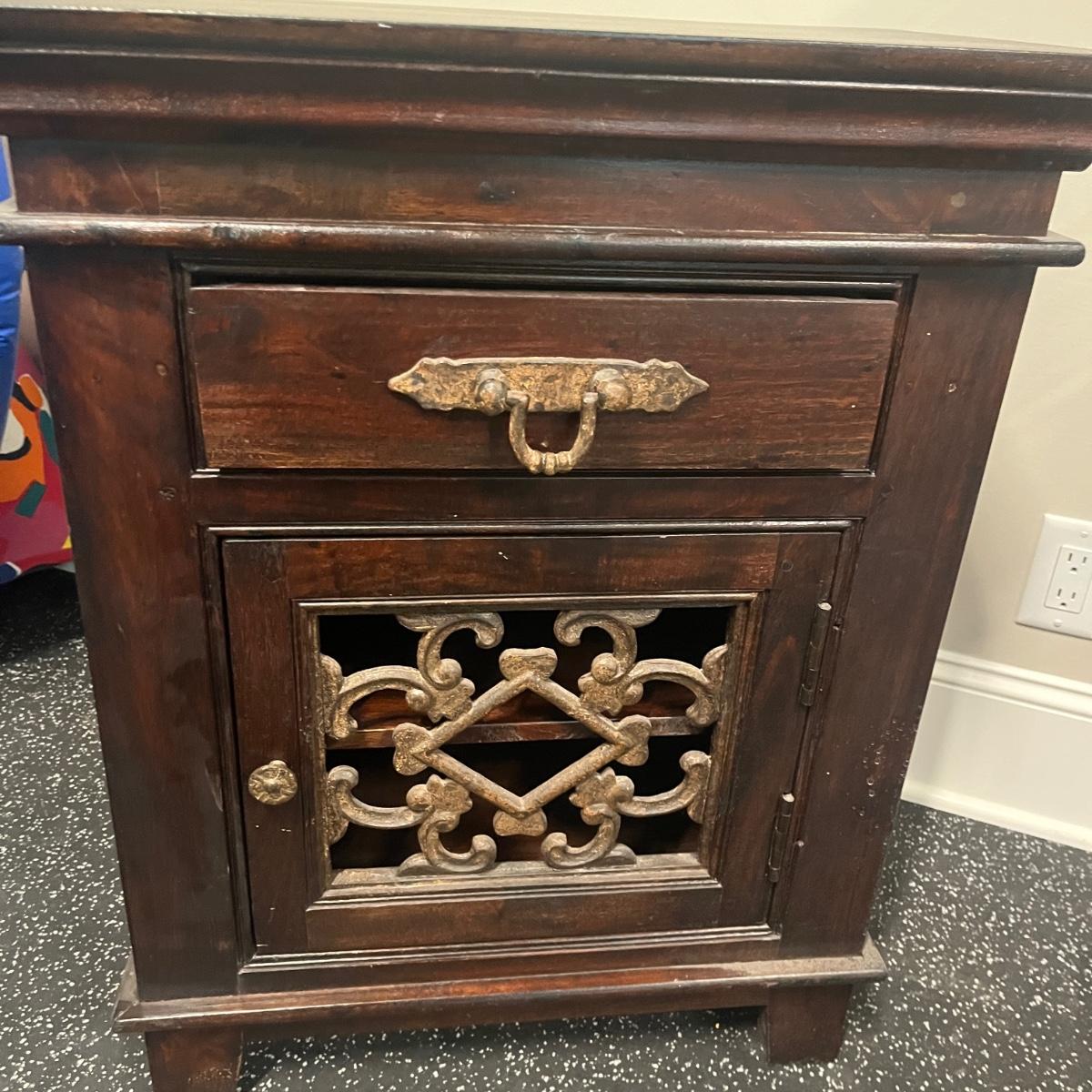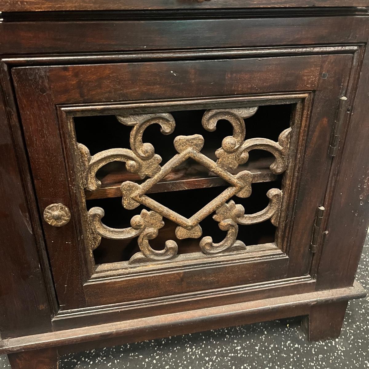 This ornate solid wood side table/night stand has a dark stained finish. It has a distressed iron insert in the door and iron handle on the drawer. Cabinet has one shelf. Table measures 16” x 24” x 30”H.