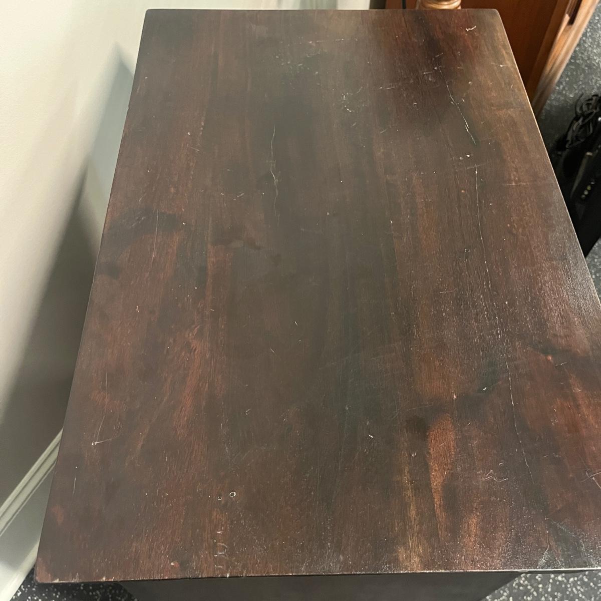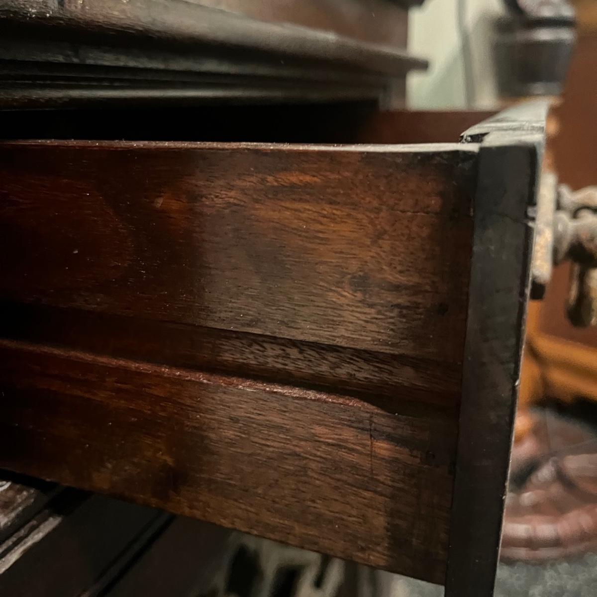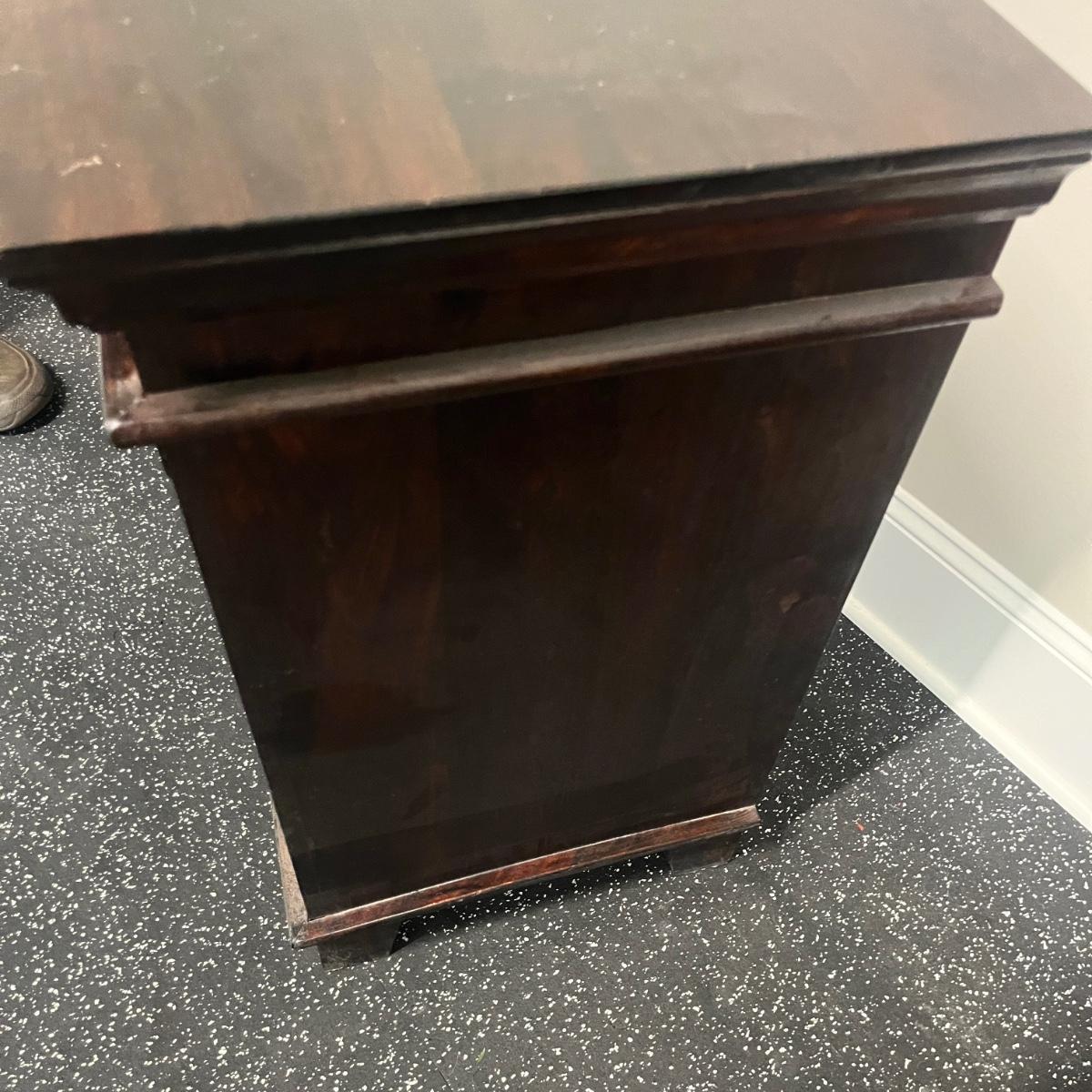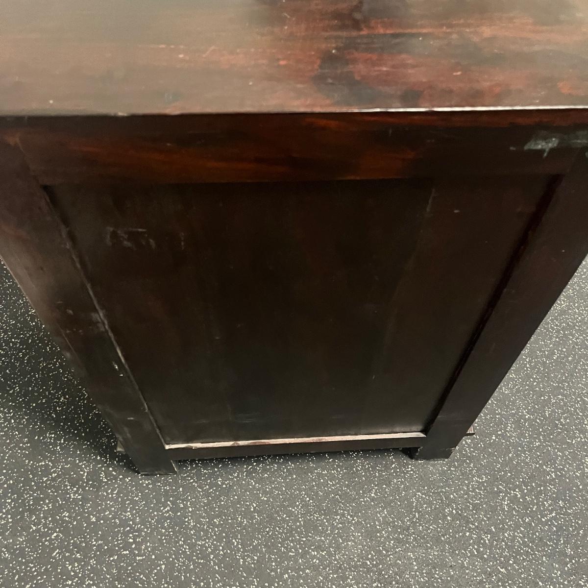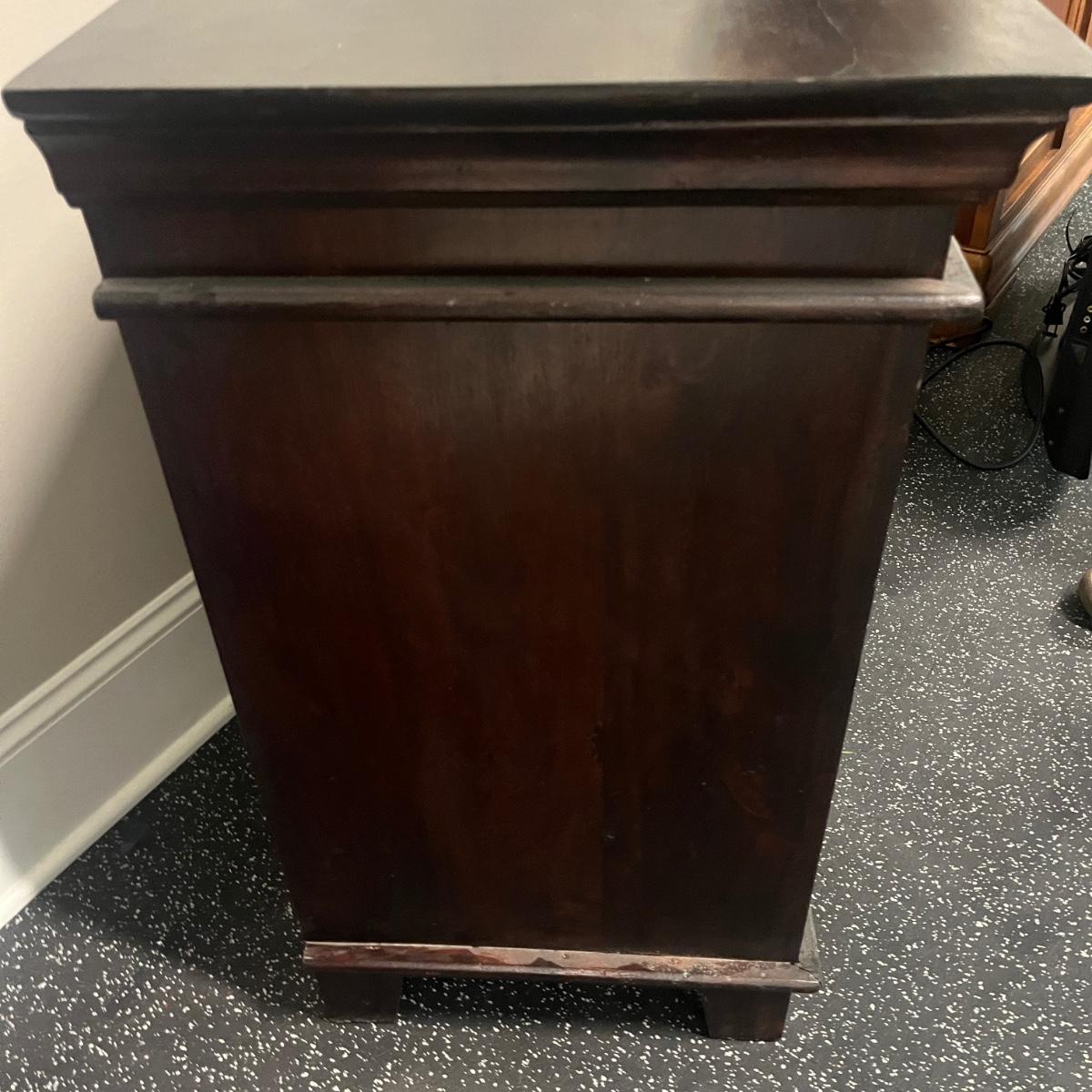 This ornate solid wood side table/night stand has a dark stained finish. It has a distressed iron insert in the door and iron handle on the drawer. Cabinet has one shelf. Table measures 16” x 24” x 30”H.