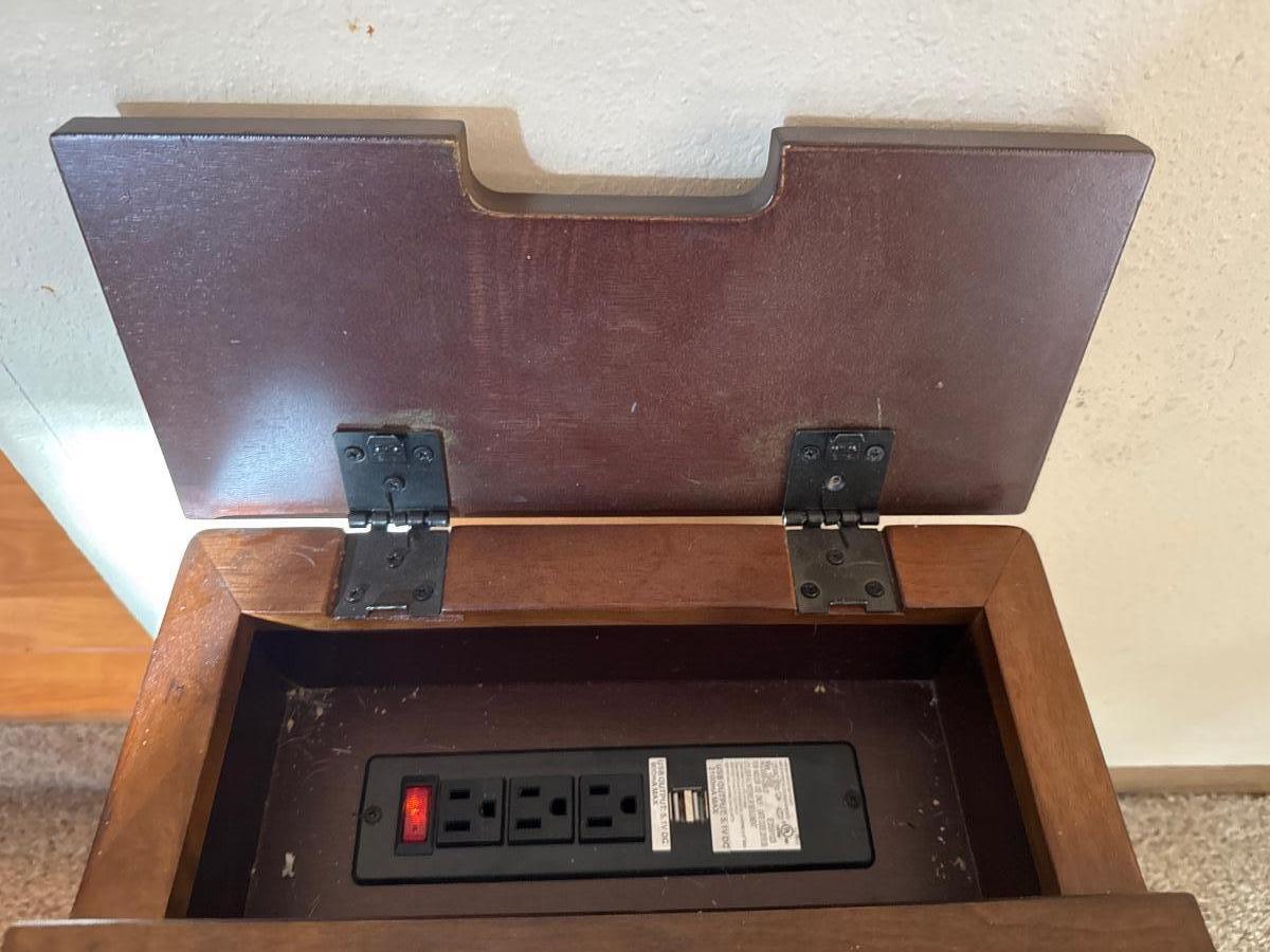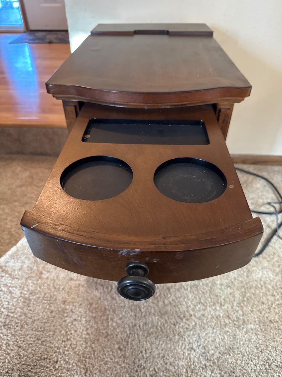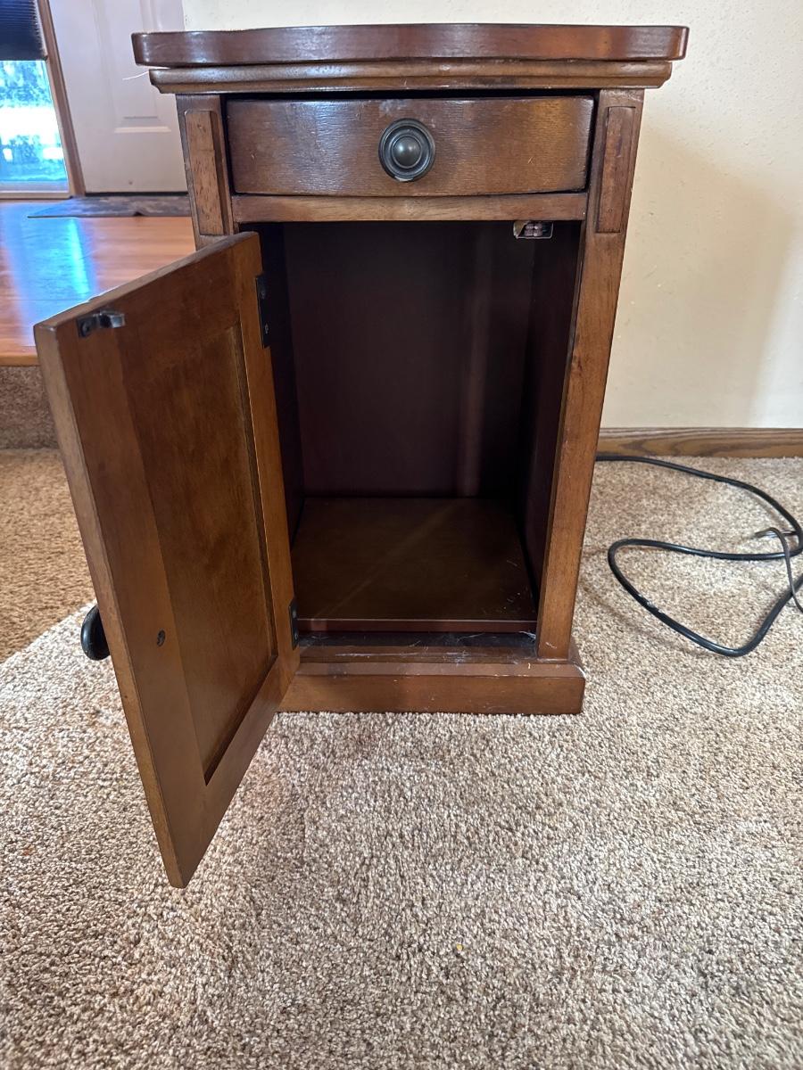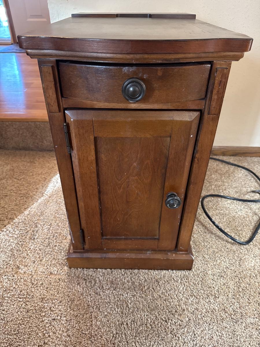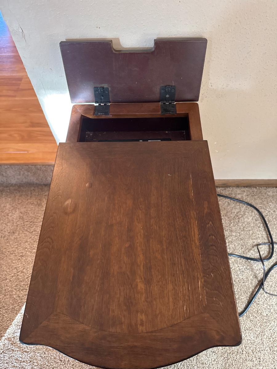 Has some water bubbling damage on top as shown in pictures. Dimensions are 23 1/2 inches tall by 14 inches wide by 23 inches deep.