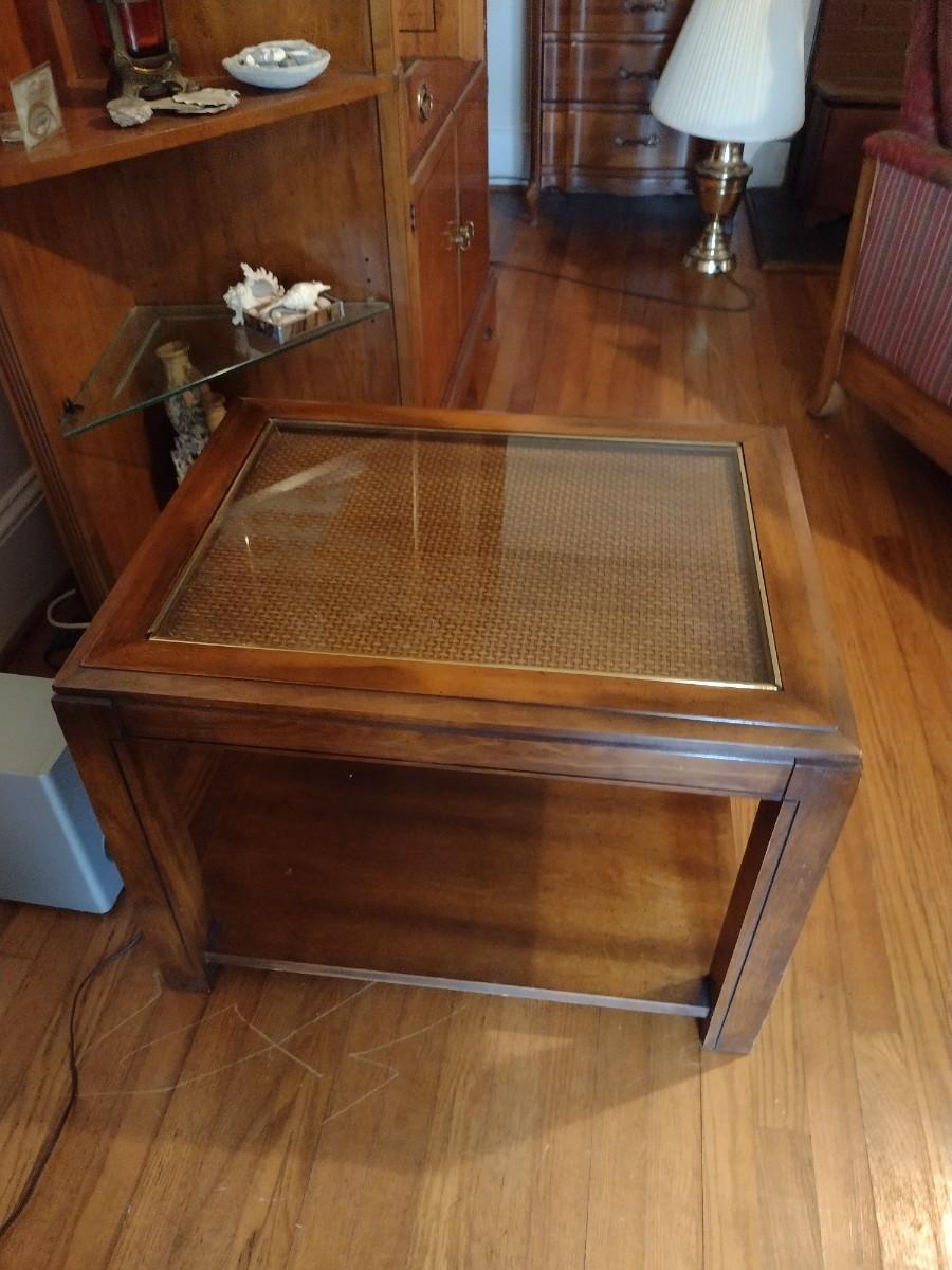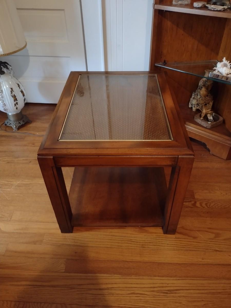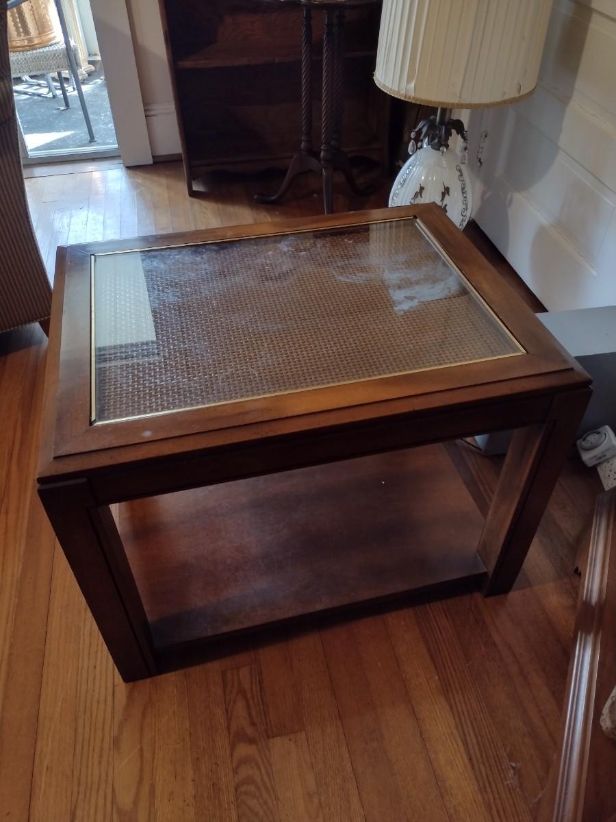 Wooden Side Table with Woven Rattan Insert Under Glass