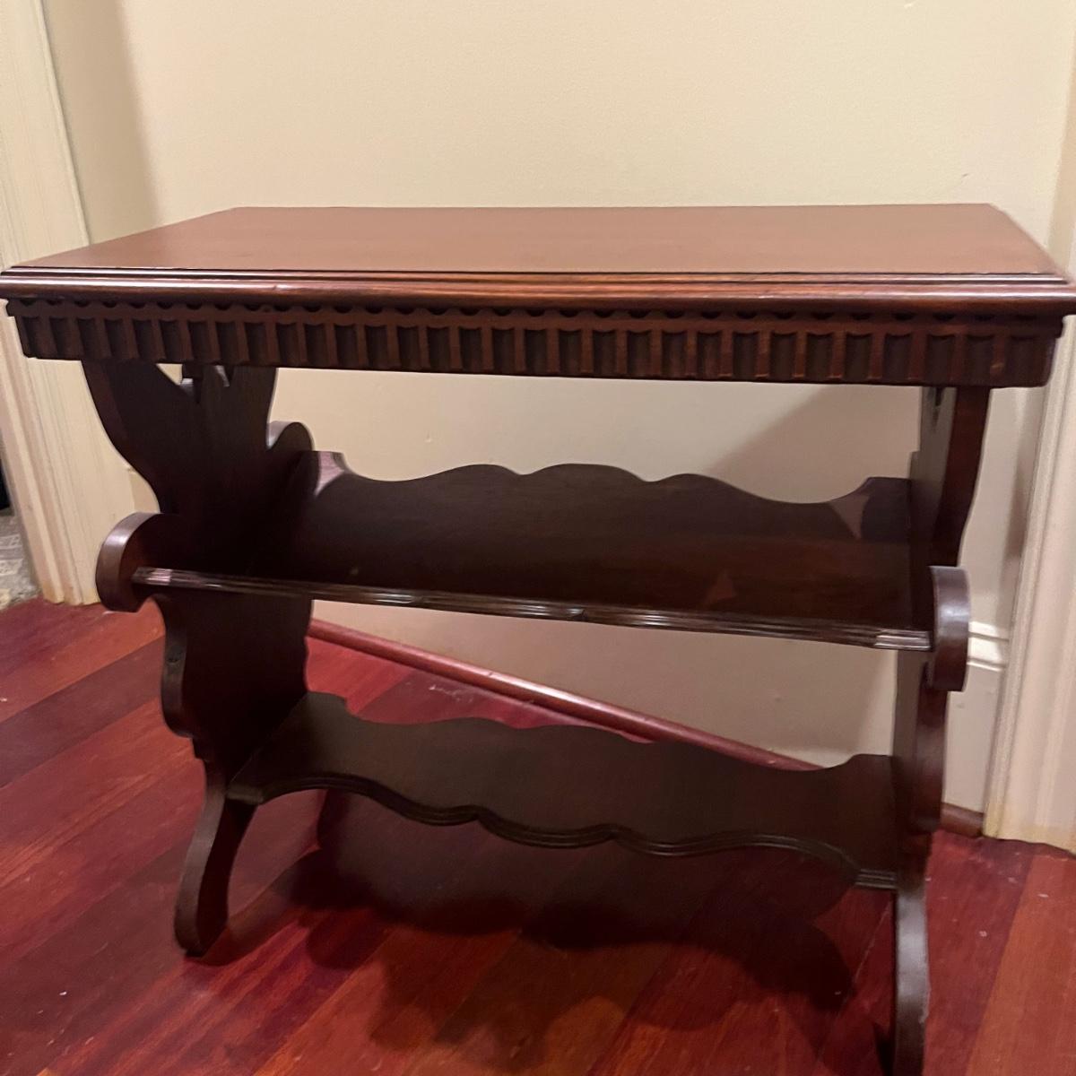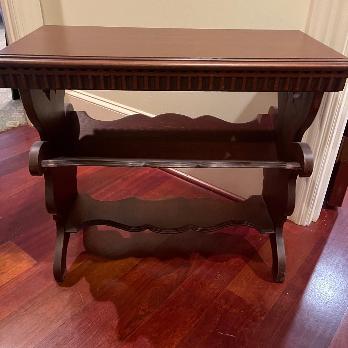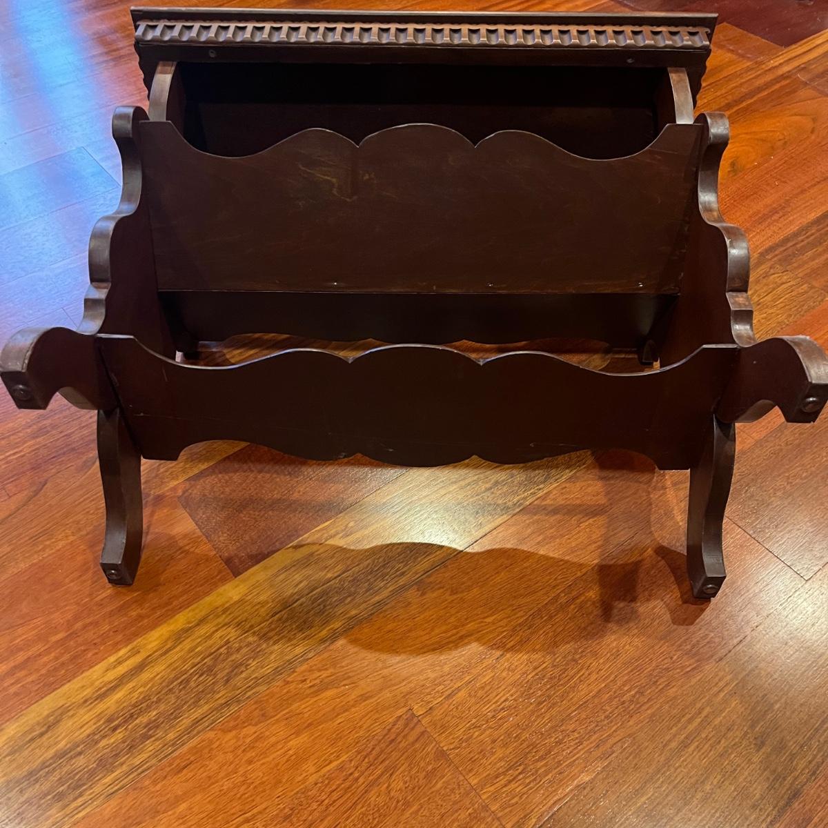 This wooden side table/ magazine rack has a unique design around the sides and a place for magazines underneath. Table measures 14” x 28” x 24”H.
