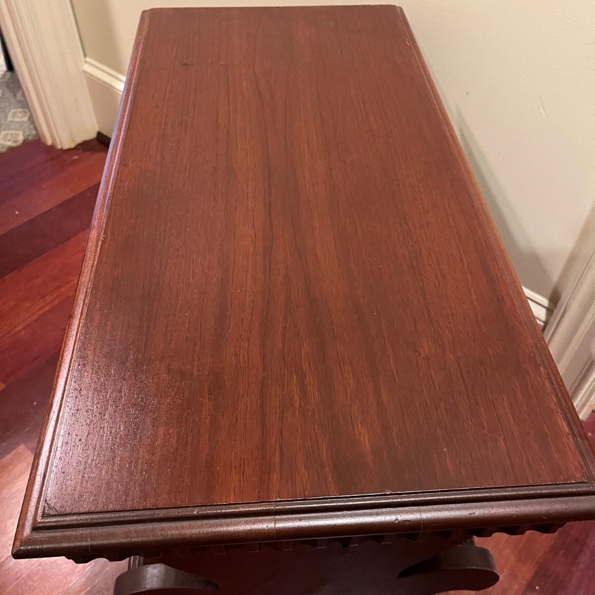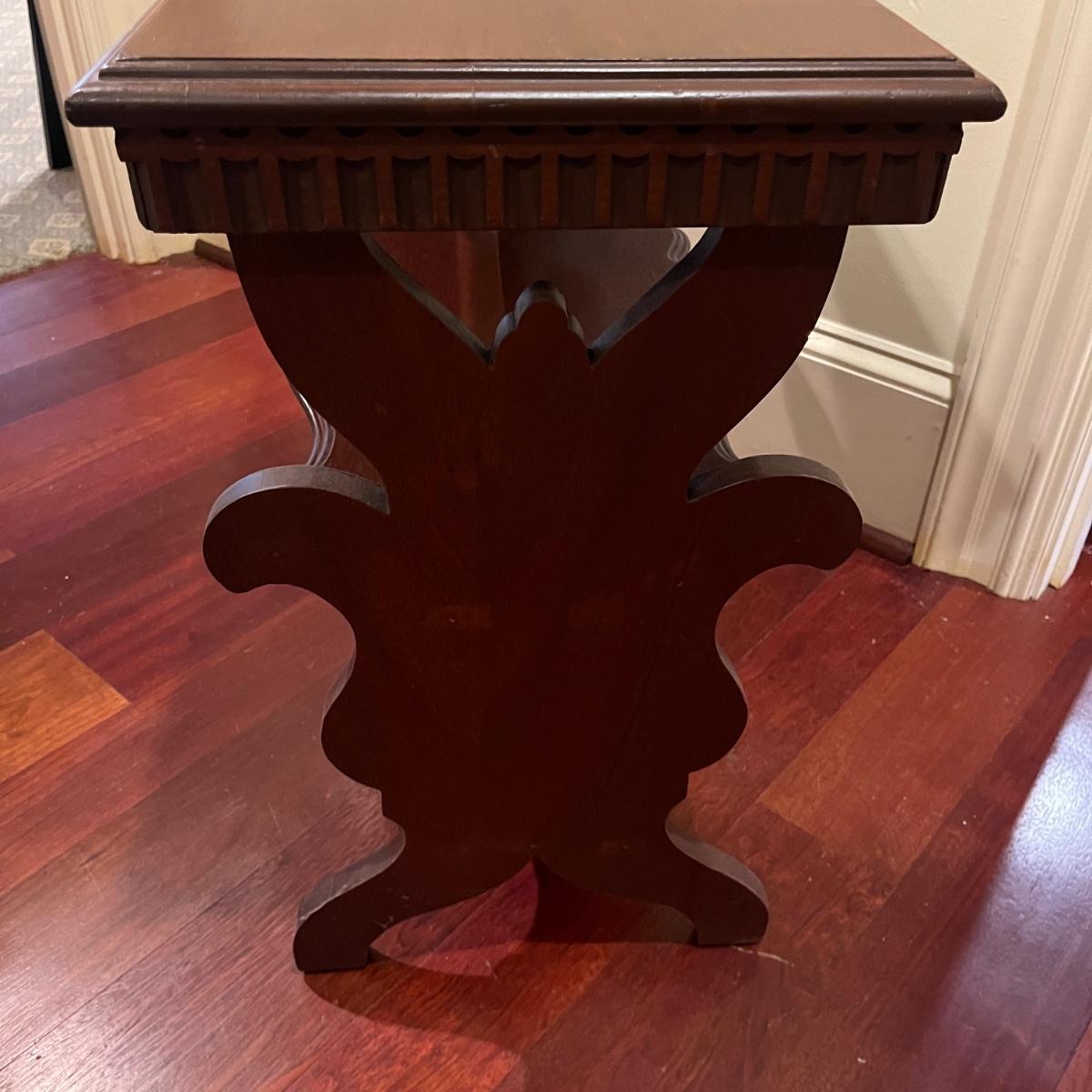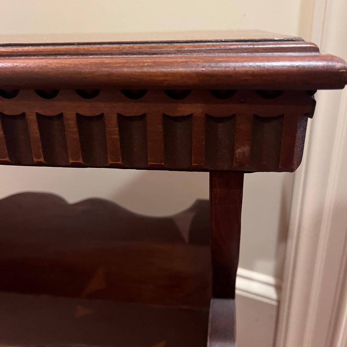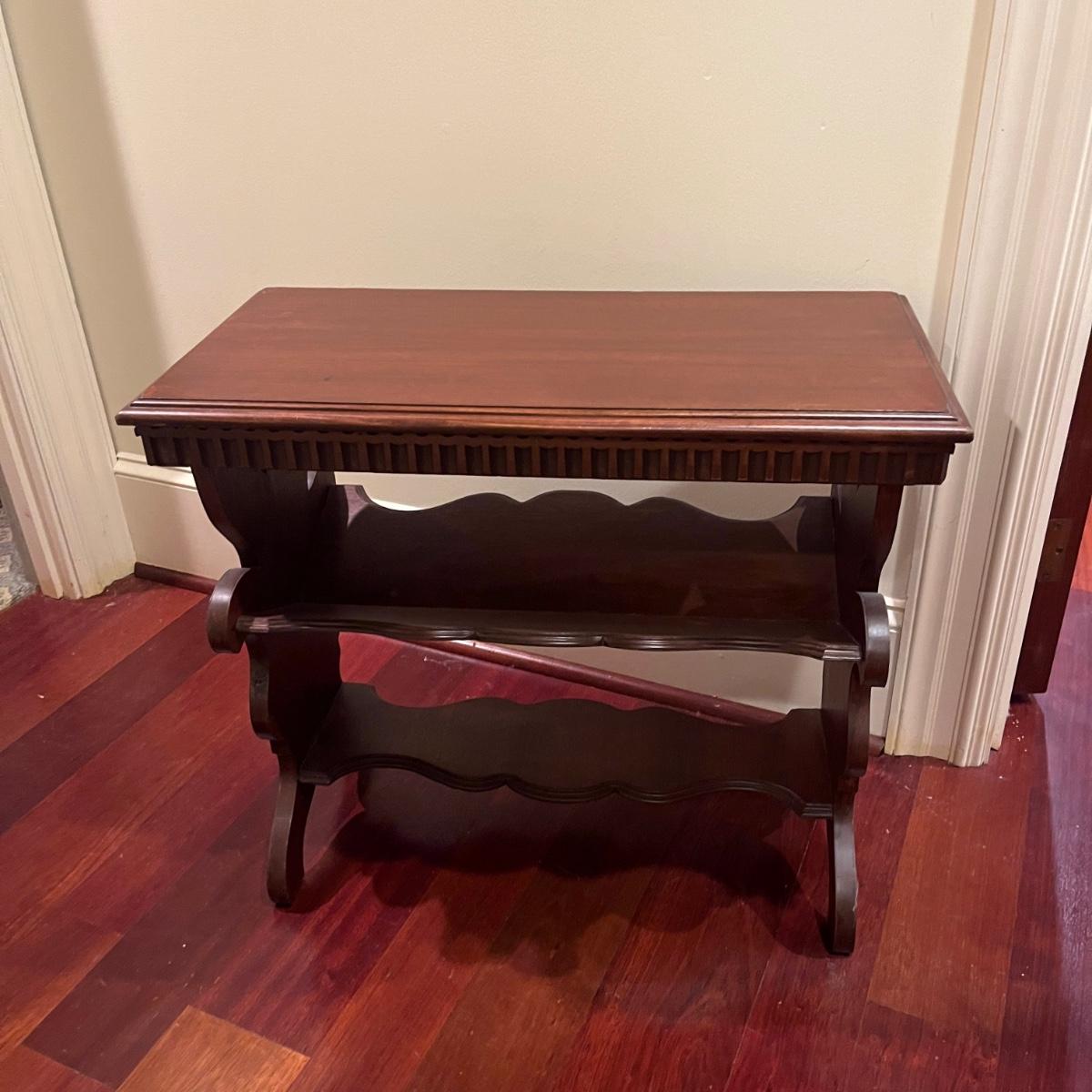 This wooden side table/ magazine rack has a unique design around the sides and a place for magazines underneath. Table measures 14” x 28” x 24”H.