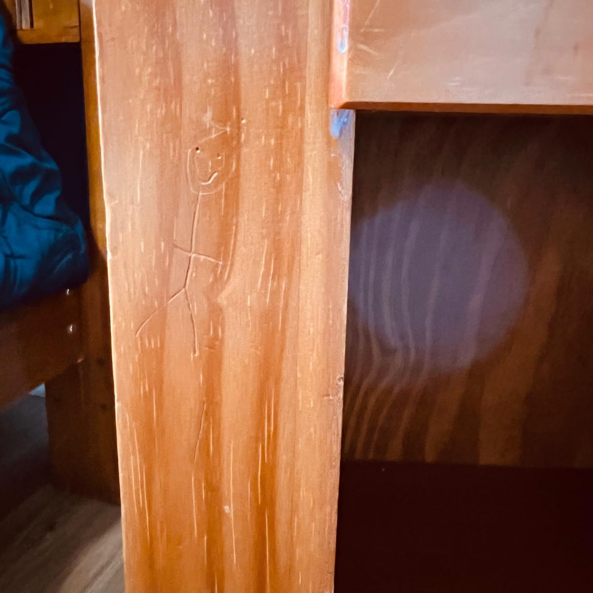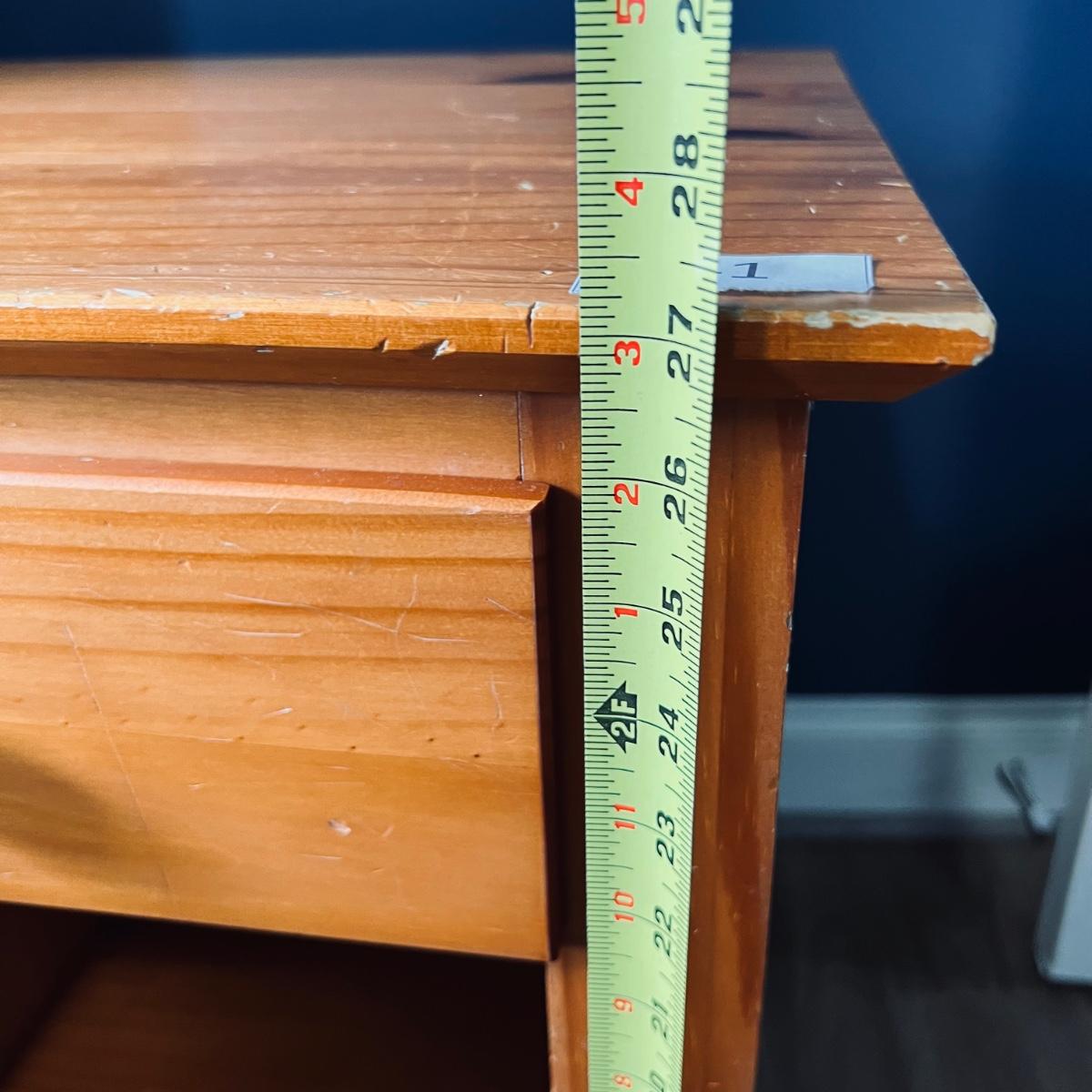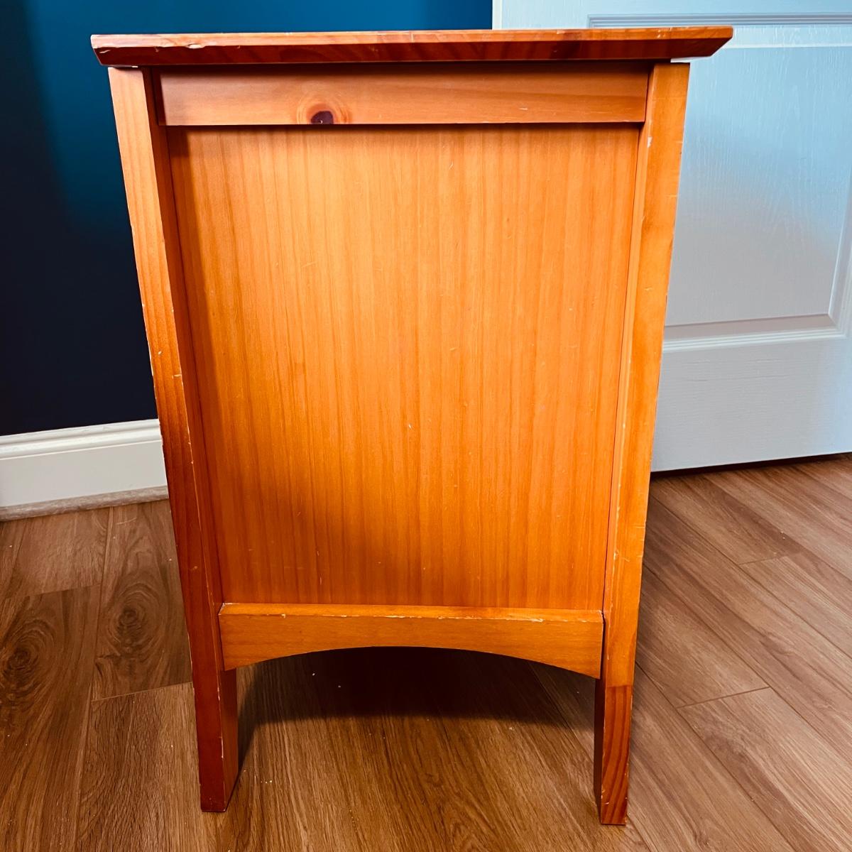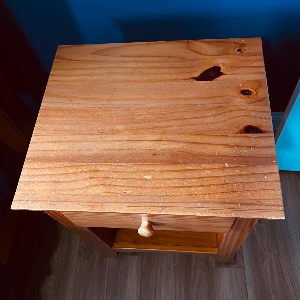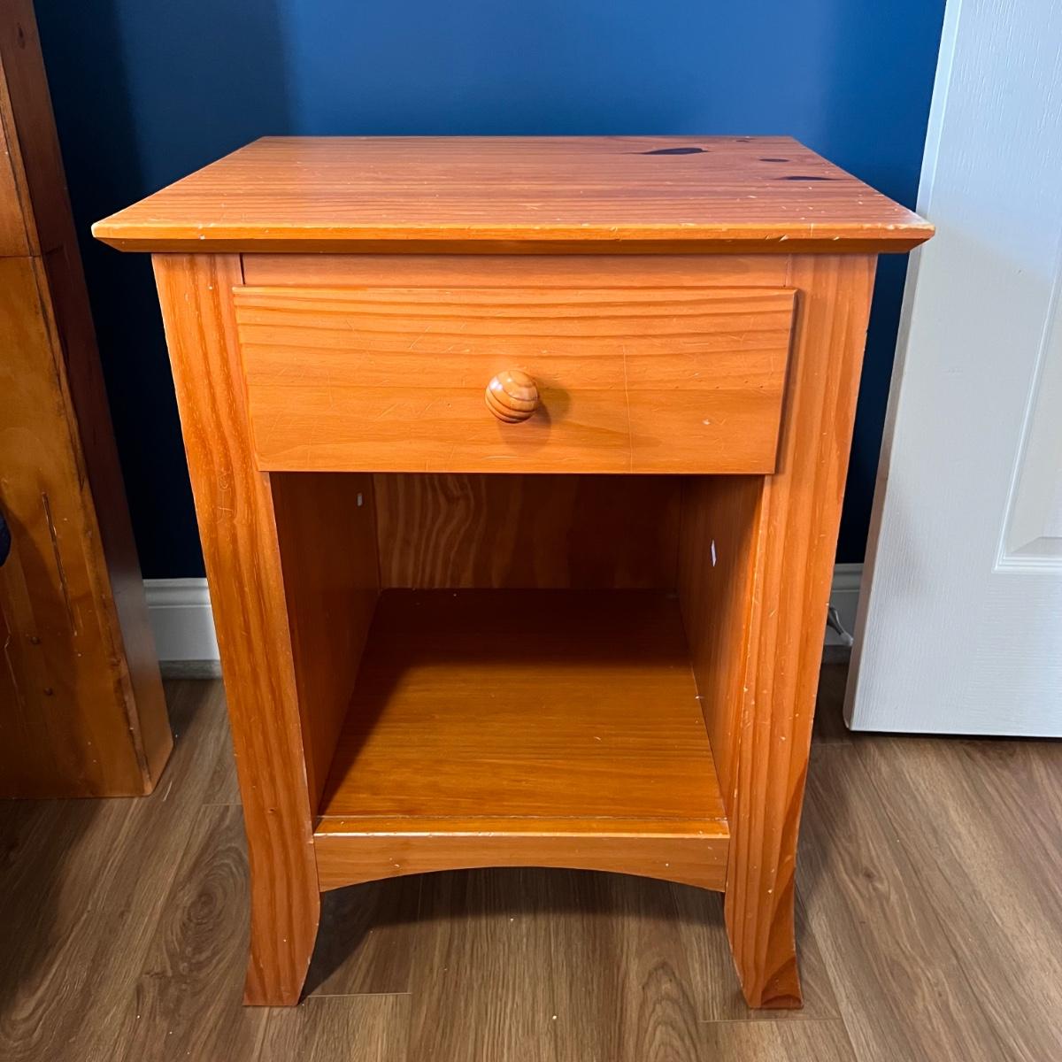 Small wooden night stand with shelf. Needs refinishing. Has scratches and dings as shown in pics.