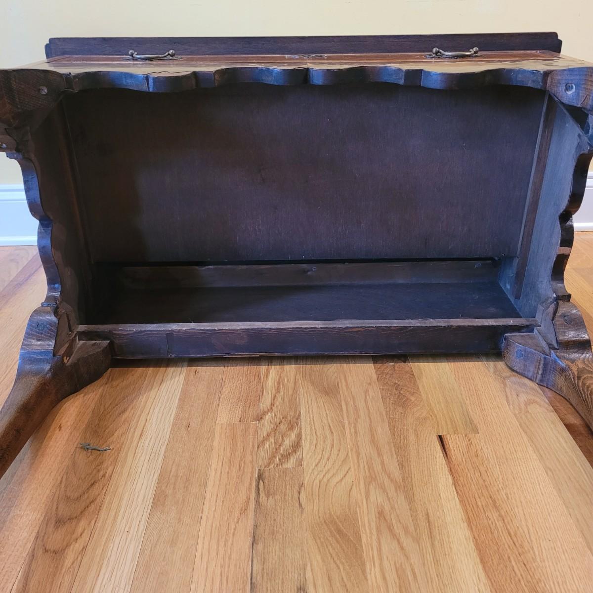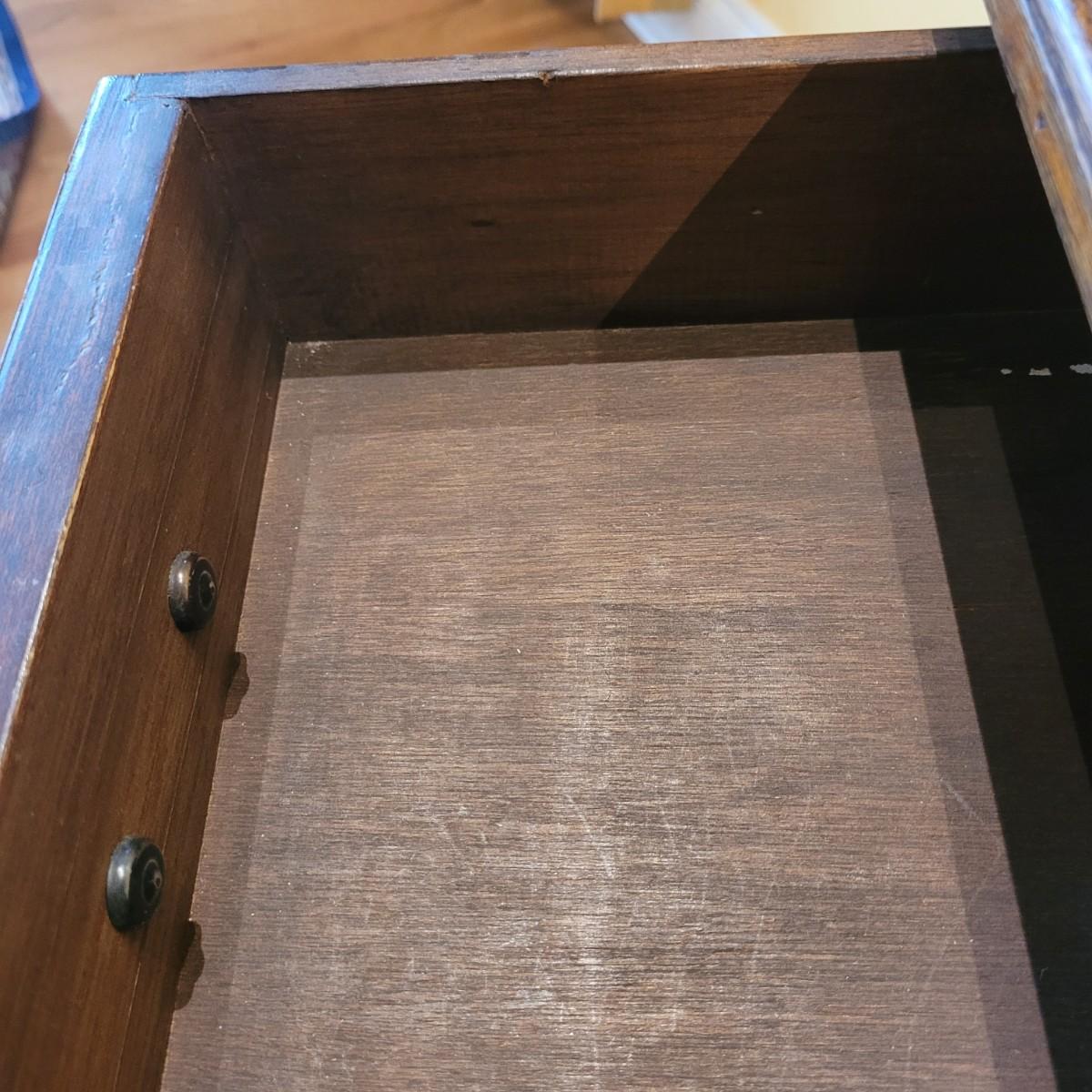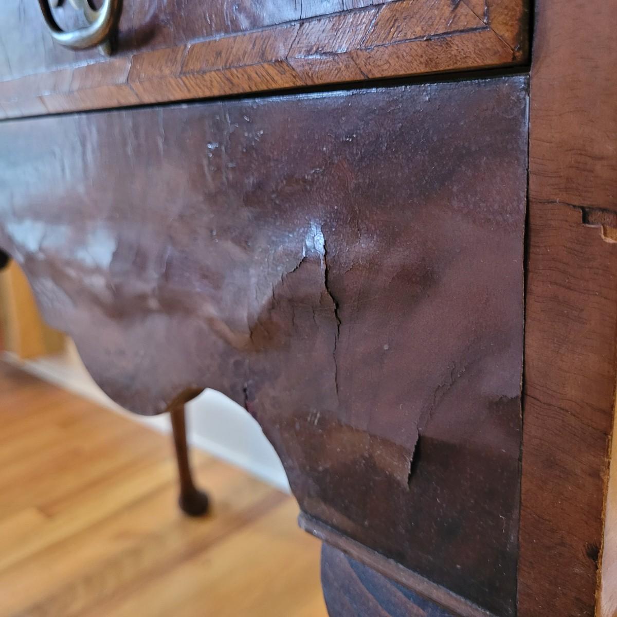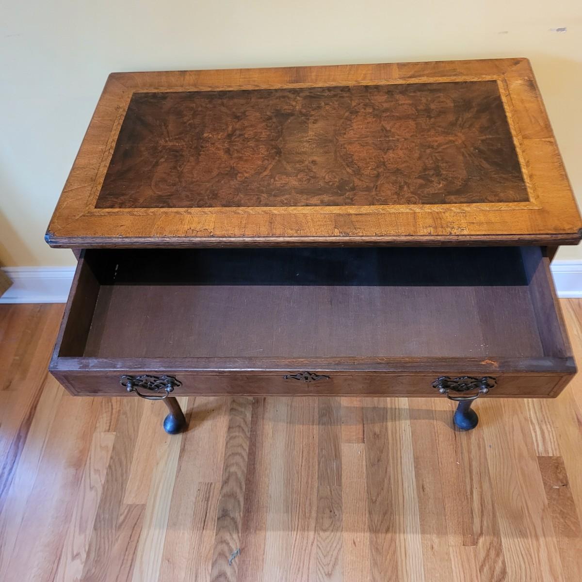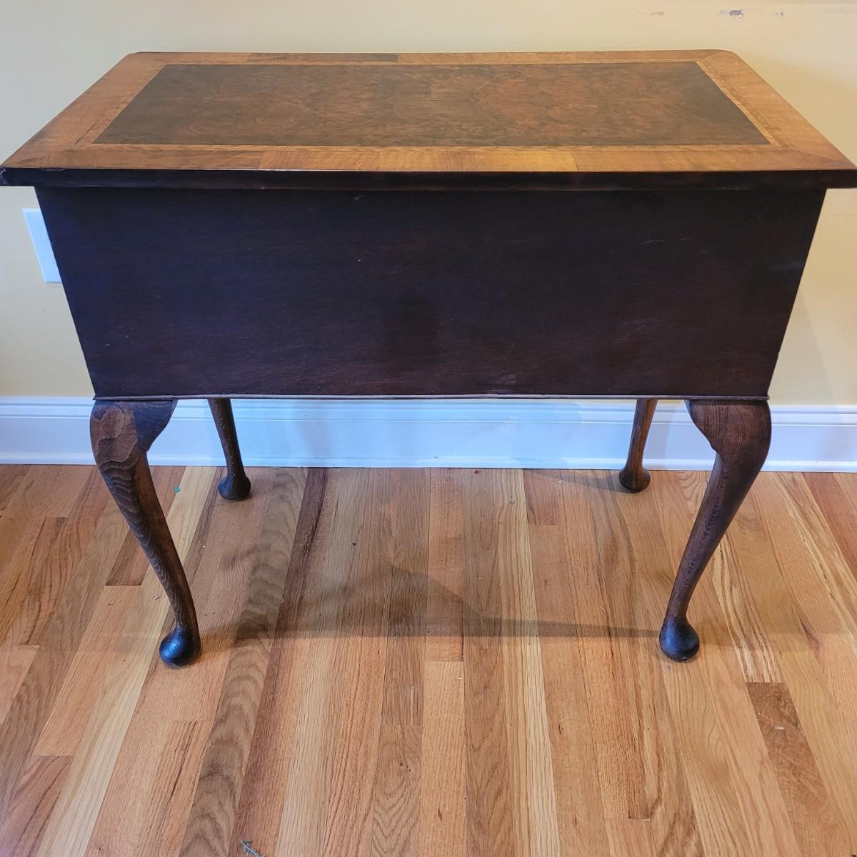 Medium sized lowboy or lamp table with an inlaid top and single sliding drawer. Appears to be made from solid wood with a veneer. Table is light but sturdy. Does not appear to have a brand or lable. Has some bubbling in the veneer on the front and sides with a chip in the front. Has one small gouge on one of the forward facing legs. Has decorative lock fixture with no hole for a key.