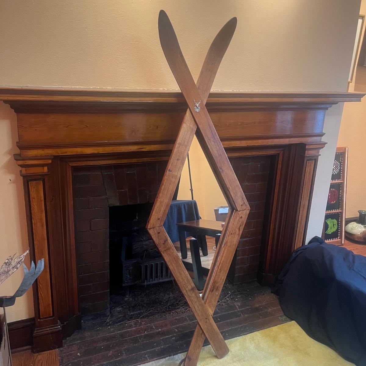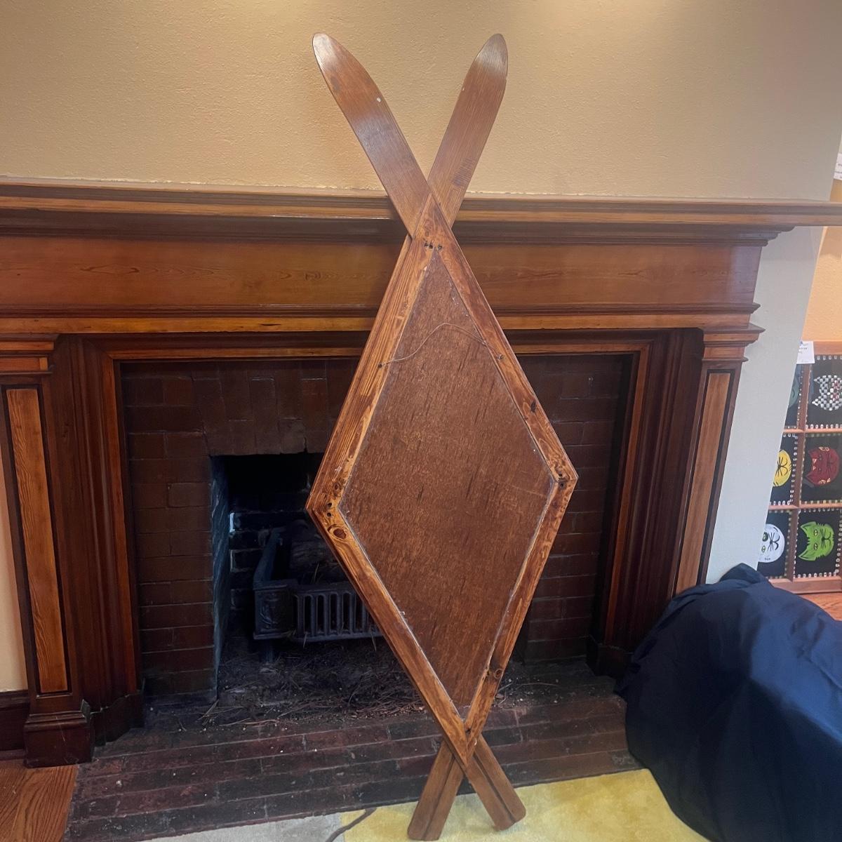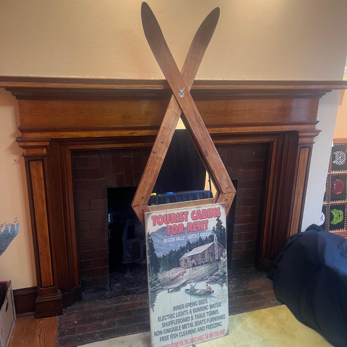 Lot includes a wooden ski mirror and a wooden Maggie Valley sign. Ski mirror measures 24” x 2 x 69”H.