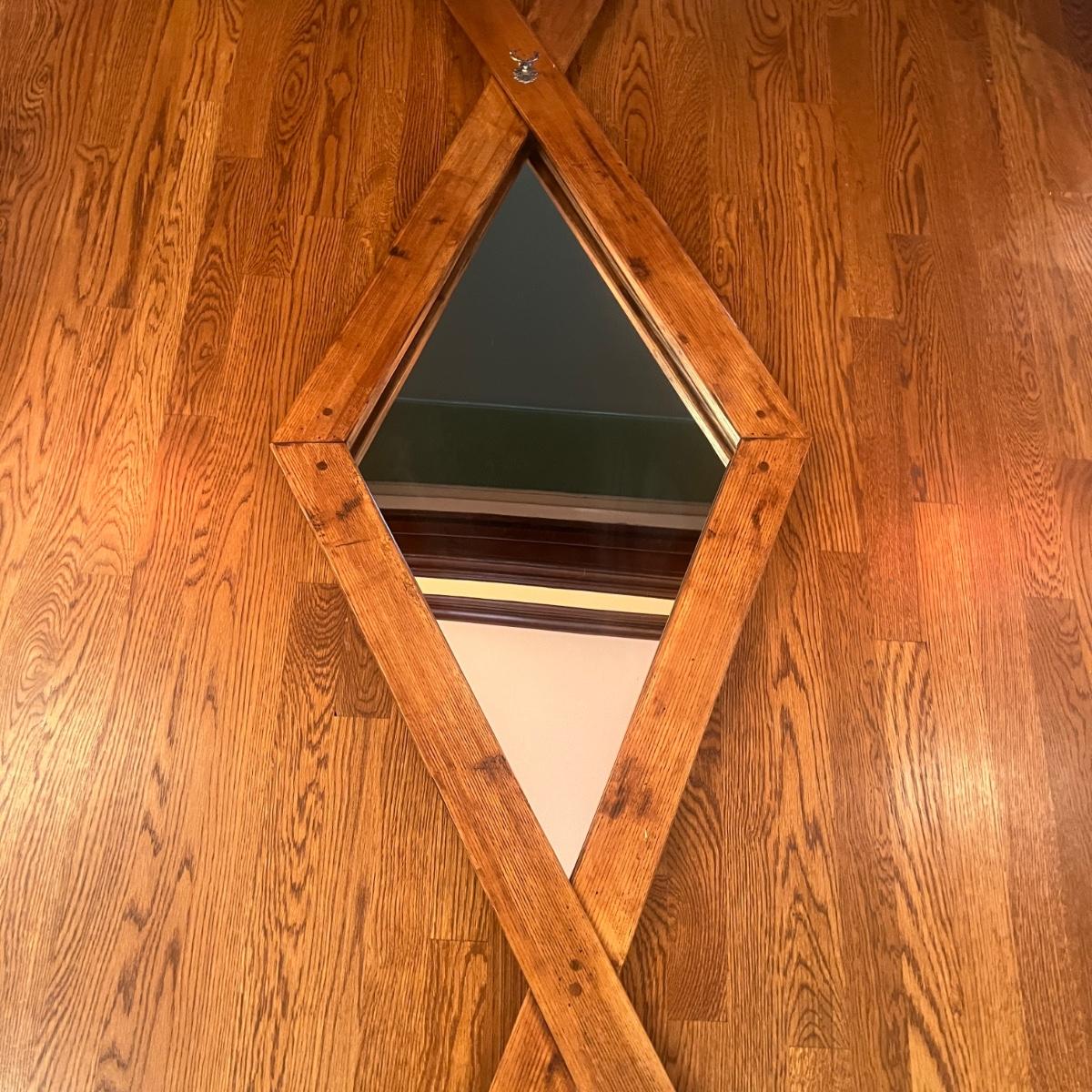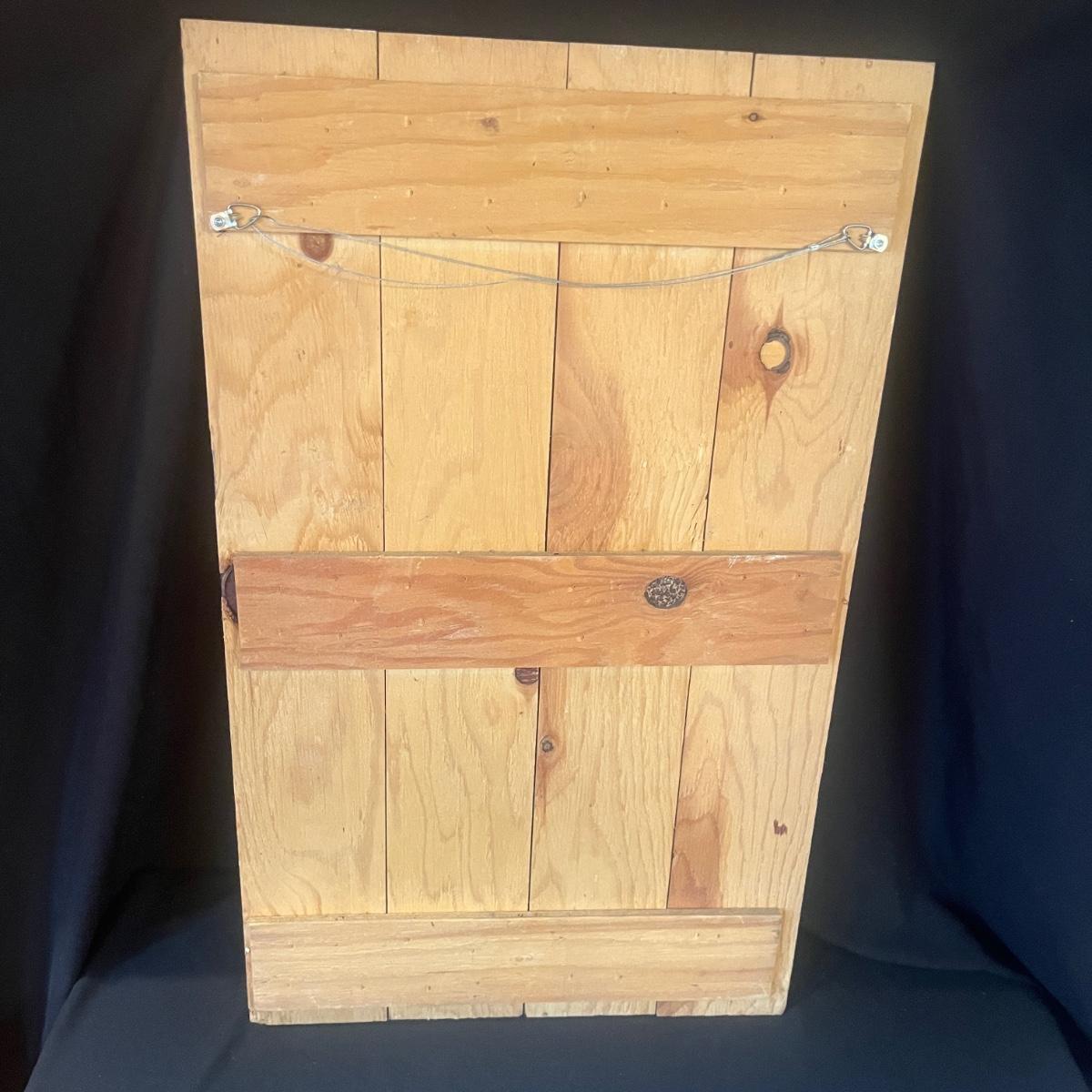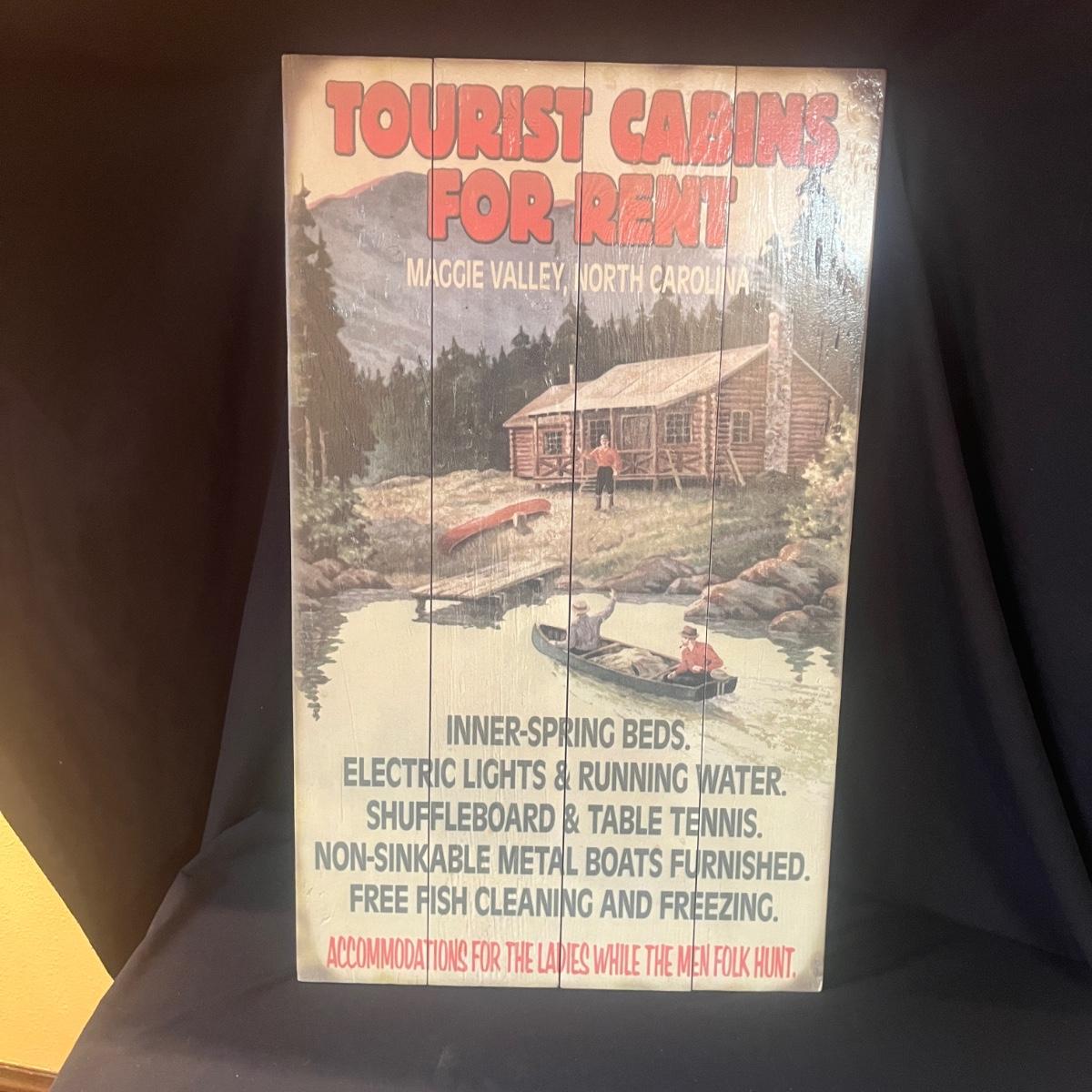 Lot includes a wooden ski mirror and a wooden Maggie Valley sign. Ski mirror measures 24” x 2 x 69”H.