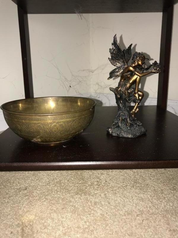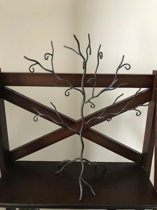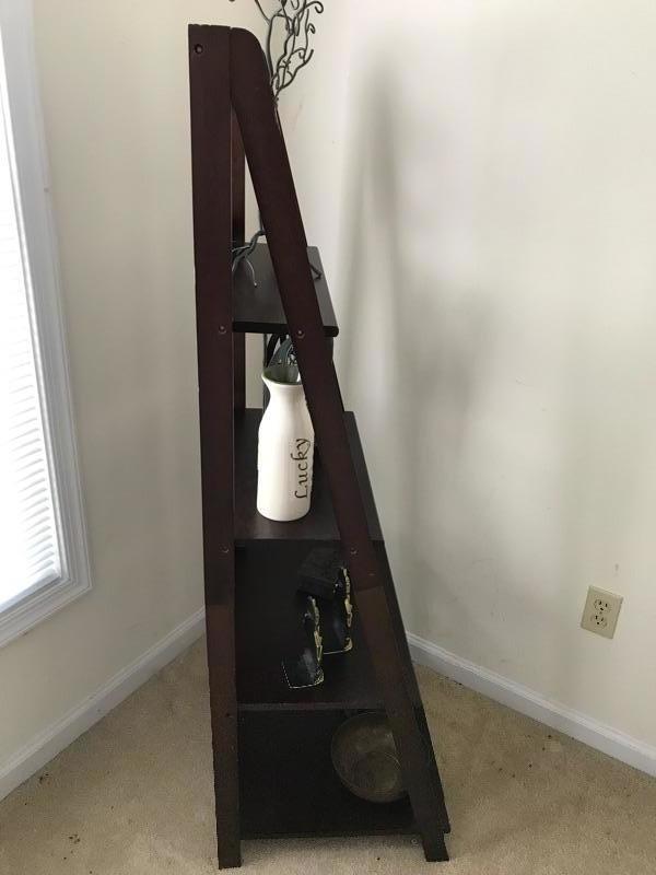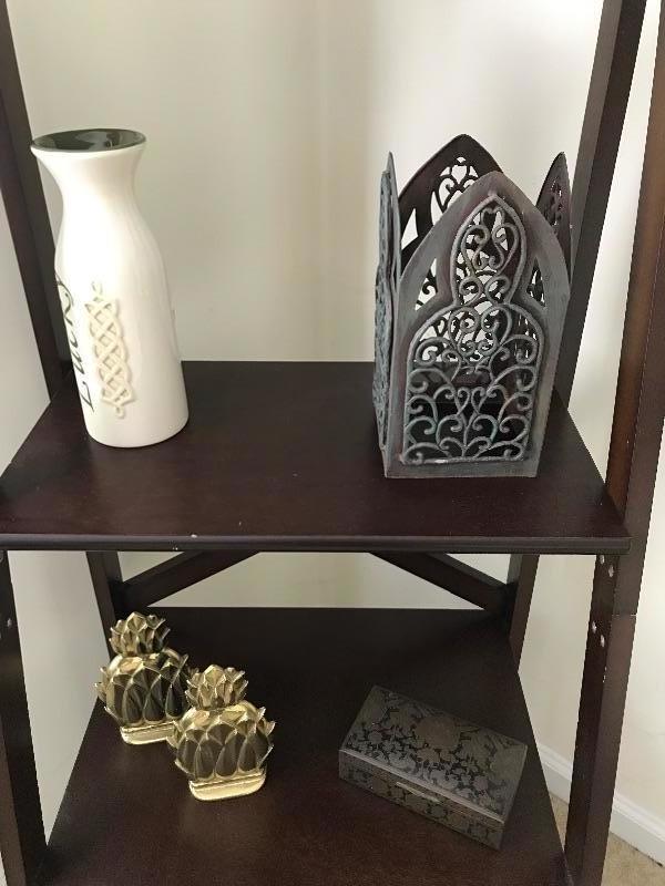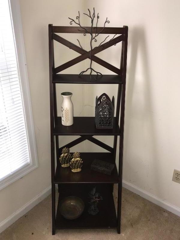 Wooden slanting bookshelf measures 56” tall 20” wide and 7” deep at top and 18” deep at bottom. Jewelry hanging tree, Lucky Irish Vase, metal Candle Holder, Brass Pineapple Bookends by Newport, Small brass box , small brass bowl and fairy figurine